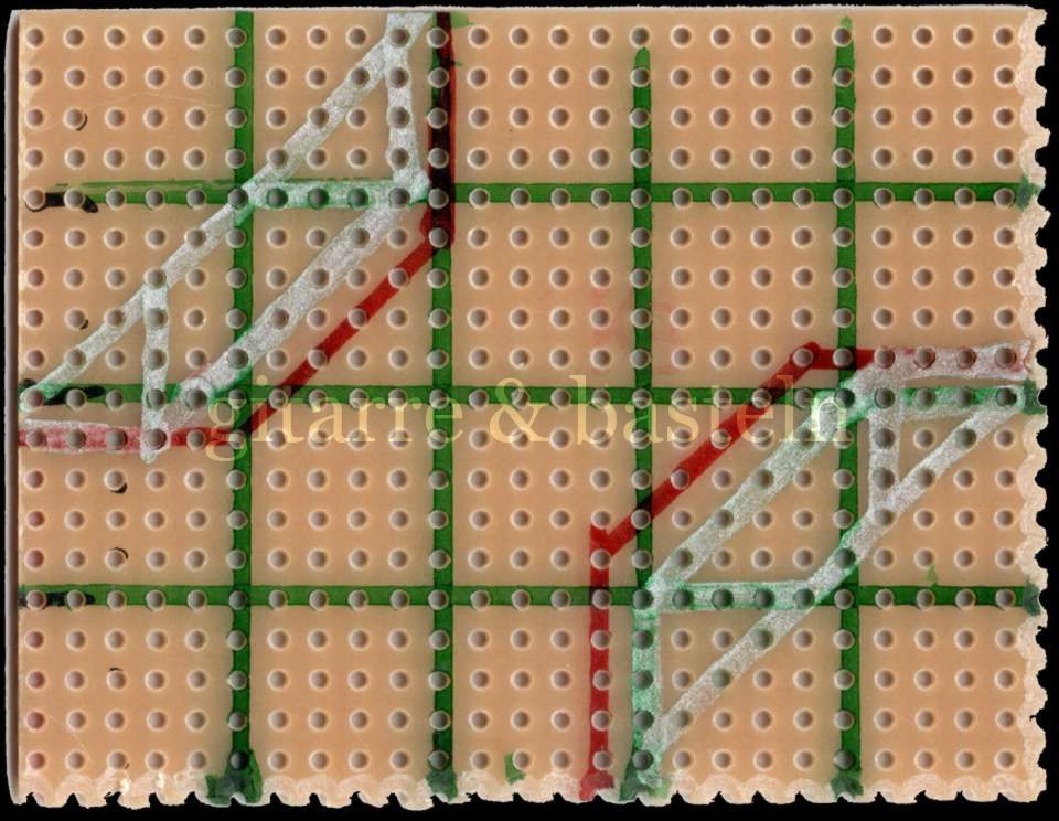 Weitere Planung verlangte die Belegung der Pfostenstecker – es sollte möglich sein, die Schaltung später noch einmal zu verändern, ohne wieder und wieder in der Gitarre und an den Tonabnehmer-Anschlusskabeln herumlöten zu müssen.