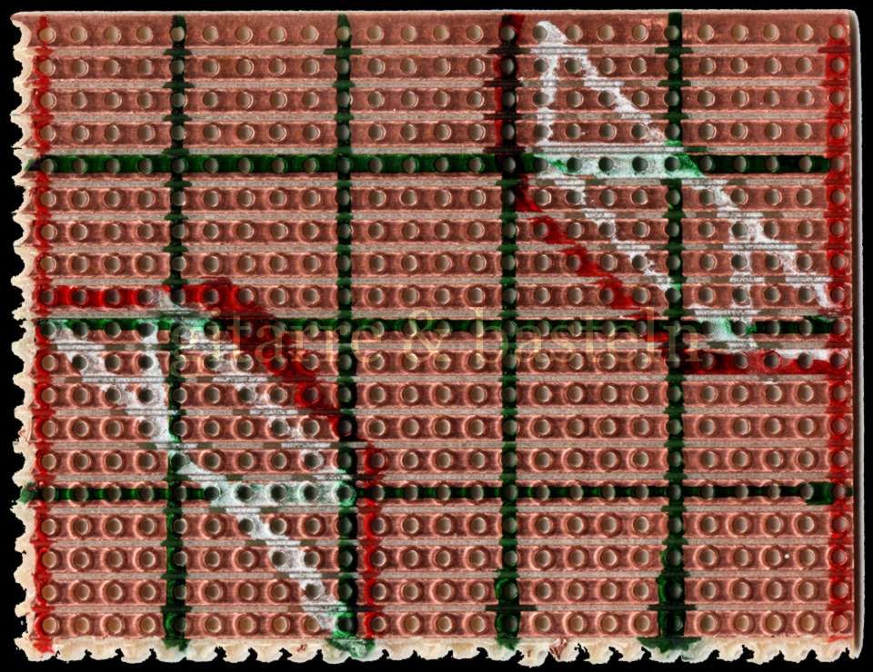 Die Darstellung auf der Kupferseite soll schon etwa die Herstellung der Platinenform verdeutlichen (die Darstellung ist der Einfachheit halber gespiegelt):