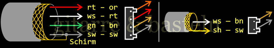 Abb. 5.14: Farbschema der Verbindung der Tonabnehmerkabel mit einem Pfostenstecker (links der Humbucker, rechts der P90).
