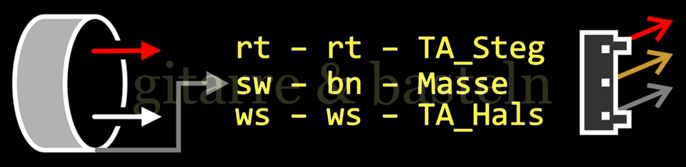 Nach der tabellarischen Darstellung der Anschlüsse zunächst eine Doppelskizze der Anschlüsse vom Tonabnehmerkabel auf die Einzelkabel des Pfostensteckers.