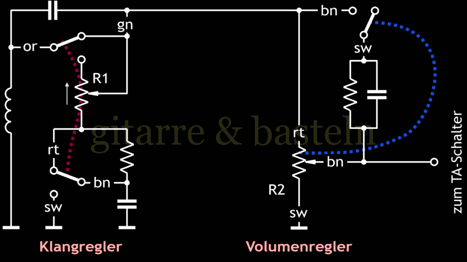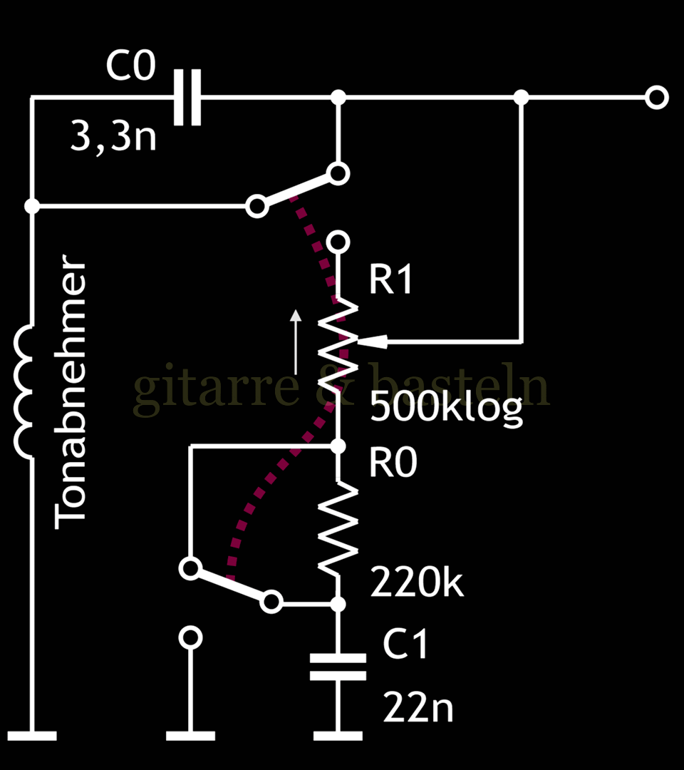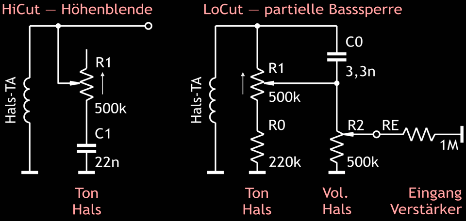 In diesem Falle durchläuft das Signal vom Hals-TA einen Spannungsteiler, bestehend aus dem Tonregler R1 und dem Fußwiderstand R0 sowie mit einem kleinen Kondensator C0 zwischen Schleifer und oberem Anschluss des Tonreglers.
