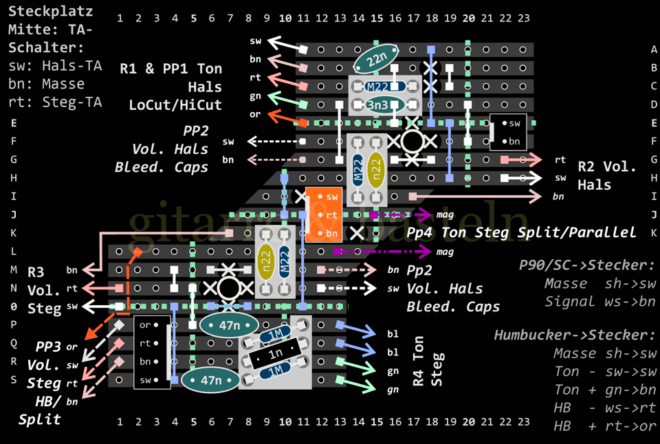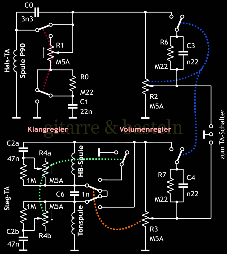 Abb. 5.6: Schaltung der Gitarre mit umschaltbarem Tonregler für den Hals-TA und schaltbarem Humbucker am Steg – alle Push-Pull-Potentiometer in nicht gezogener Stellung.