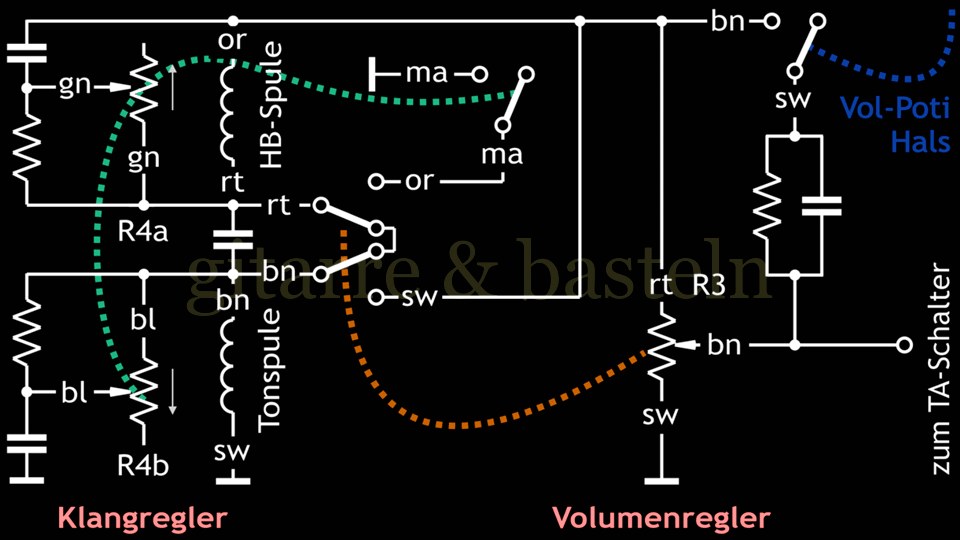 Aus den Farben der Kabel an den Potentiometern können auch in die Pläne der Schaltungen für die beiden Tonabnehmer eingetragen werden – zunächst die Schaltung für den Halstonabnehmer: