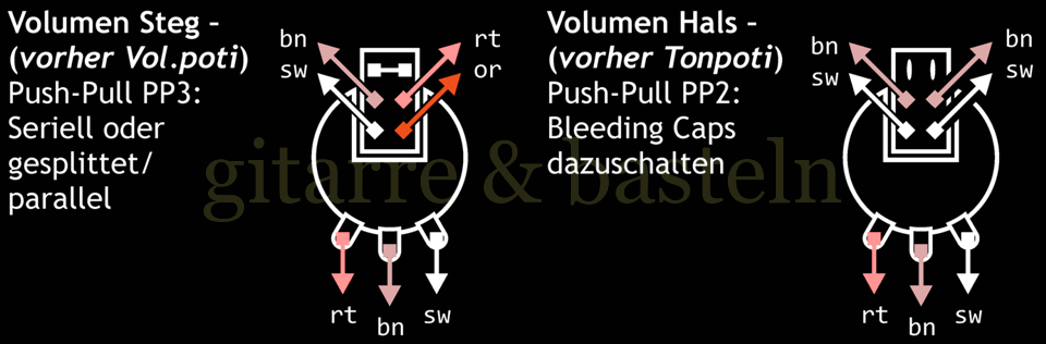 Bei beiden „Potentiometertypen“ (Volumen- und Tonregler) werden die Kontakte, die mit dem Ziehen des Push-Pull-Potentiometers verbunden werden, herausgeführt (Kontakte 1 und 2 sowie 5 und 6); bei den Volumenregler sind die dazu beiden hinteren Kontakte (Kontakte 3 und 4); miteinander verbunden. Übernommen werden können zwei der vorhandenen Potentiometer: