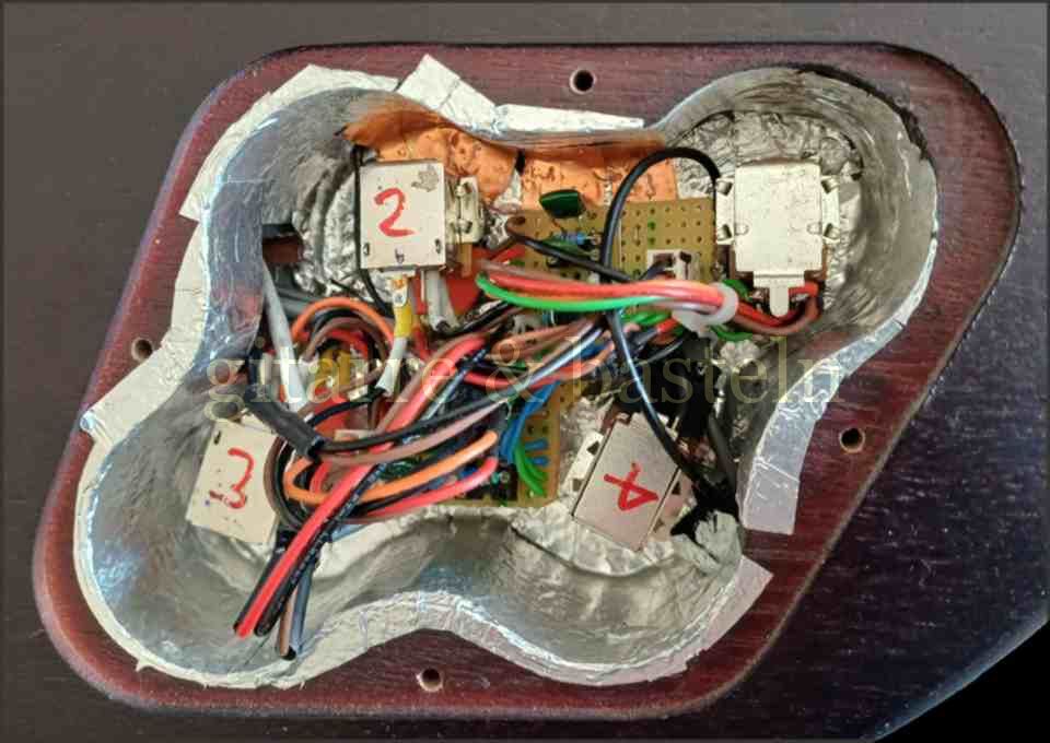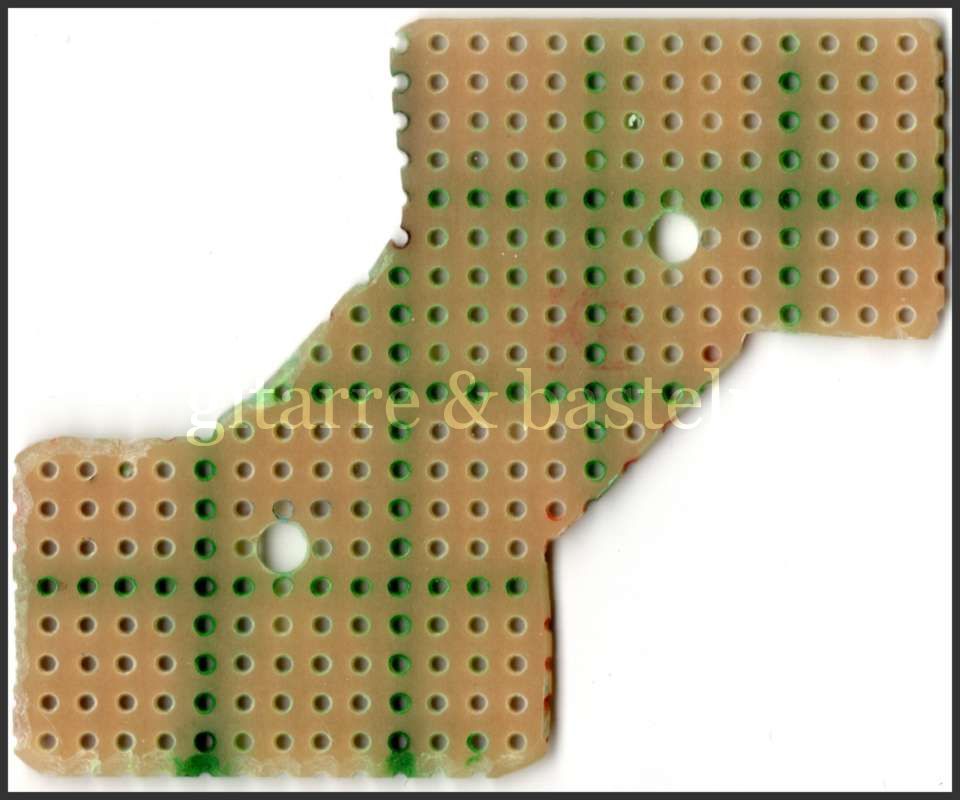 Die merkwürdige Form der Platine ist notwendig, damit die Platine zwischen vier Push-Pull-Potentiometern überhaupt in das E-Fach der Gitarre hineinpasst.