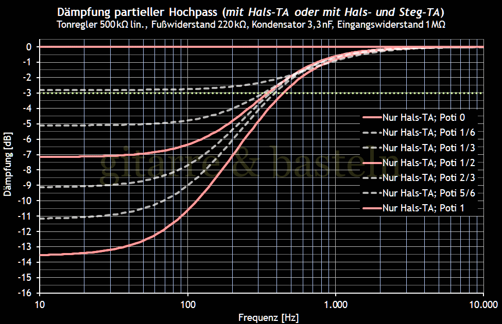 Soweit die Verhältnisse am Bass-Regler und am Hals-Tonabnehmer. Es sei darauf hingewiesen, dass sich die Absenkung beim Zuschalten eines weiteren Tonabnehmers deutlich verstärkt, weil der weitere Tonabnehmer bzw. dessen Beschaltung den Fußwiderstand R0 weitgehend kurzschließt.