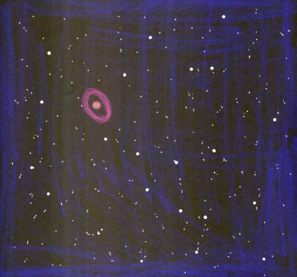 Die gewünschten Farben im Sternenhimmel sind schwarz und dunkelblau sowie weiß, gelb und „rötlich“ – die passenden Komplementärfarben weiß und hellgelb sowie schwarz, blau und „blaugrünlich“. Es wurde also mit Bunt- und Filzstiften auf ein weißes Blatt Papier gezeichnet (linkes Bild).