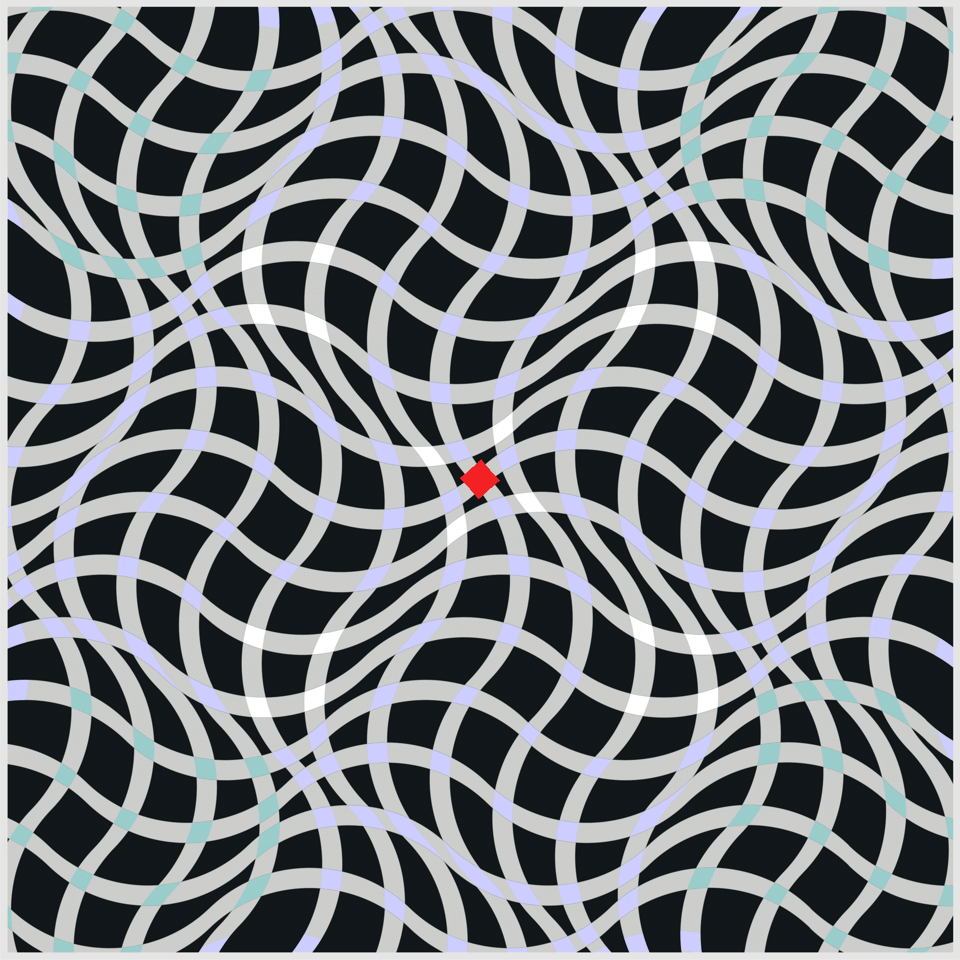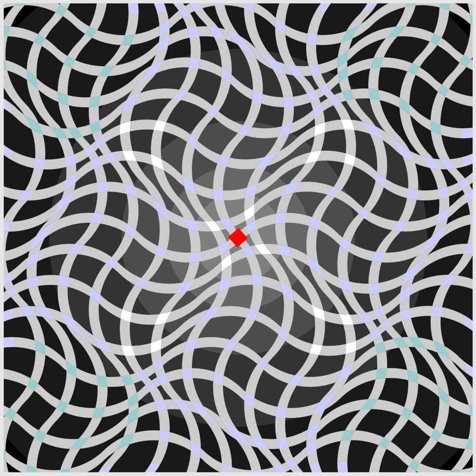 Insgesamt entsteht durch die weißen Aufhellungen eine Art „schwimmendes sich drehendes Kreuz“ mit einem roten Fixpunkt in der Mitte (gemeinsame Fläche der mittleren Kurven) und eine Art eingefärbter Ring in hellblau. (rechtes Bild).