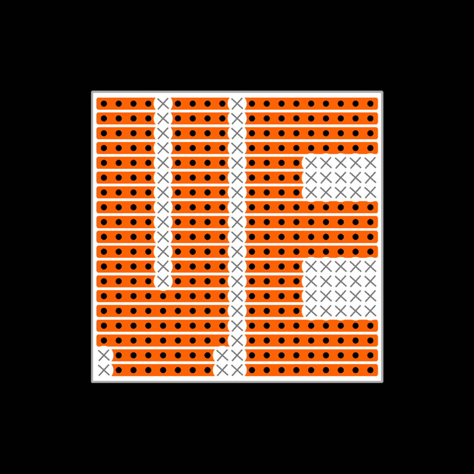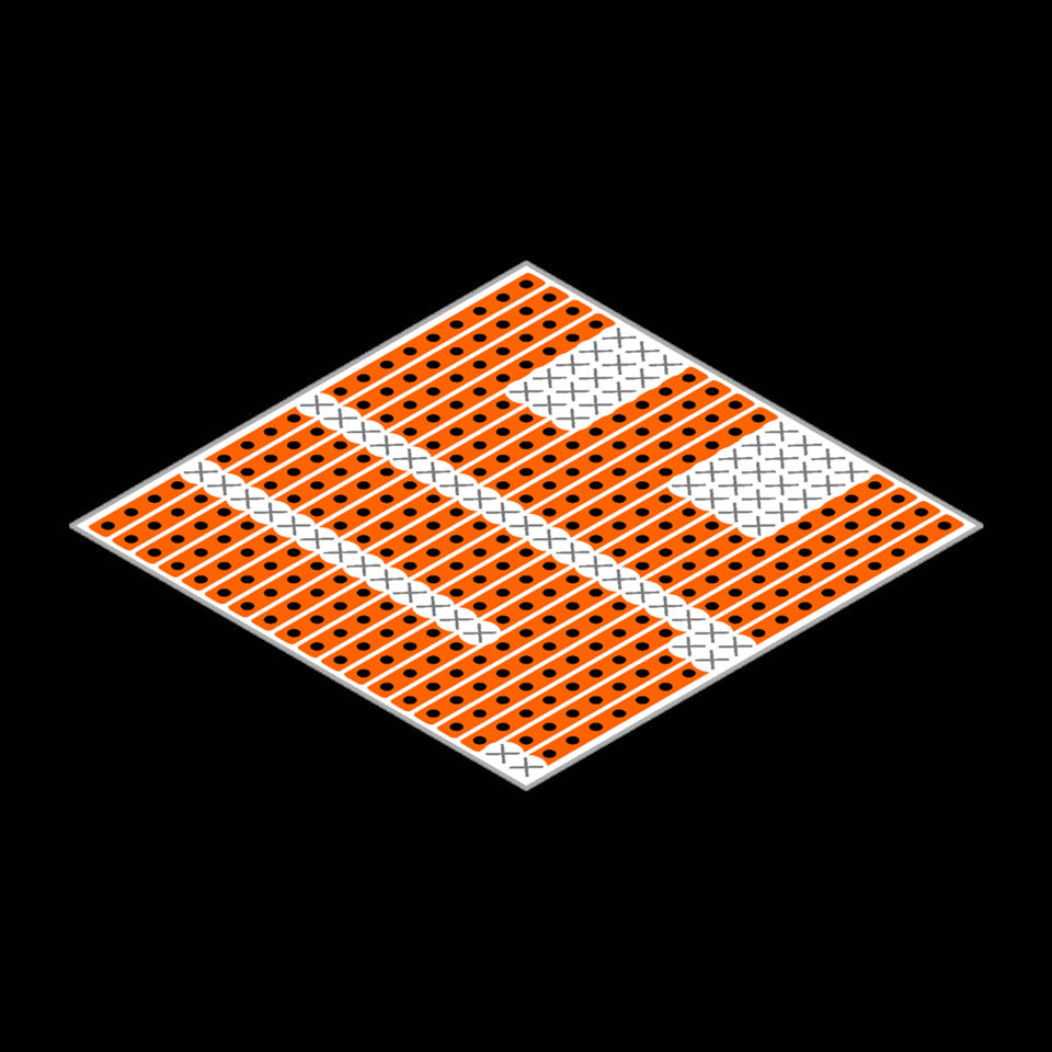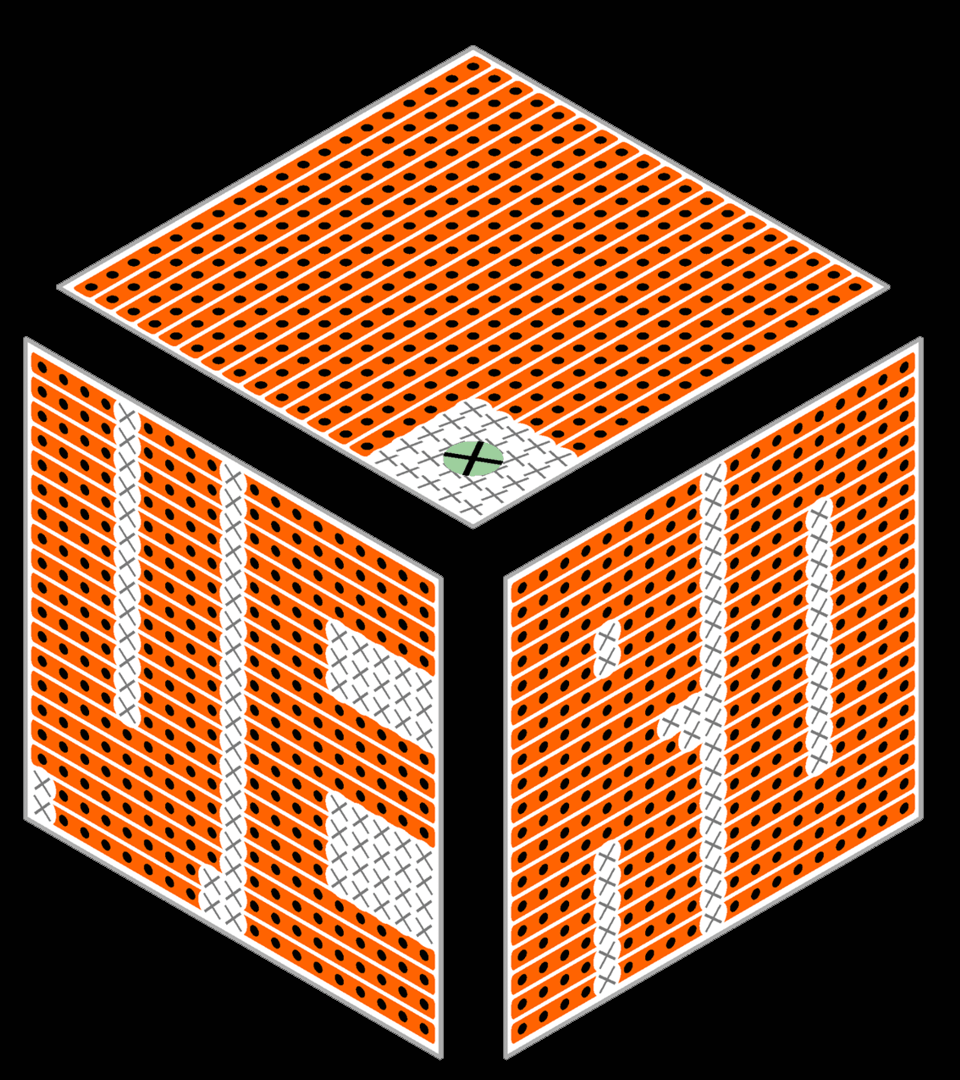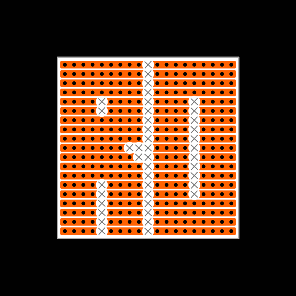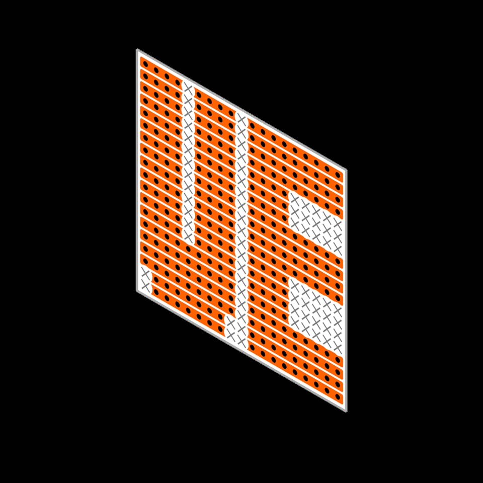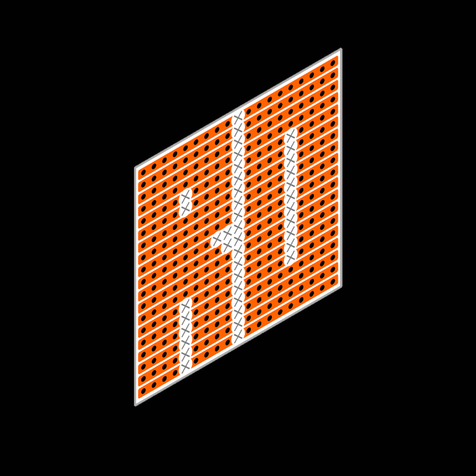 Die quadratische Seitenwand links wird – als quadratische Streifenleiterplatine – in der Draufsicht gezeichnet. Dabei werden an den Bohrungen außerhalb der Buchstaben Cuts gesetzt bzw. das Kupfer entfernt, so dass die Buchstaben „V“ und „E“ als Kupfer stehenbleiben.