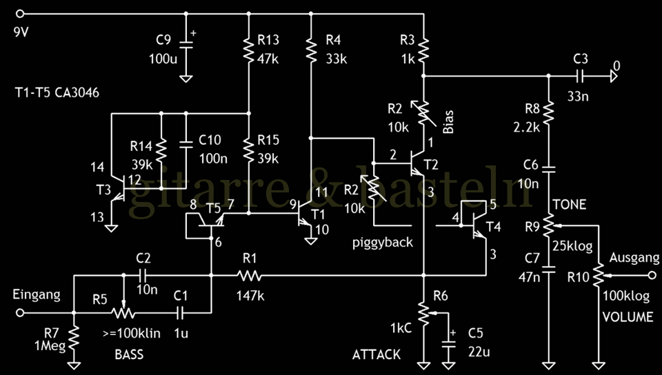 Abb. 3.1: Schaltplan des Fuzz mit einem Transistorarray CA3046 – Grundsätzlichen Idee mit der piggyback-Schaltung für T2 – über T4 und dem zugehörigen Basiswiderstand (Trimmer R2)