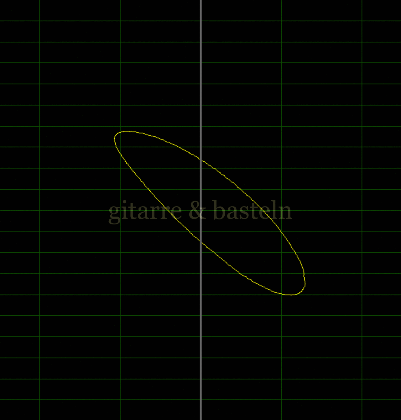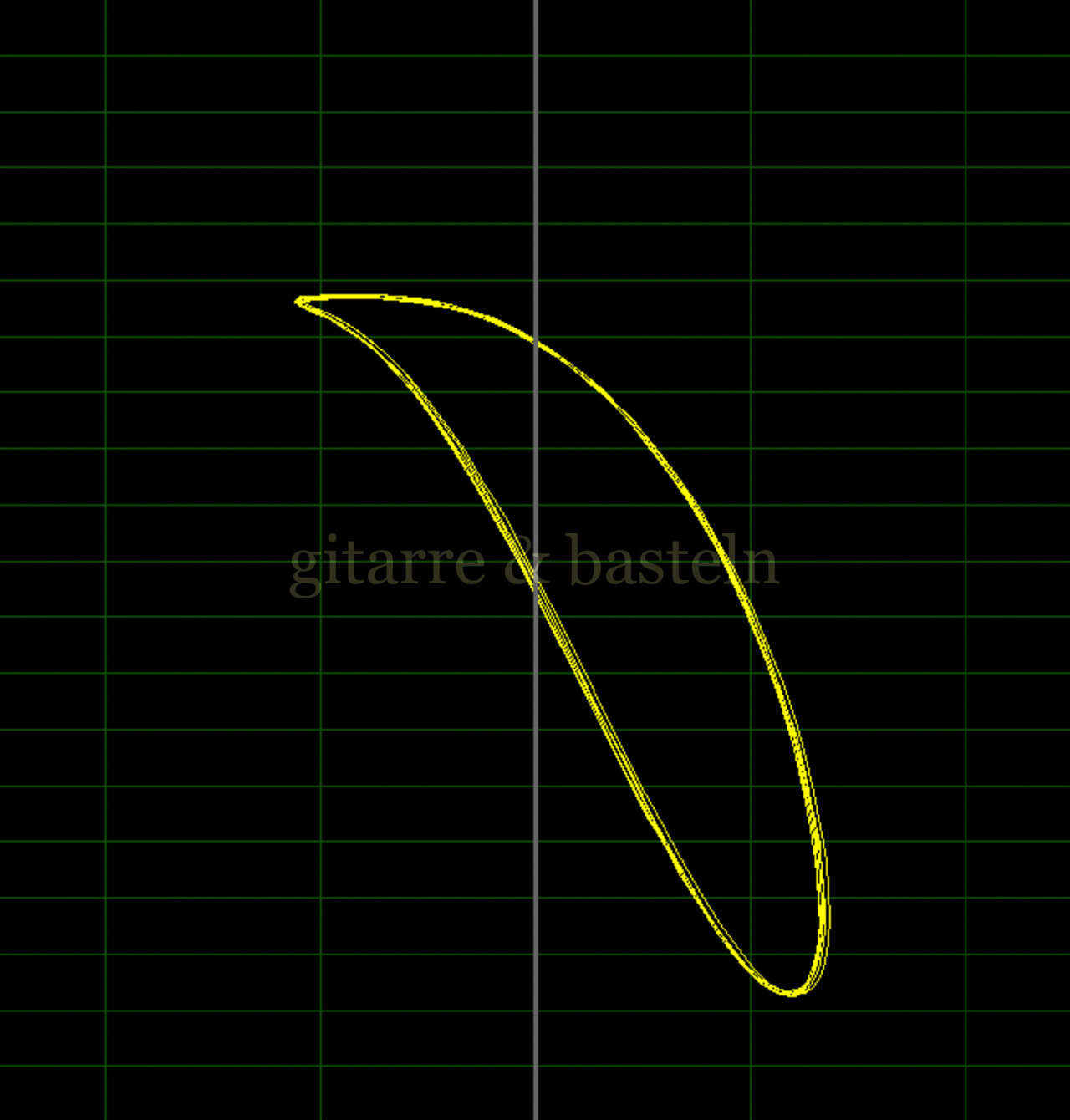 Zurück zu Bildertabelle 1. Bei kleinen Eingangssignalen von etwa 100 mV arbeitet der Booster noch weitestgehend linear. (Die Verschiebung der Lissajous-Figur nach rechts wie auch der damit im Zusammenhang stehende Gleichspannungsoffset des Eingangssignal scheinen von der Software verursacht.) Die elliptische Form der Lissajous-Figur ist in Phasenverschiebungen zwischen Ein- und Ausgang begründet – der Booster arbeitet nicht frequenzlinear, sondern betont die Mitten und Höhen, zieht also die Phase ein wenig nach vorn.