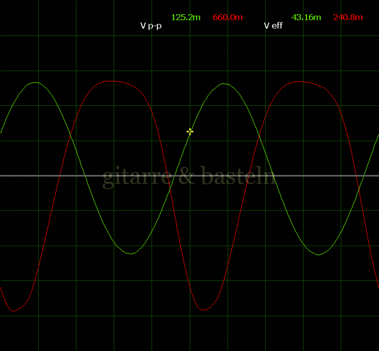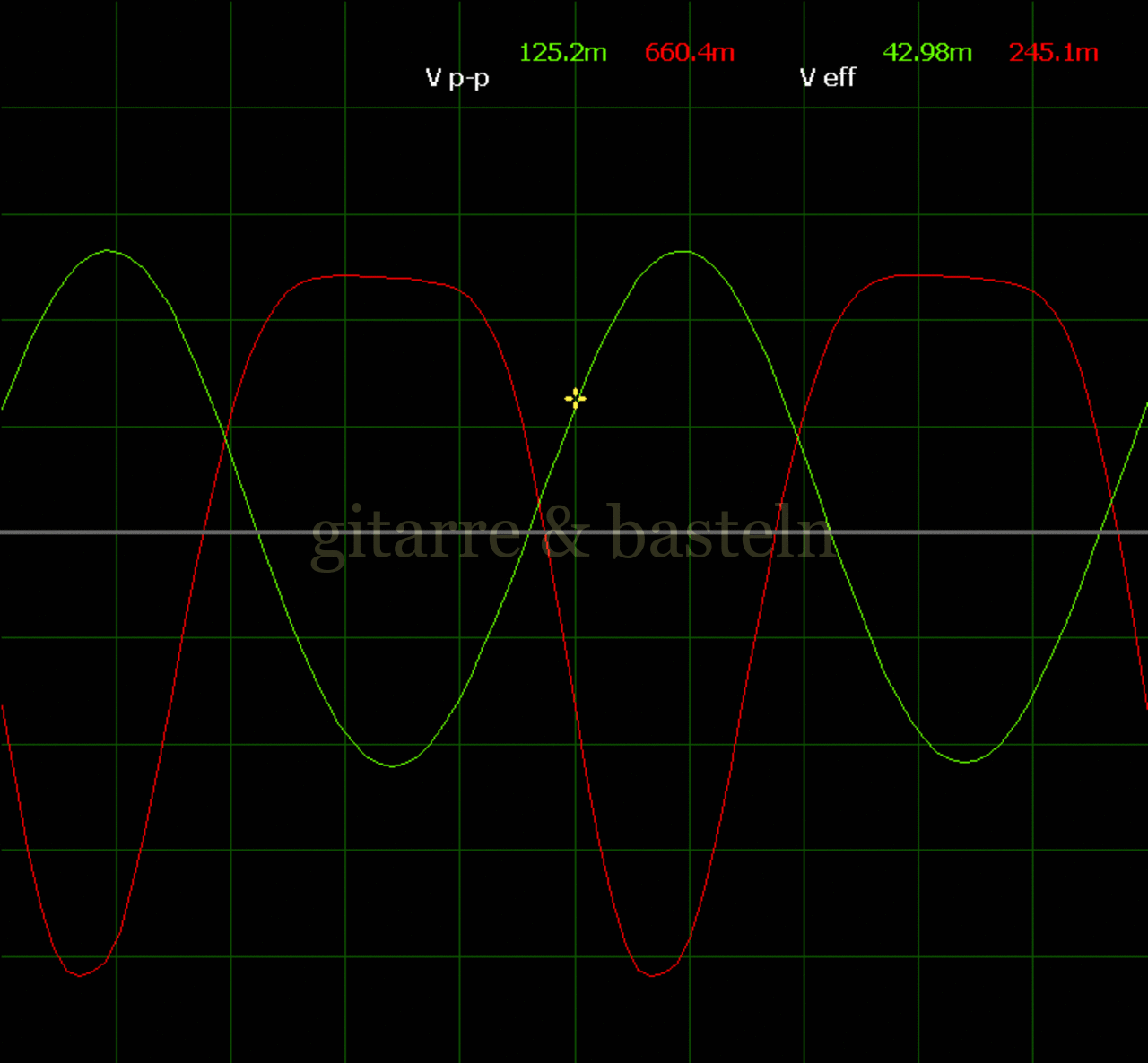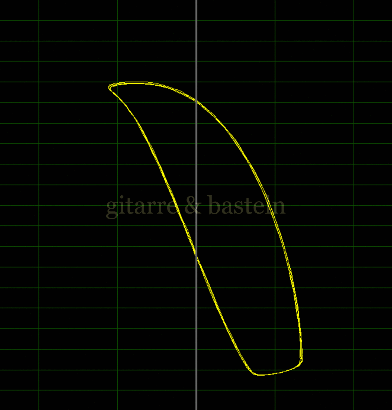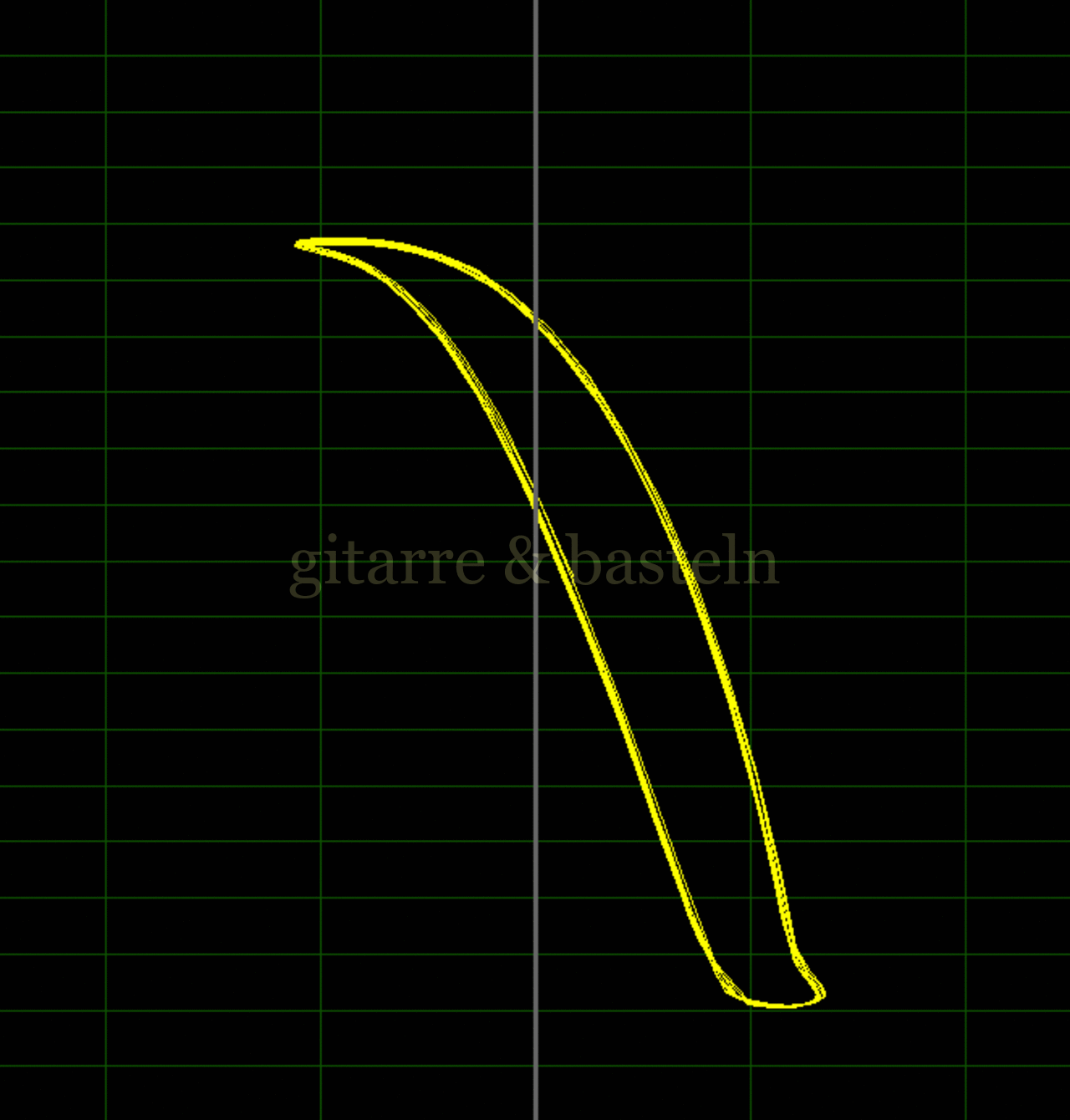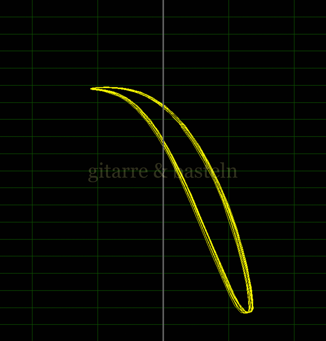 Zum Anderen zeigt die Lissajous-Figur auch, dass das Wachstum oder die Kurvensteilheit des übersteuerten Signals beim Passieren der dicken senkrechten Linie schon erkennbar geringer als am Ende der unteren Halbwelle, d. h. im Bereich kleiner Drainspannungen in Richtung Sättigung des FET. Um es kurz zu machen: Es sieht so aus, dass der Arbeitspunkt bzw. die Ruhespannung am Drain mit einem Drainwiderstand von 8,2 kΩ zu hoch gewählt wurde, so dass die Eingangsstufe laute Signale nicht nur (asymmetrisch) begrenzt – vielmehr steht zu befürchten, dass der Booster die Signale auch zu stark „verbiegt“.