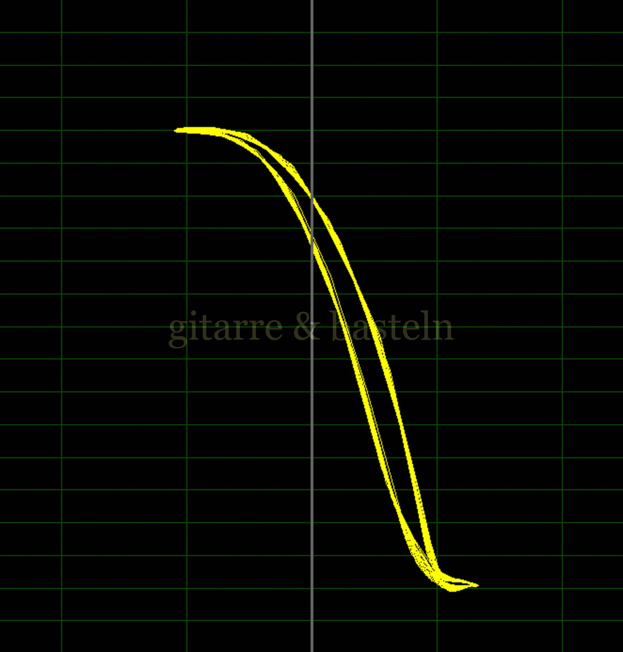 Auffallend sind, neben der leichten symmetrischen Kennlinienkrümmung und weichen Begrenzung bei geringem Gain, die Spitzen im Eingangssignal bei maximalem Gain.