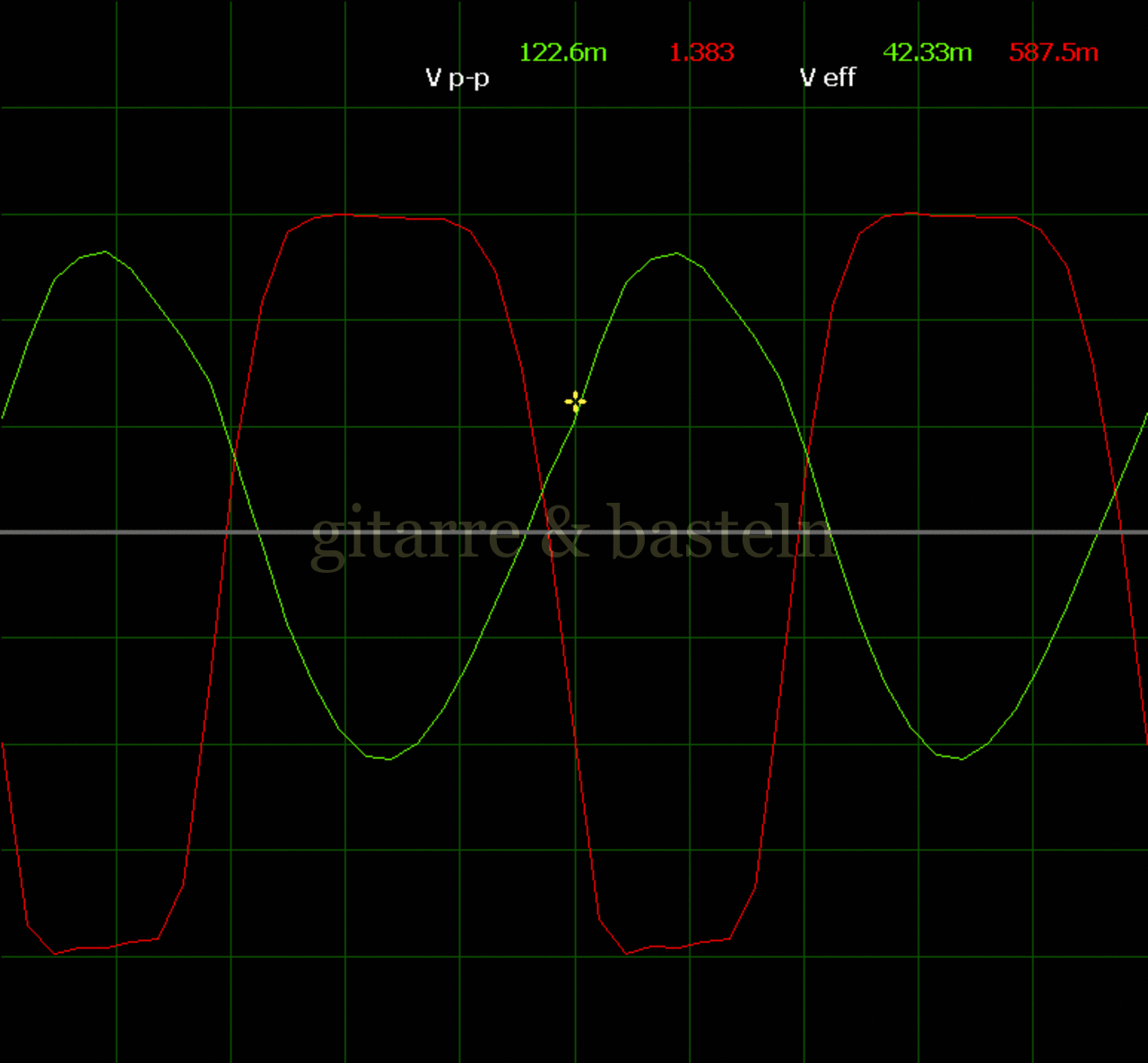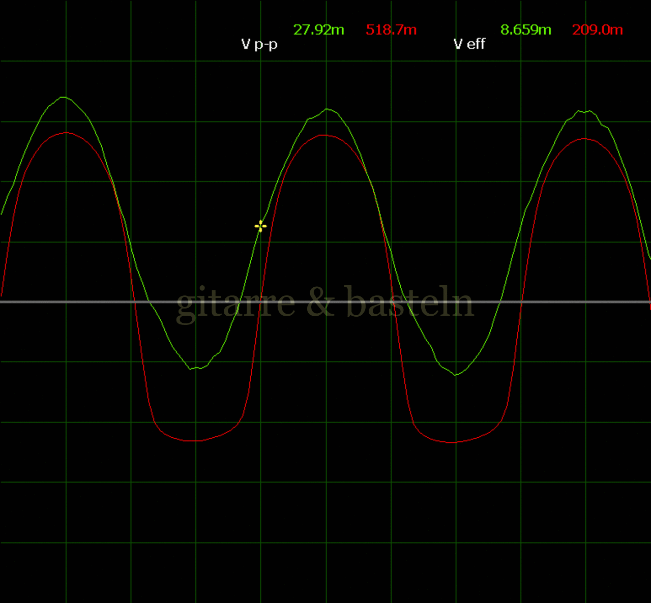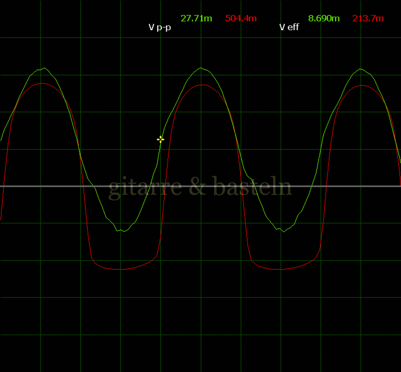 Das Ganze wurde während des Aufbaus dieses Effektgerätes mit einem „Software-Oszilloskop“ (Oszilloskop über die Soundkarte) untersucht – die Platine des Red Llama wurde von einem Signalgenerator mit einem gitarreüblichen Pegel (etwa 150 mV bis 200 mV) angesteuert und Oszillogramm des Ausgangssignals sowie die Lissajous-Figur von Ausgangs- gegen Eingangssignal bei verschiedenen Einstellungen des Gain-Reglers (und einer Betriebsspannung des Red Llama etwa 9 V) sowie auch bei verschiedenen Betriebsspannungen (und einer Gain-Einstellung der ersten Stufe von etwa 2,8 – P1b etwa 180 kΩ) aufgenommen.