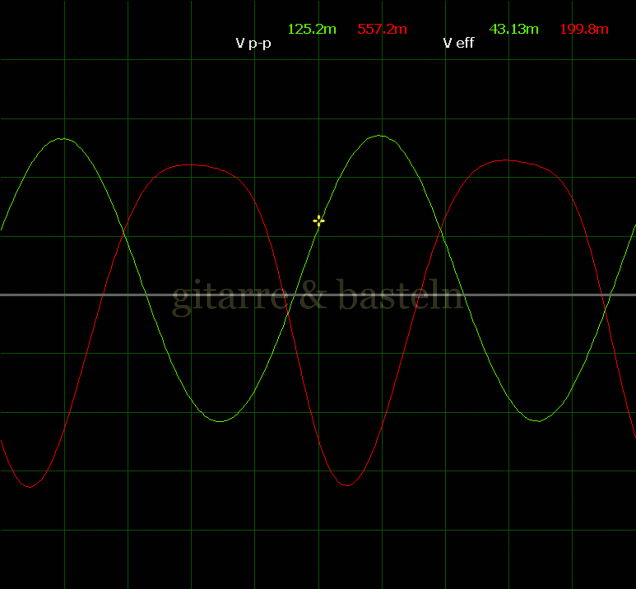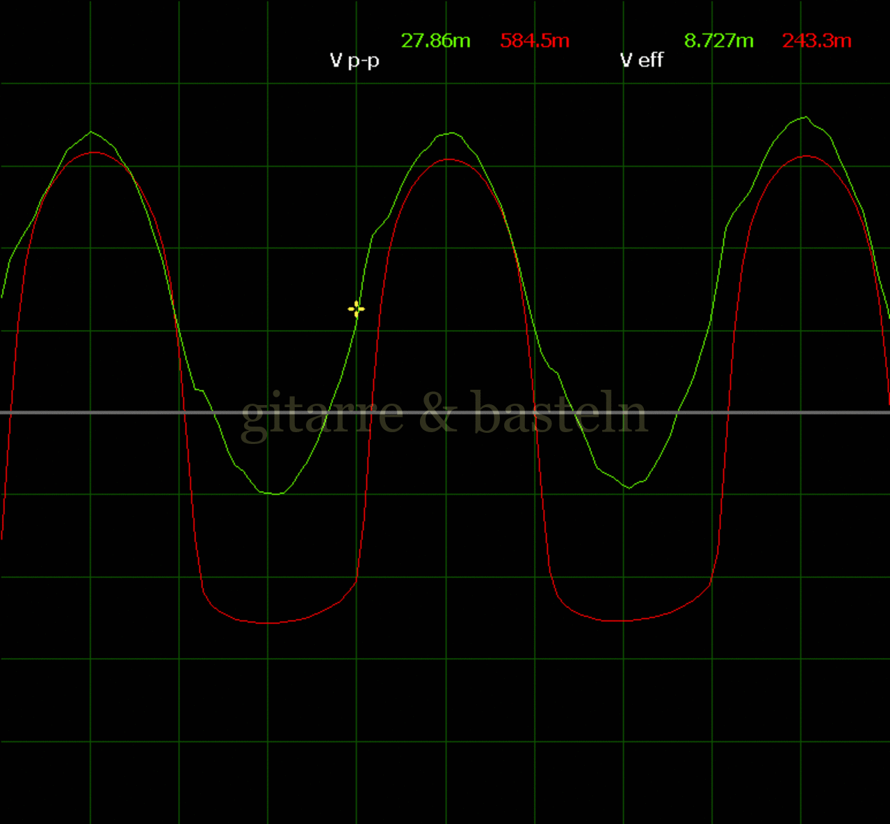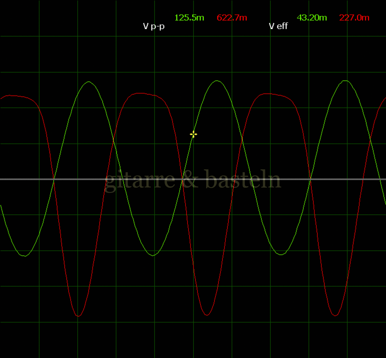 Das Ganze wurde während des Aufbaus dieses Effektgerätes mit einem „Software-Oszilloskop“ (Oszilloskop über die Soundkarte) untersucht – die Platine des Red Llama wurde von einem Signalgenerator mit einem gitarreüblichen Pegel (etwa 150 mV bis 200 mV) angesteuert und Oszillogramm des Ausgangssignals sowie die Lissajous-Figur von Ausgangs- gegen Eingangssignal bei verschiedenen Einstellungen des Gain-Reglers (und einer Betriebsspannung des Red Llama etwa 9 V) sowie auch bei verschiedenen Betriebsspannungen (und einer Gain-Einstellung der ersten Stufe von etwa 2,8 – P1b etwa 180 kΩ) aufgenommen.