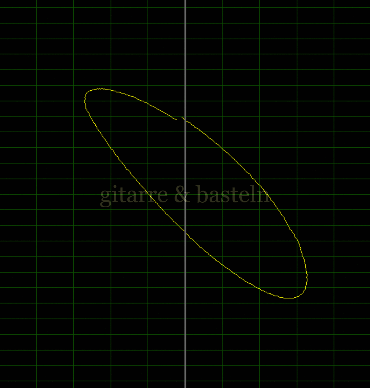 Mit den Verhältnissen am Drain hat das aber nichts zu tun. Wo der Arbeitspunkt am Drain ungefähr liegen muss, lässt sich abschätzen, wenn man schaut, wo das Ausgangssignal „liegt“, wenn das (unverzerrte) Eingangssignal durch null geht bzw. wo die Lissajous-Figur den dicken senkrechten Strich passiert Im Oszilloskop kann man zum Einen erkennen, dass diese beiden Punkte im Ausgangssignal weit oberhalb der der breiten Mittellinie liegen, die Drainspannung im Arbeitspunkt liegt also höher als bei zwei Dritteln des Aussteuerungsbereiches.