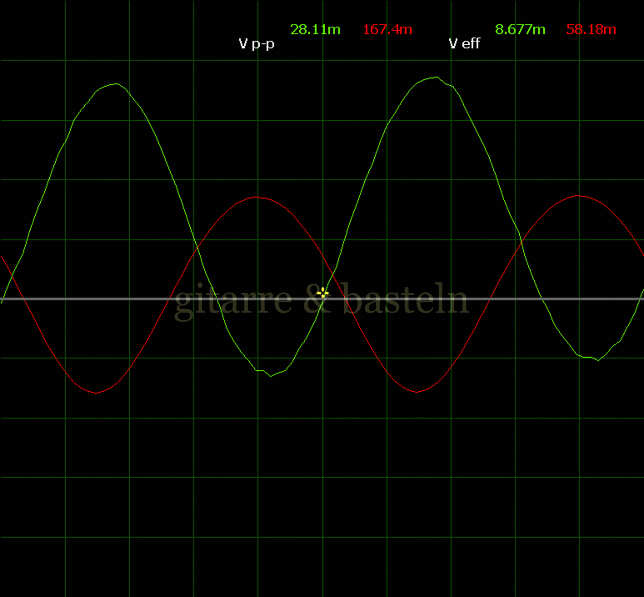 Da der vom Autor mit einem Software-Oszilloskop verwendete Signalgenerator einen relativ hohen Ausgangswiderstand von etwa 1 kΩ hat (hinter den Ausgangstreibern – „normale“ Operationsverstärker TL072 – liegen relativ große Schutzwiderstände, siehe den Artikel über den Soundkartentreiber), liegt das eigentliche Sinussignal sozusagen „im Inneren des Signalgenerators“ – in den Oszillogrammen kann nur ein Eingangssignal „zwischen“ dem eigentlichen Sinussignal und dem Ausgang des Red Llama dargestellt werden, auf dem dann die kurzen schnellen Ströme zum Umladen des Kondensator aufgeprägt werden.