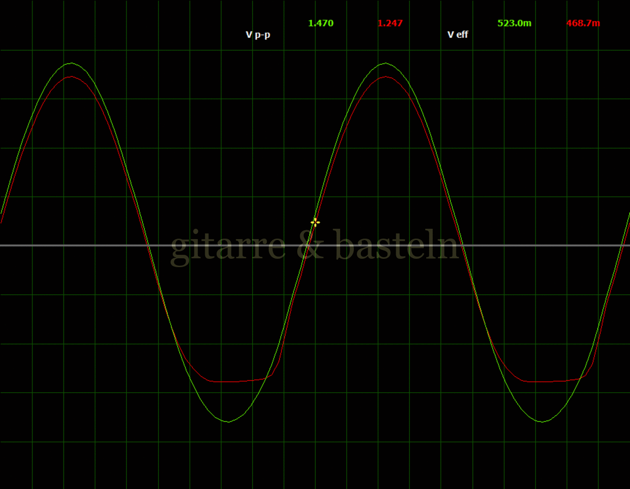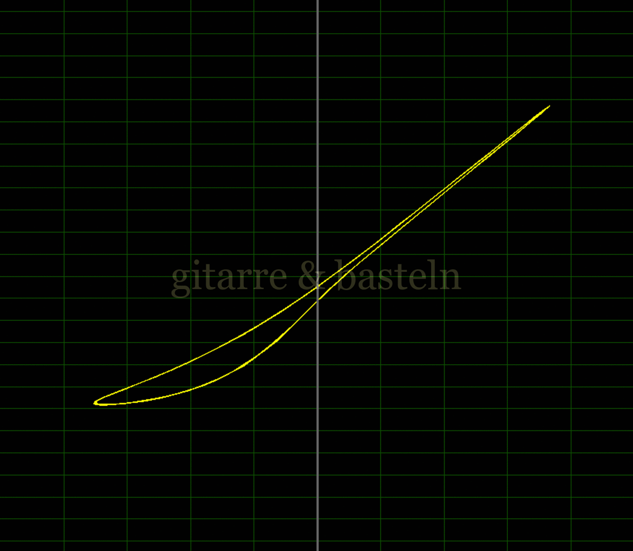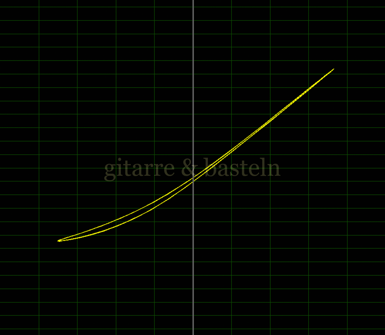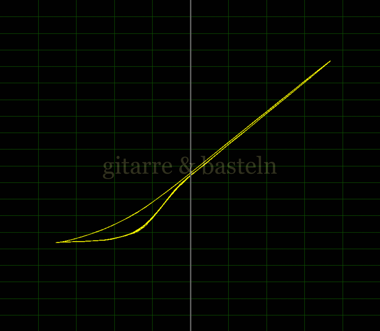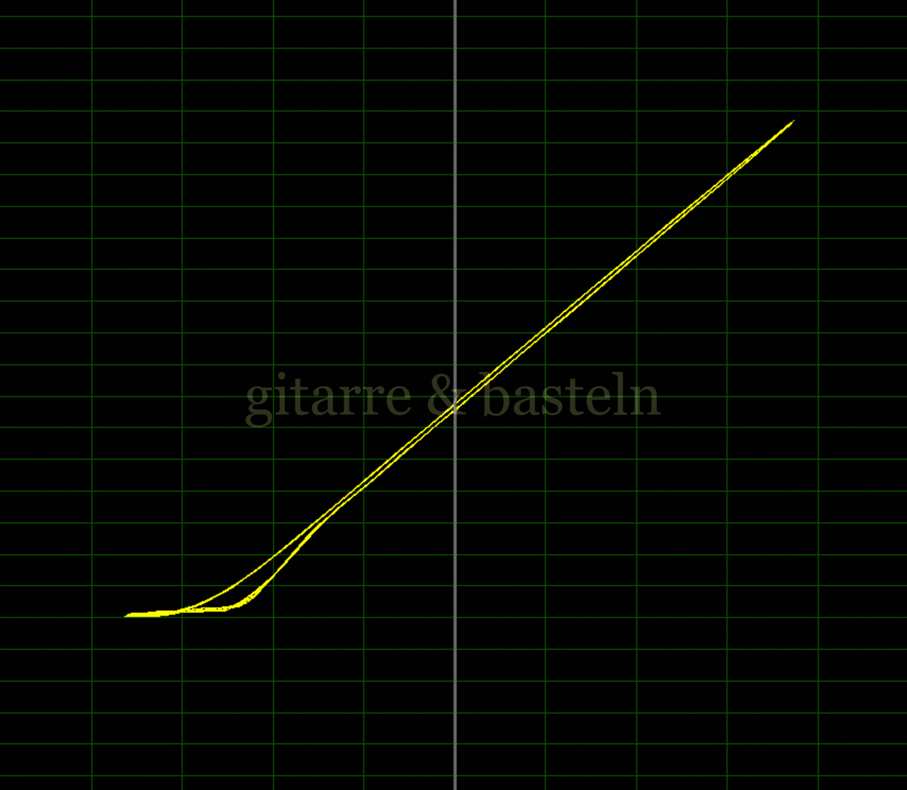 Im zweiten Messaufbau wurde, zunächst eher aus Daffke (bevor die Überlegungen im vorherigen Kapitel ausgearbeitet waren), eine Siliziumdiode 1N4148 zwischen den Emitter des Transistors und Masse eingefügt (sieheAbbildung B.2) und der Speisewiderstand für den Basisruhestrom von 56 kΩ auf 100 kΩ erhöht. Dahinter stand die Überlegung, man könnte durch das Einfügen der Diode den Eingangswiderstand der Schaltung erhöhen (der differentielle Widerstand der Diode erscheint, multipliziert mit dem Stromverstärkungsfaktor des Transistors, an der Basis) und ihre Verstärkung verringern (die differentiellen Widerstände der Diode und der Basis-Emitter-Strecke des Transistors bilden einen Spannungsteiler), ohne die statische Kennlinie durch eine lineare Gegenkopplung zu linearisieren. Das heißt, es ging darum, eine Schaltung zu erhalten, die bei etwa doppelten Eingangssignalspannungen und gleichen Eingangssignalströmen vergleichbar der ersten Messschaltung reagiert – gedacht als möglicher Treblebooster für Humbucker.