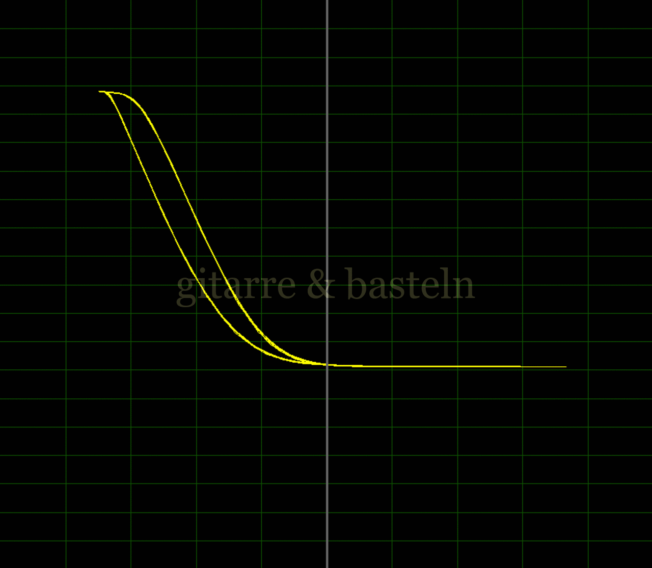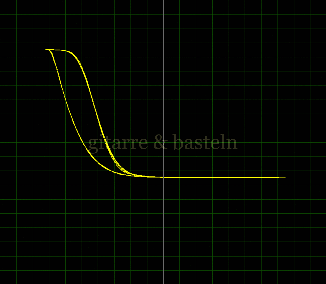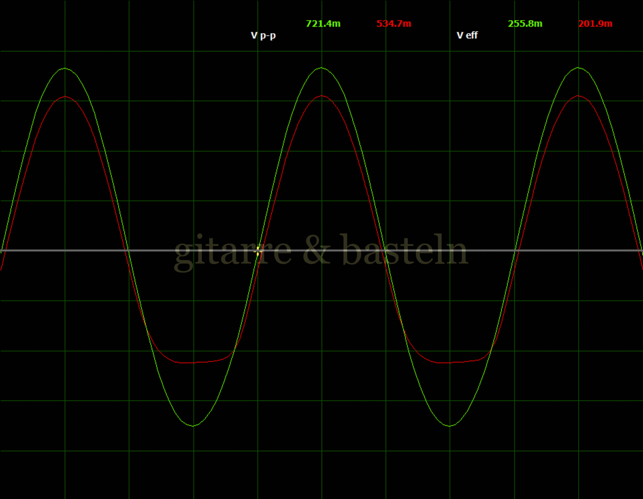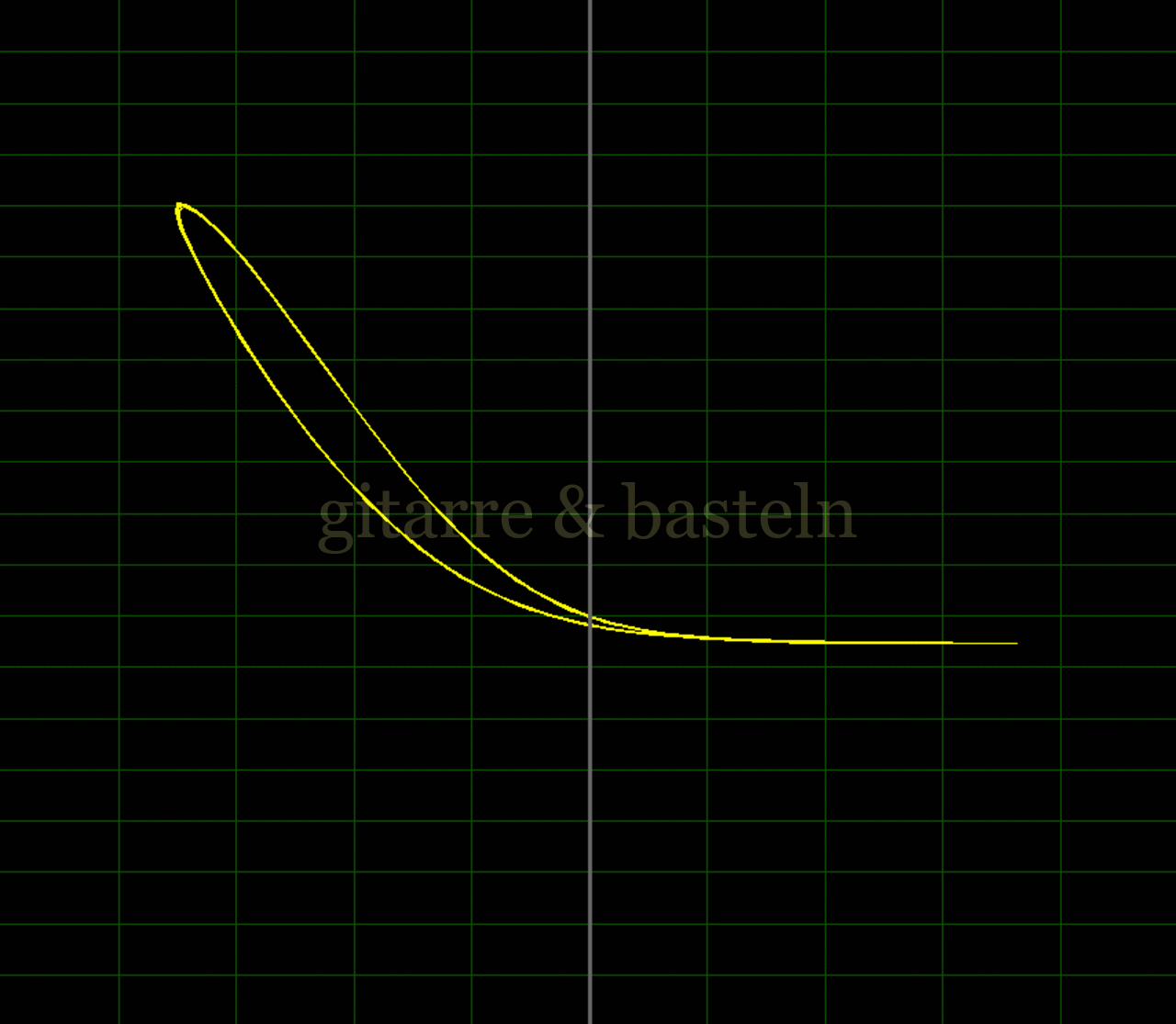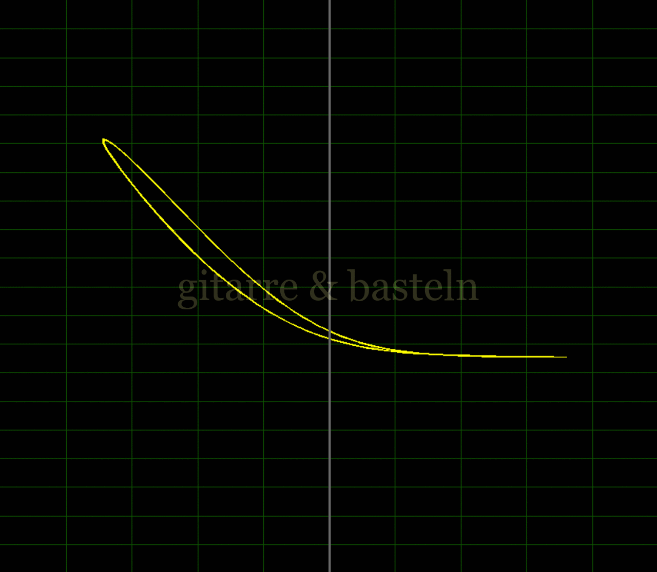Im zweiten Messaufbau wurde, zunächst eher aus Daffke (bevor die Überlegungen im vorherigen Kapitel ausgearbeitet waren), eine Siliziumdiode 1N4148 zwischen den Emitter des Transistors und Masse eingefügt (sieheAbbildung B.2) und der Speisewiderstand für den Basisruhestrom von 56 kΩ auf 100 kΩ erhöht. Dahinter stand die Überlegung, man könnte durch das Einfügen der Diode den Eingangswiderstand der Schaltung erhöhen (der differentielle Widerstand der Diode erscheint, multipliziert mit dem Stromverstärkungsfaktor des Transistors, an der Basis) und ihre Verstärkung verringern (die differentiellen Widerstände der Diode und der Basis-Emitter-Strecke des Transistors bilden einen Spannungsteiler), ohne die statische Kennlinie durch eine lineare Gegenkopplung zu linearisieren. Das heißt, es ging darum, eine Schaltung zu erhalten, die bei etwa doppelten Eingangssignalspannungen und gleichen Eingangssignalströmen vergleichbar der ersten Messschaltung reagiert – gedacht als möglicher Treblebooster für Humbucker.