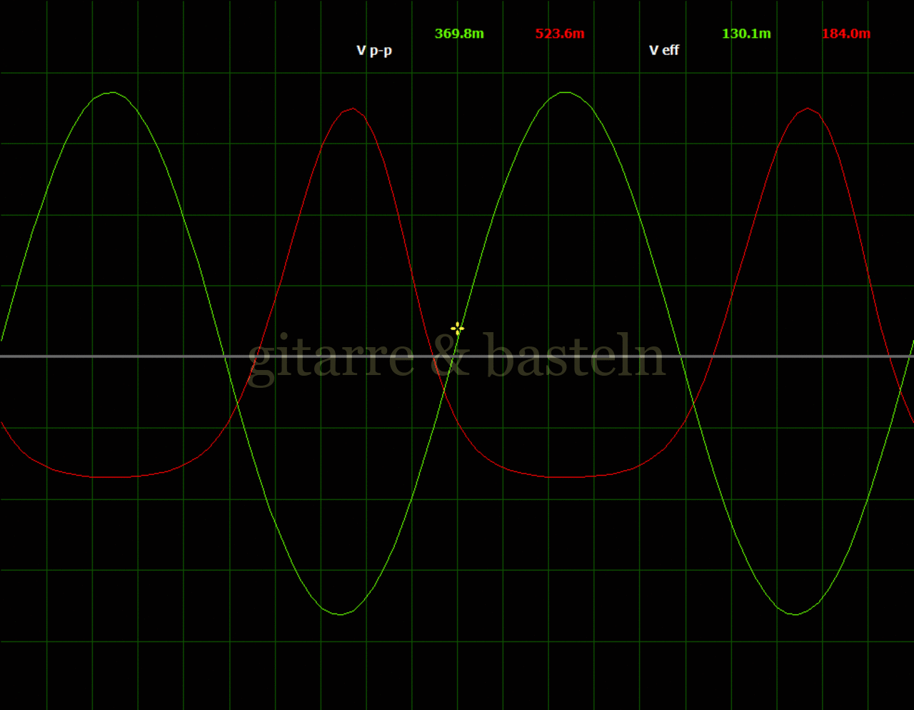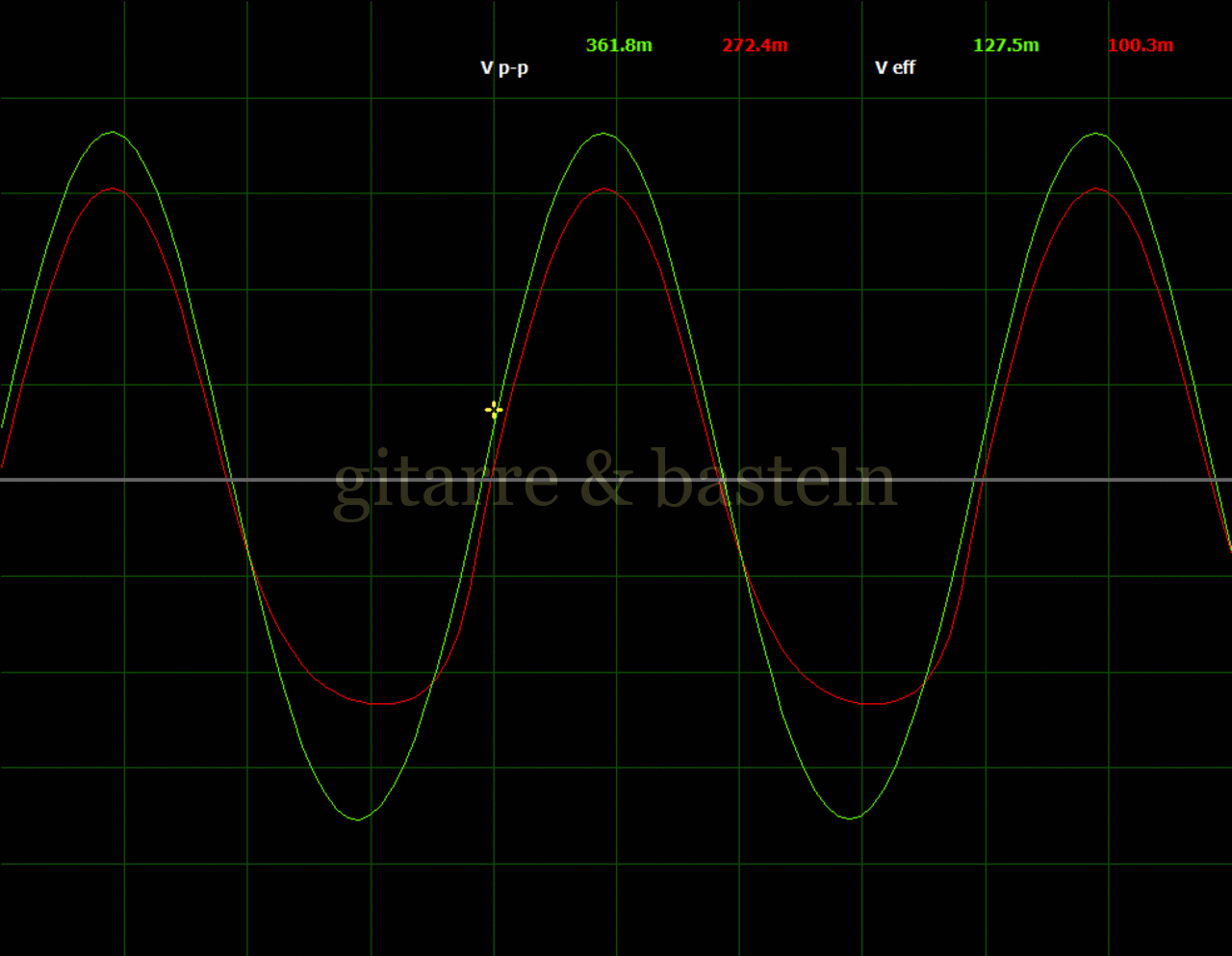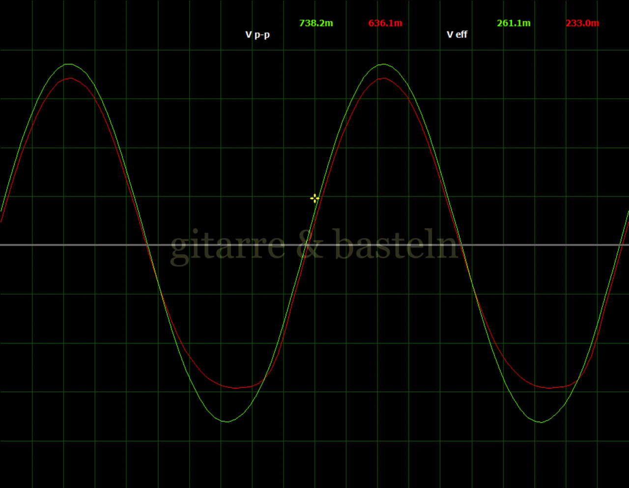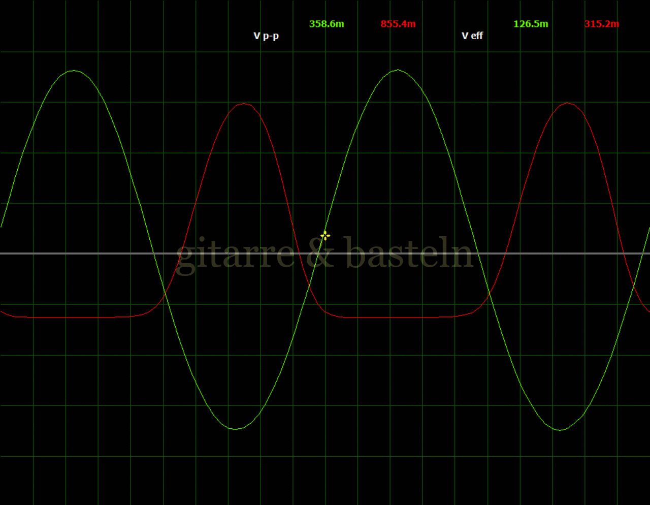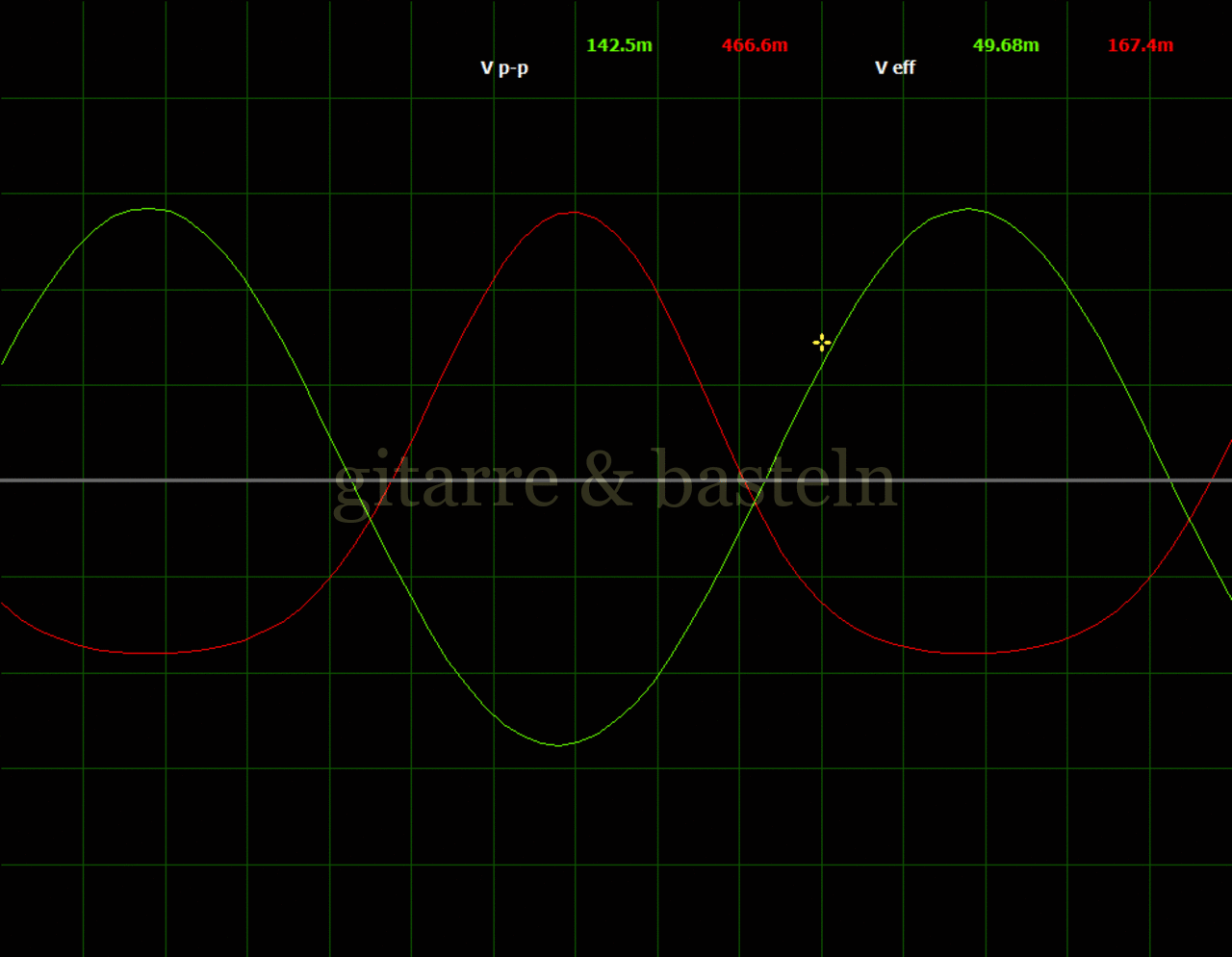 Das vorhandene Messequipment (Stereo-Soundkarte, Soundkartenvorschaltgerät mit einem Ausgang und zwei Eingängen, 2-Kanal-Software-Oszilloskop) machte es notwendig, die Messungen aufzuteilen. Bei jedem Messaufbau wurde im jeweils ersten Durchgang das Signal an der Basis gegen das Eingangssignal vor einem Basisvorwiderstand gemessen, im jeweils zweiten Durchgang das Signal am Kollektor gegen das an der Basis.