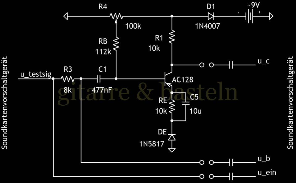Abb. C.2: Treblebooster-Testschaltung mit Germaniumtransistor AC128 (β ist ausgewiesen mit etwa 90) mit einer in den Emitterkreis eingeschleiften Schottky-Diode 1N5817. Der Eingangskondensator ist vergrößert.