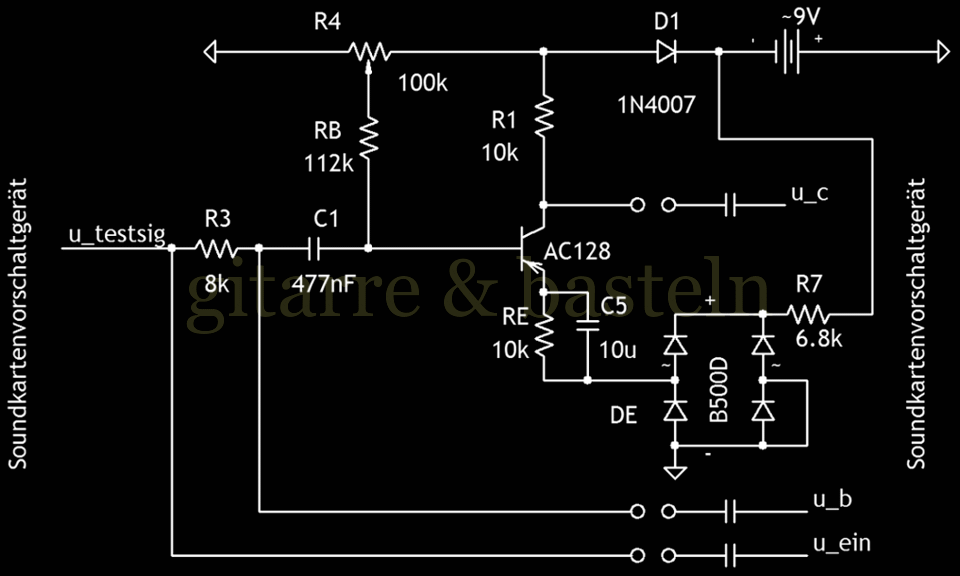 Abb. C.3: Treblebooster-Testschaltung mit Germaniumtransistor AC128 (β ist ausgewiesen mit etwa 90) mit einer in den Emitterkreis eingeschleiften, vorgespannten Siliziumdiode. Der Eingangskondensator ist vergrößert.