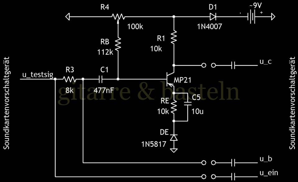 Abb. C.5: Treblebooster-Testschaltung mit Germaniumtransistor МП21 (β grob getestet mit etwa 40 bis 50) mit einer in den Emitterkreis eingeschleiften Schottky-Diode 1N5817. Der Eingangskondensator ist vergrößert.
