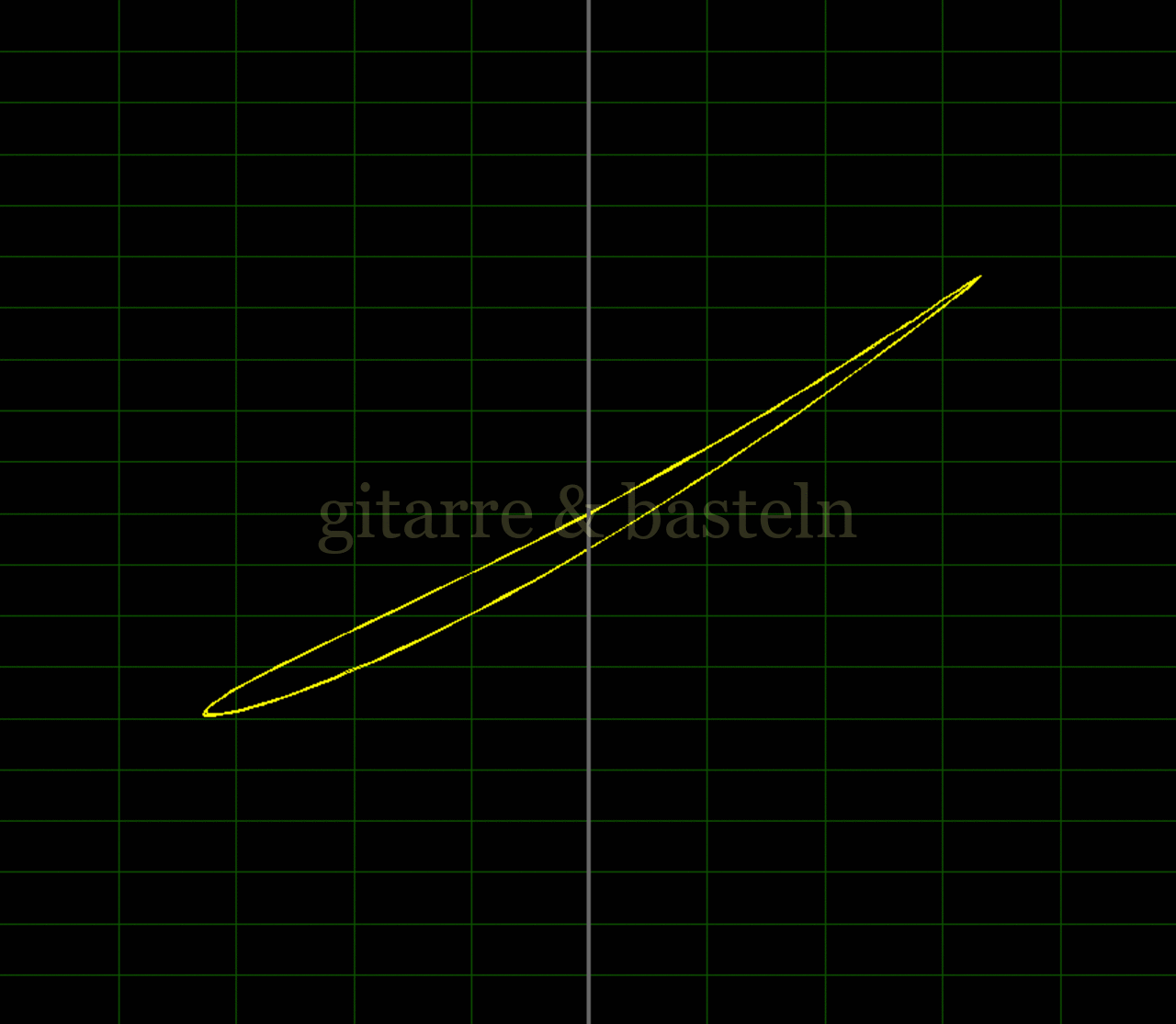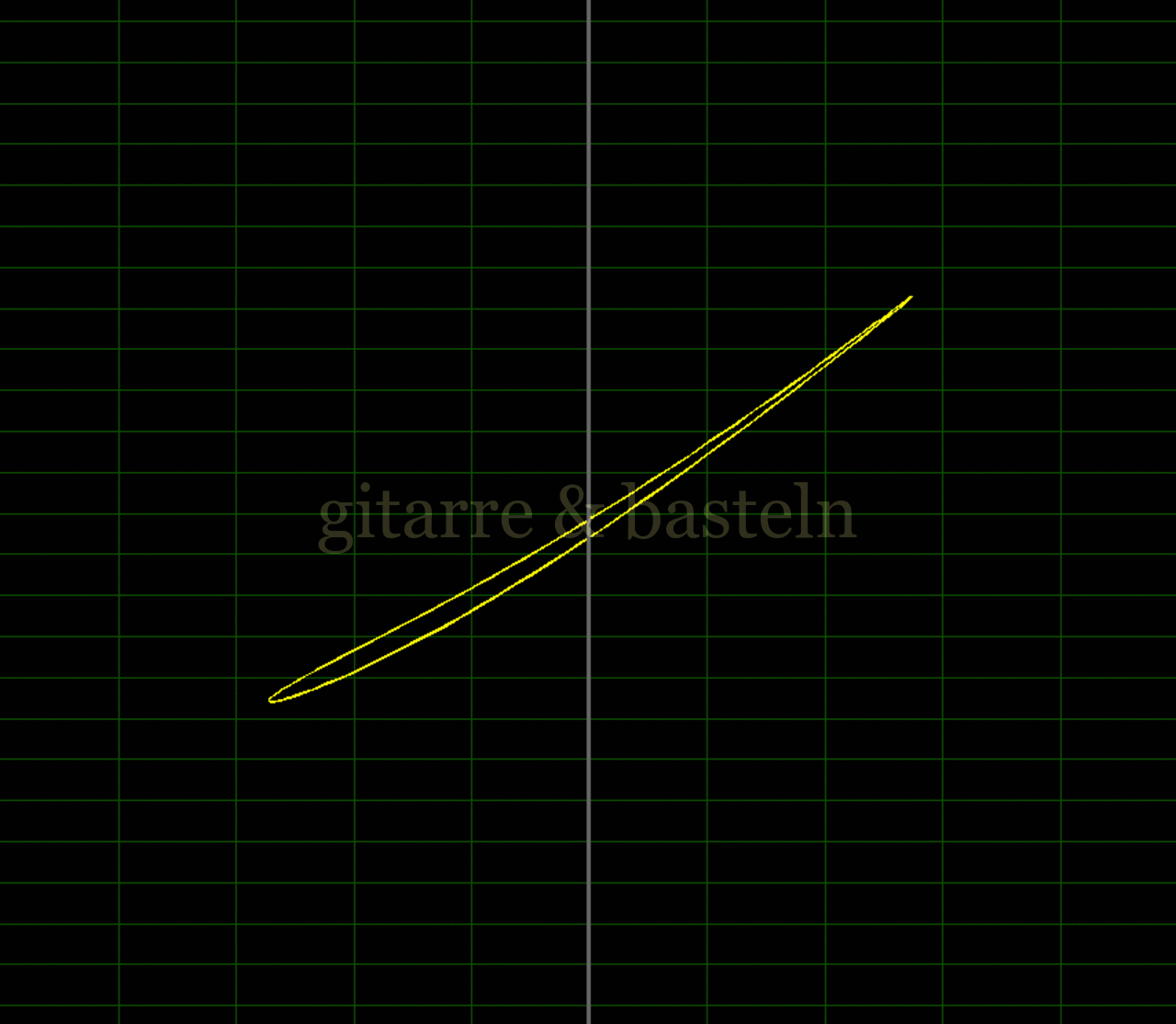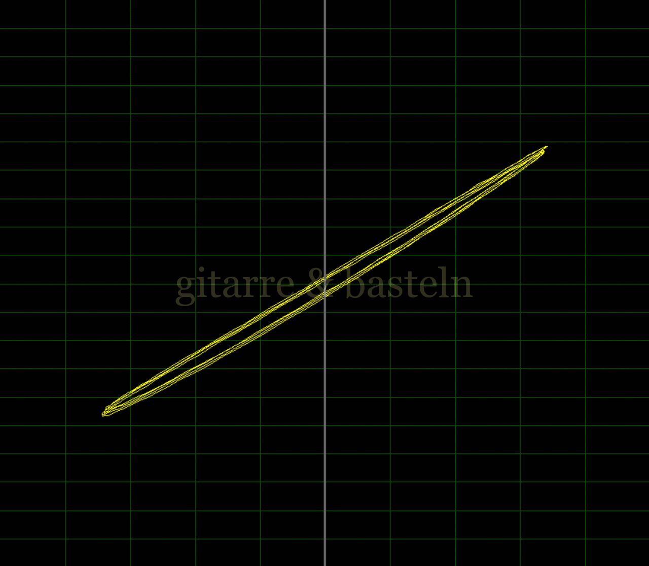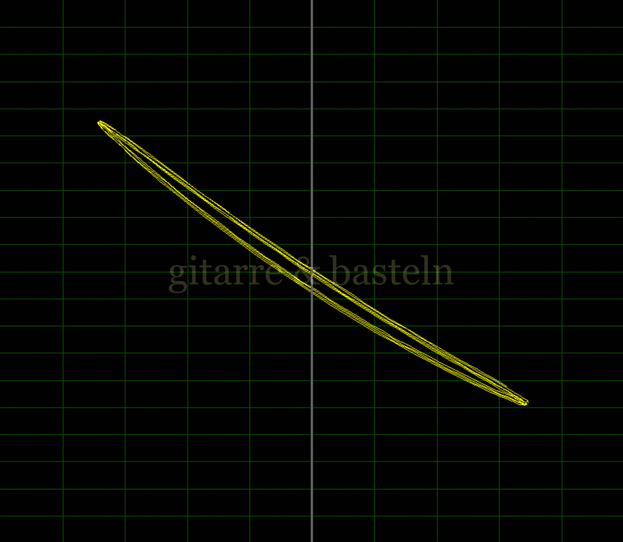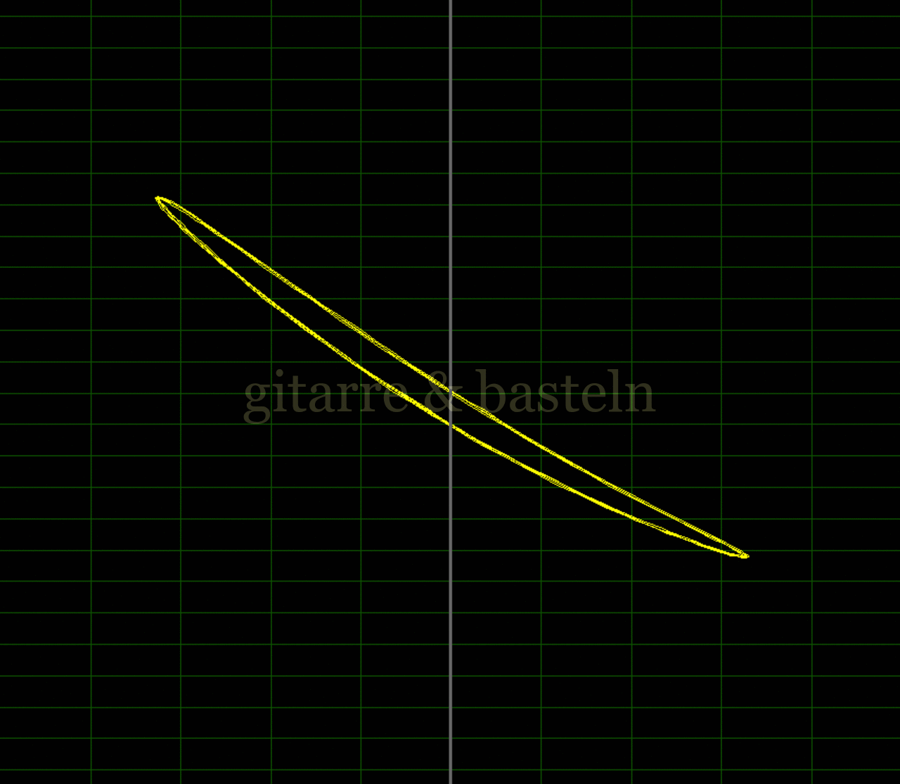 Nun zu den Oszillogrammen und Lissajous-Figuren. Ziel dieser Serie von Messung war ja auch, „einfach mal zu sehen“, wie so eine Treblebooster-Verstärkerstufe mit Germaniumtransistor übersteuert (und ob es ein spezielles „Germaniumverhalten“) gibt und wie das ggfs. aussieht.