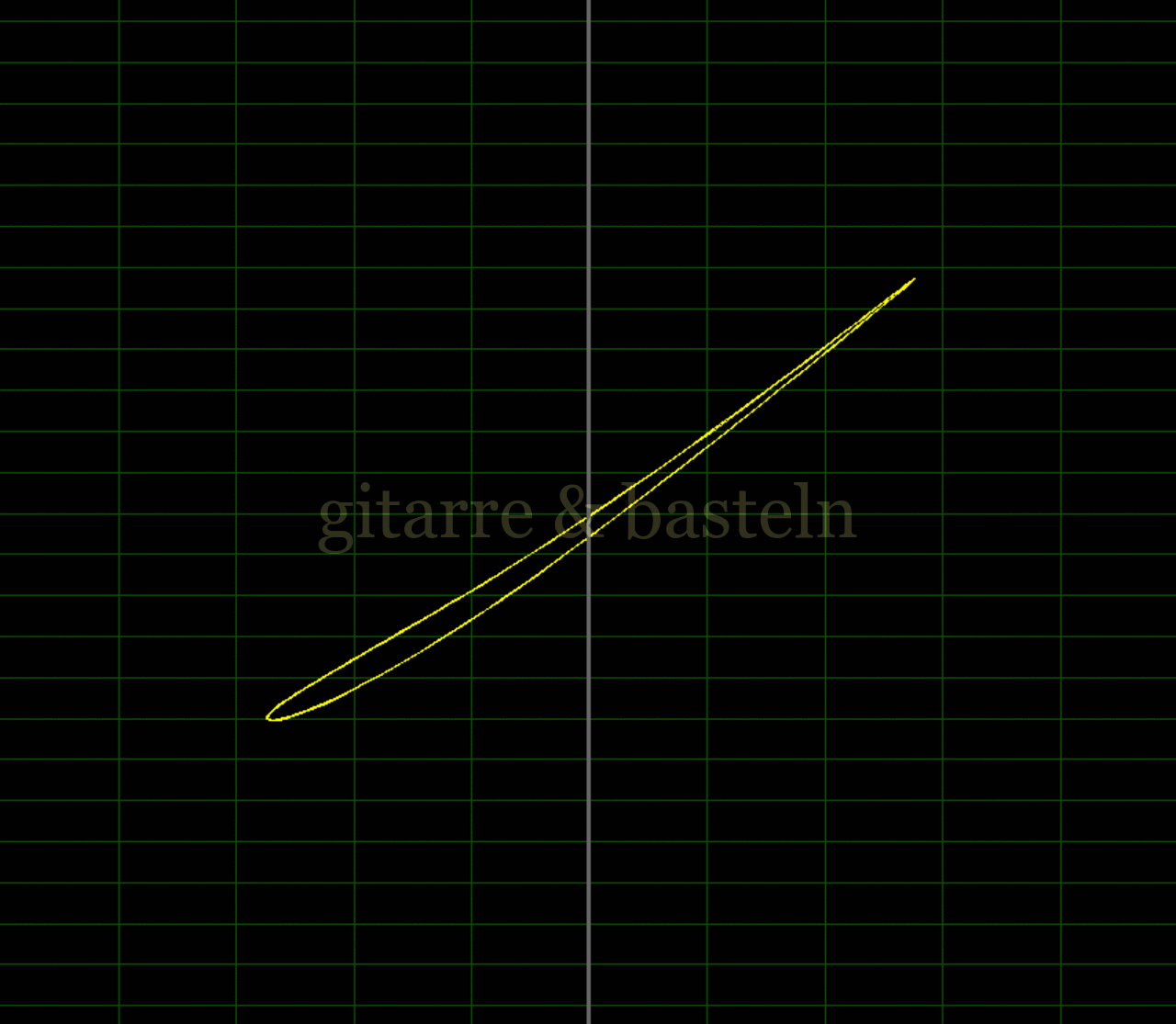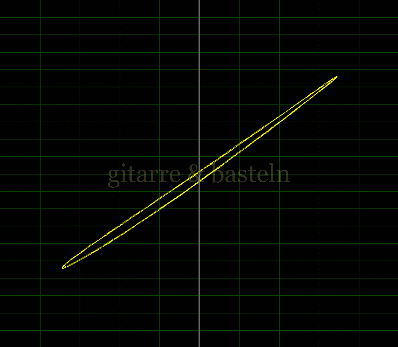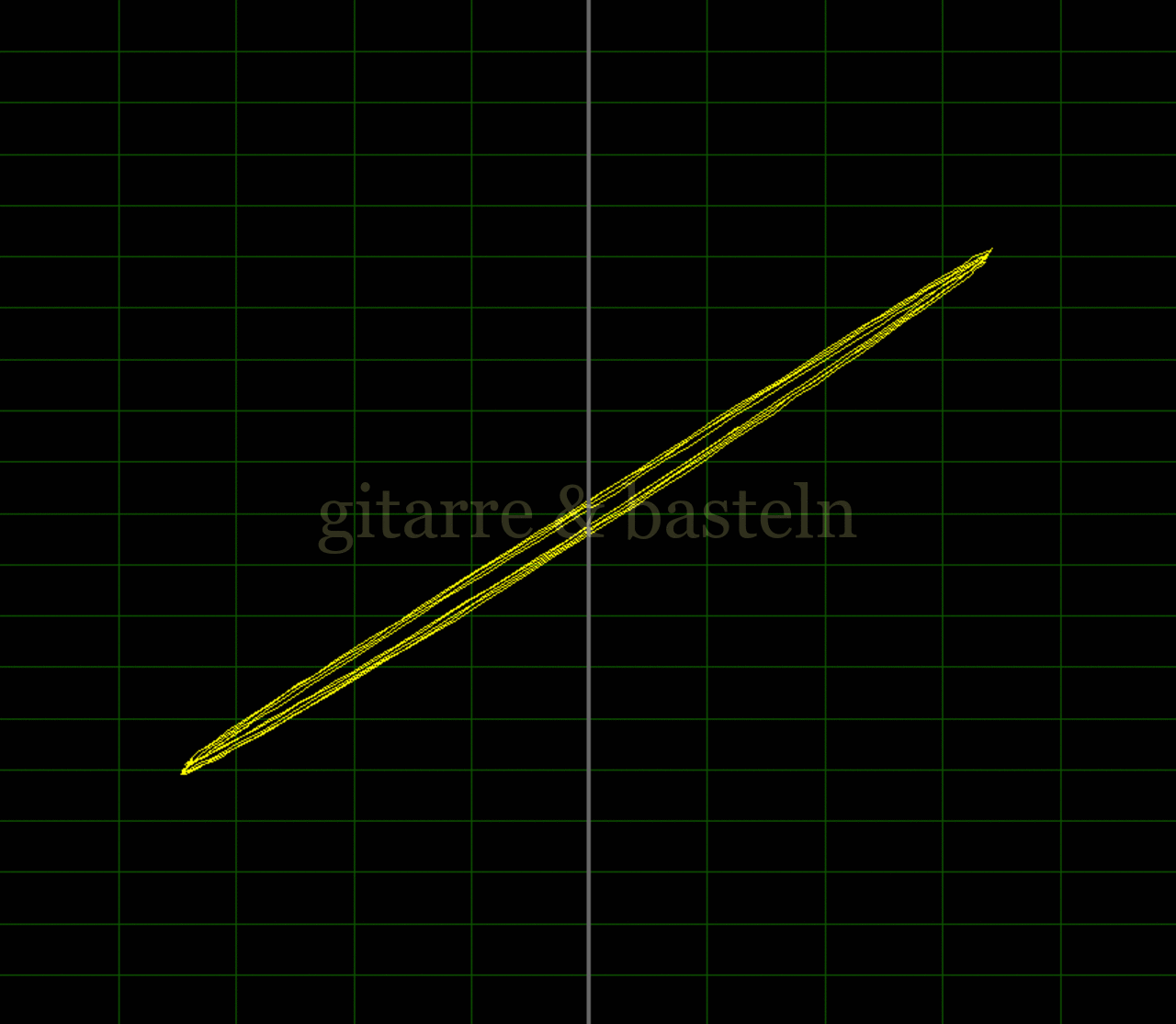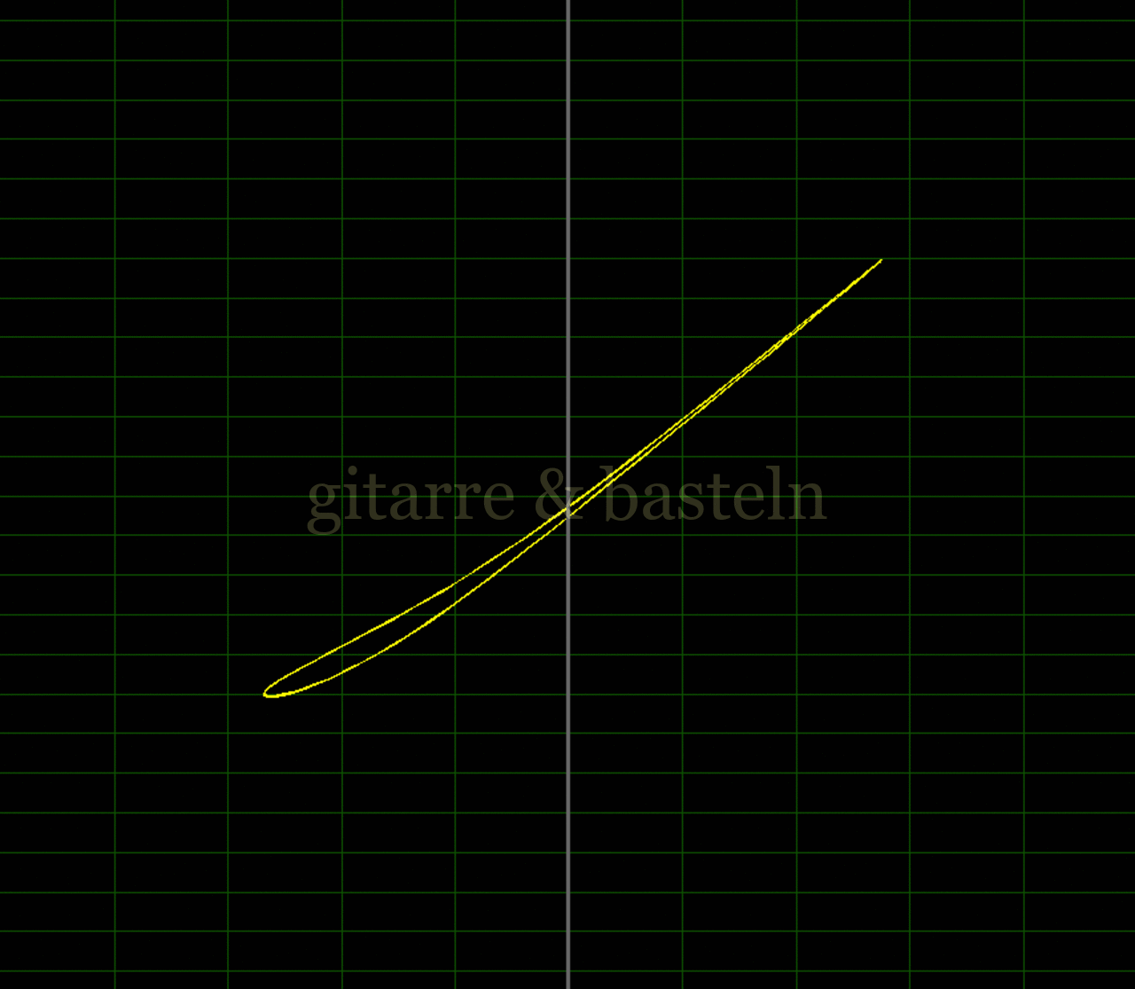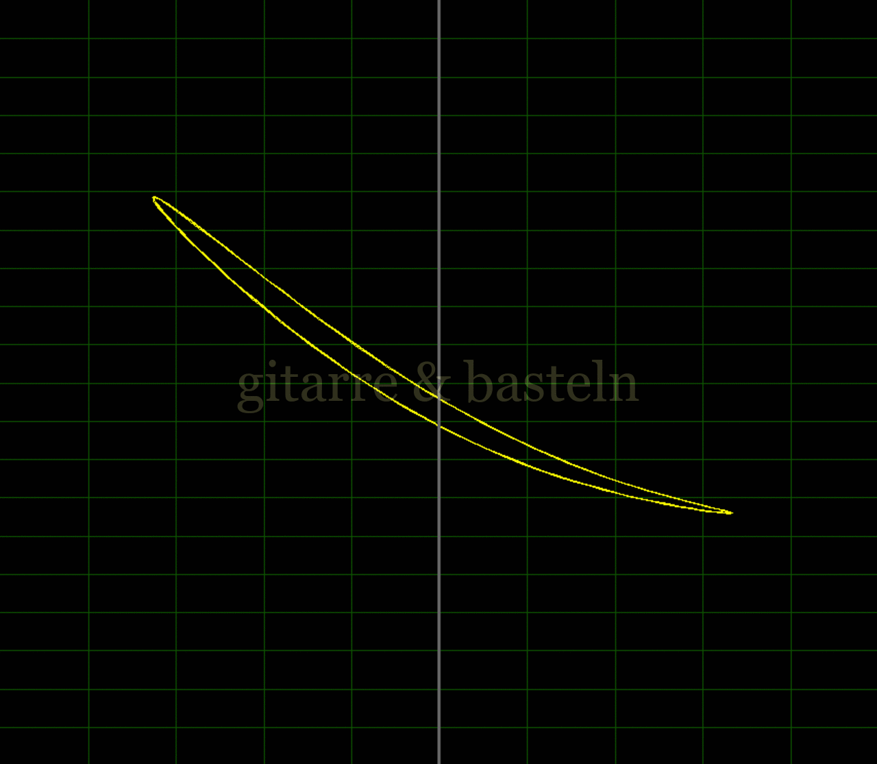 Nun zu den Oszillogrammen und Lissajous-Figuren. Ziel dieser Serie von Messung war ja auch, „einfach mal zu sehen“, wie so eine Treblebooster-Verstärkerstufe mit Germaniumtransistor übersteuert (und ob es ein spezielles „Germaniumverhalten“) gibt und wie das ggfs. aussieht.