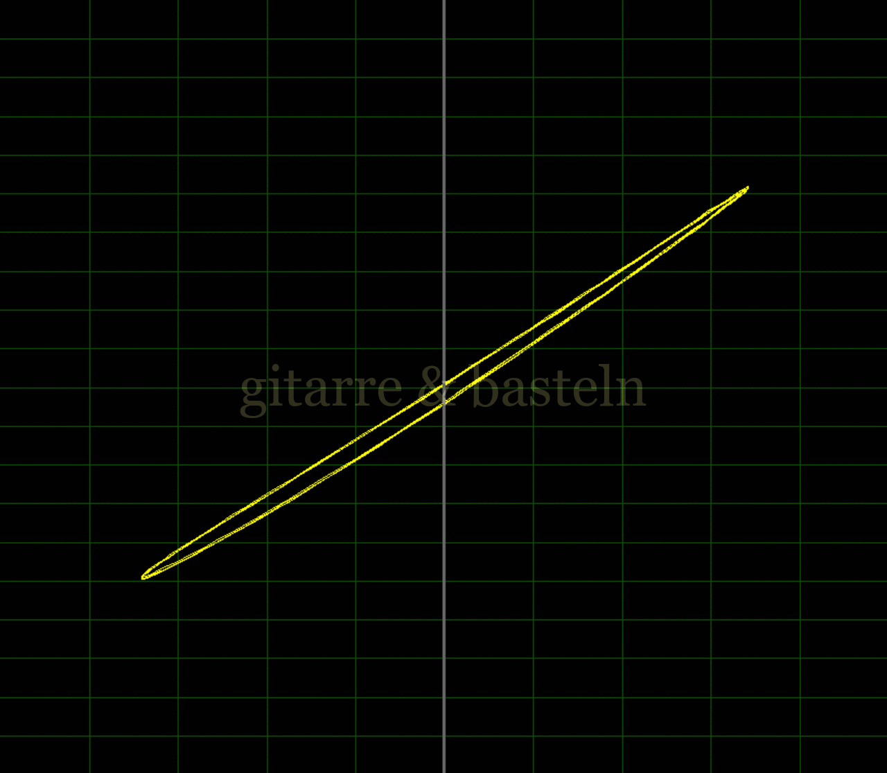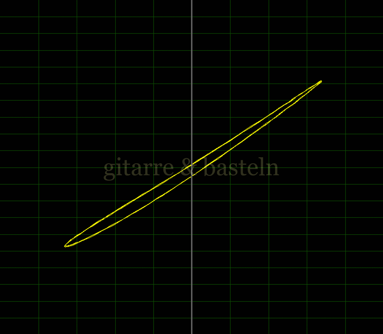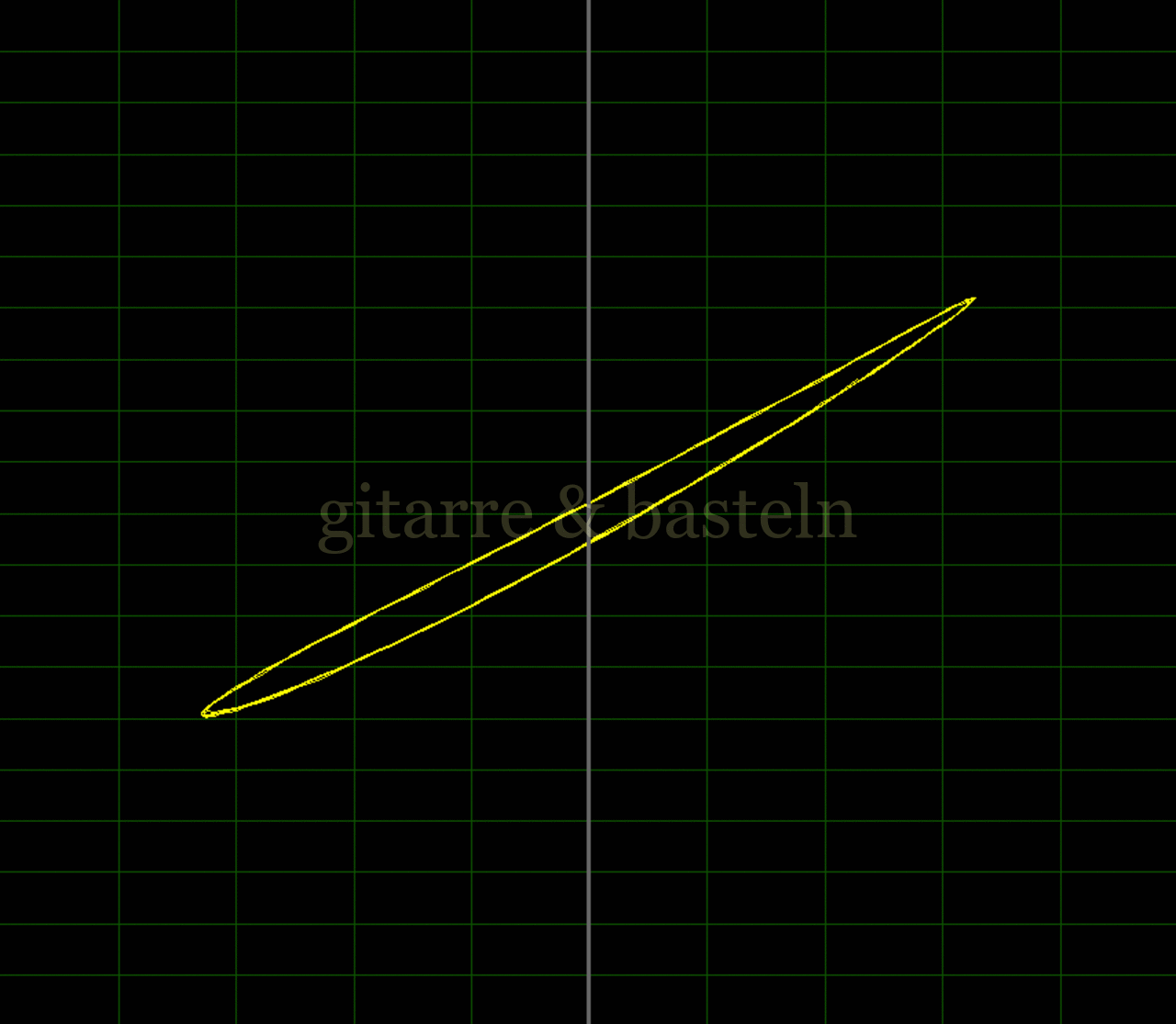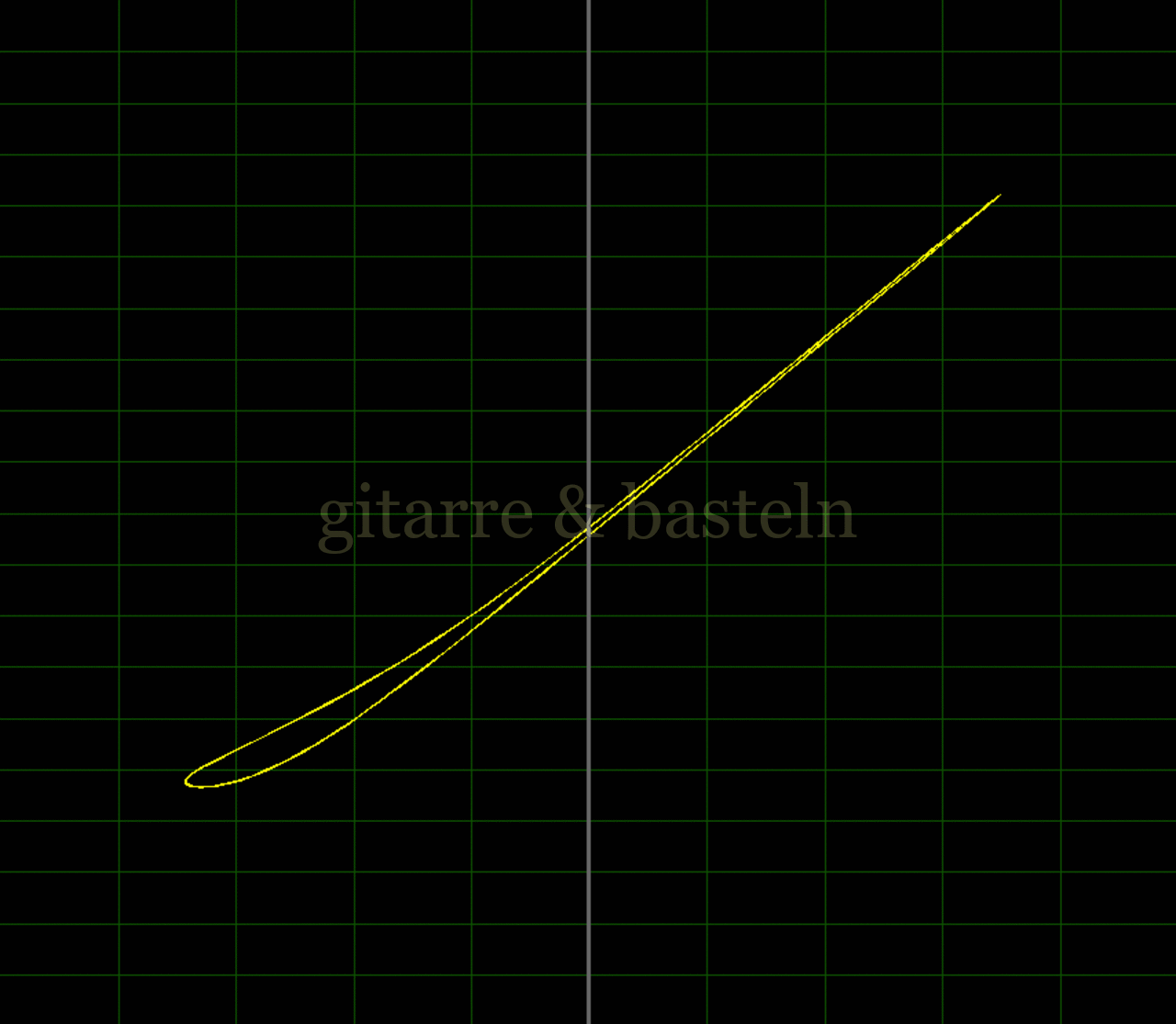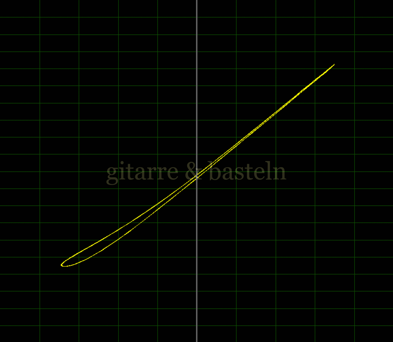 Nun zu den Oszillogrammen und Lissajous-Figuren. Ziel dieser Serie von Messung war ja auch, „einfach mal zu sehen“, wie so eine Treblebooster-Verstärkerstufe mit Germaniumtransistor übersteuert (und ob es ein spezielles „Germaniumverhalten“) gibt und wie das ggfs. aussieht.