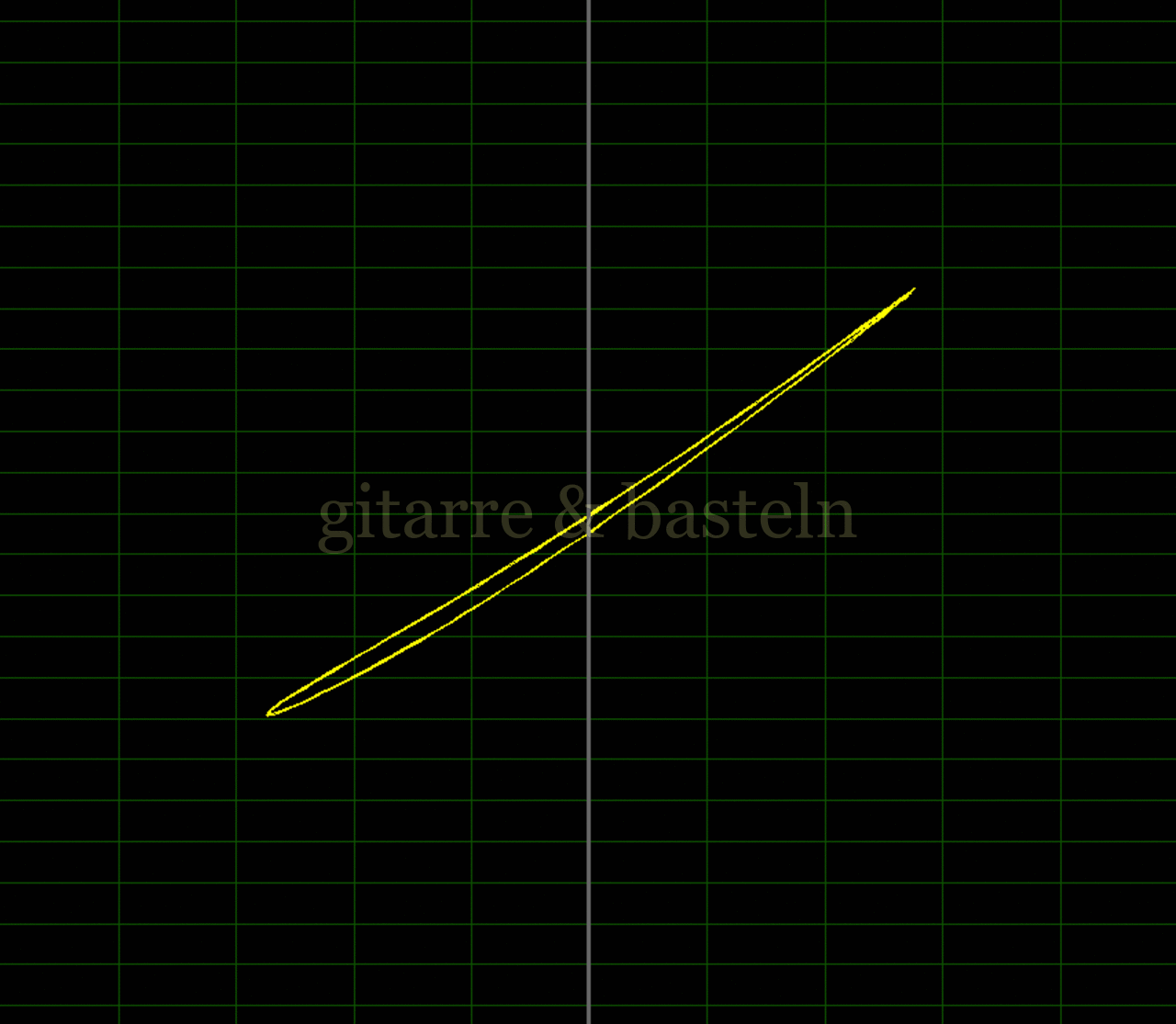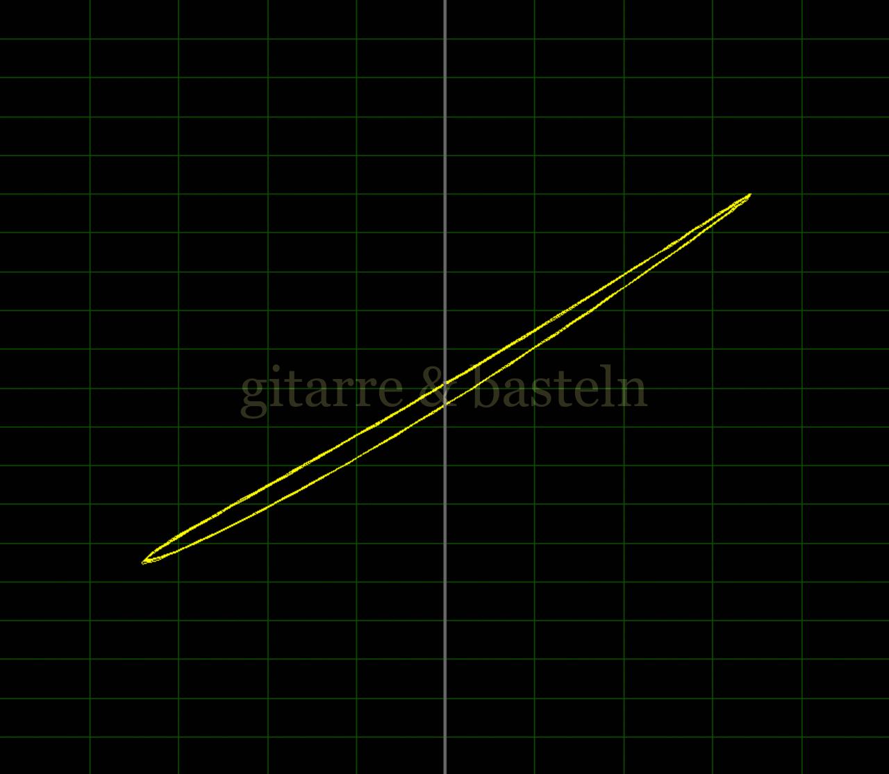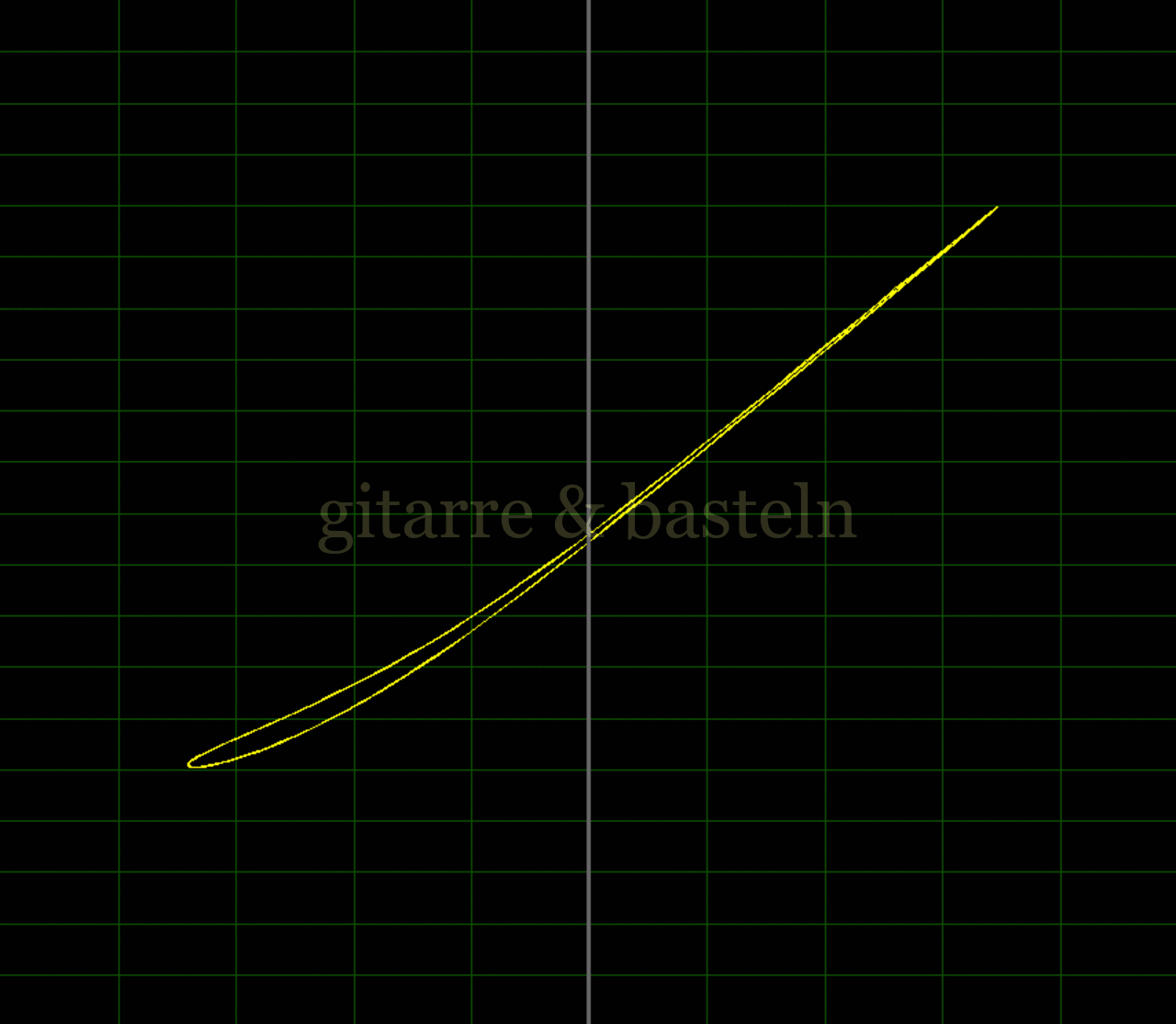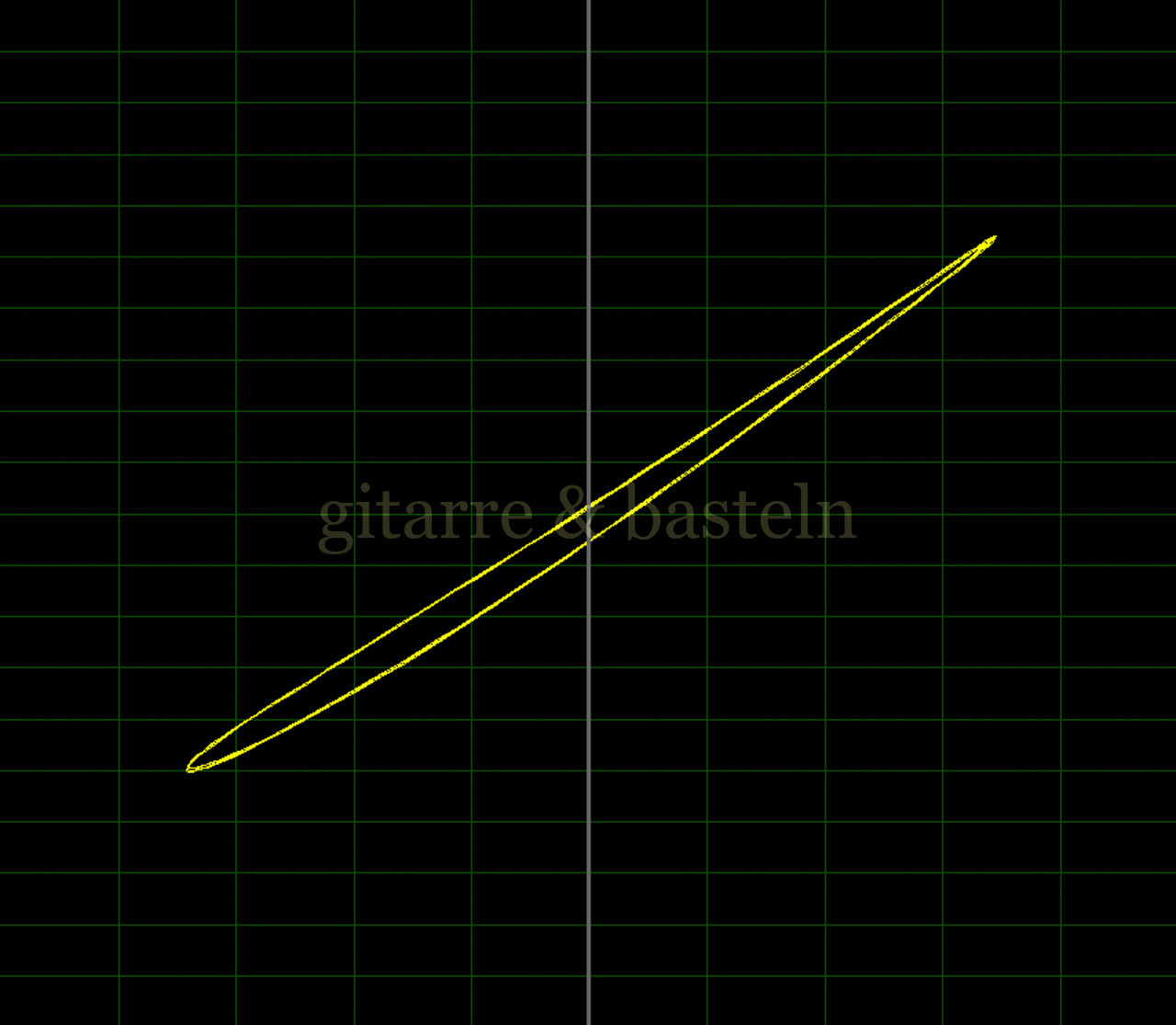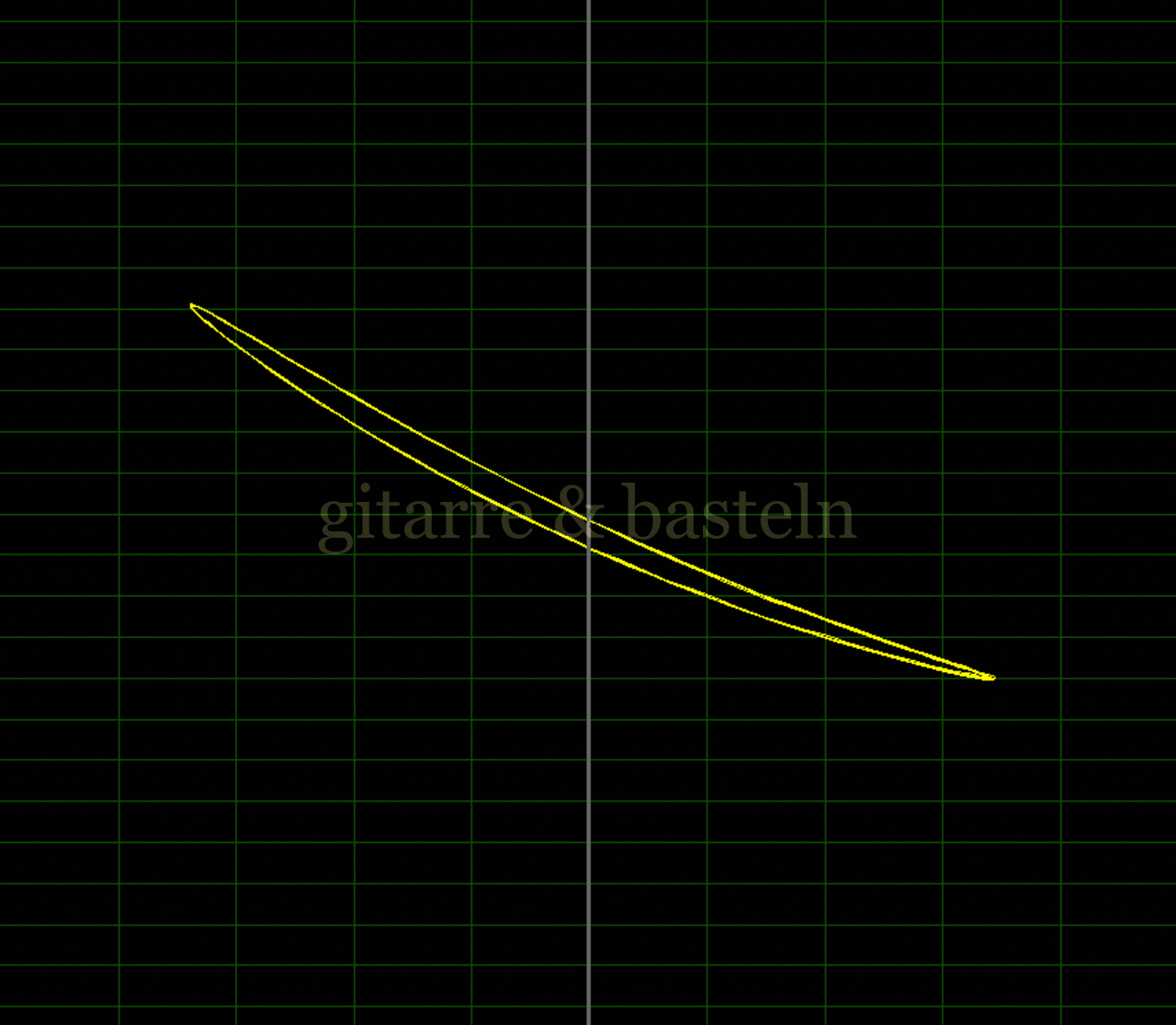 Nun zu den Oszillogrammen und Lissajous-Figuren. Ziel dieser Serie von Messung war ja auch, „einfach mal zu sehen“, wie so eine Treblebooster-Verstärkerstufe mit Germaniumtransistor übersteuert (und ob es ein spezielles „Germaniumverhalten“) gibt und wie das ggfs. aussieht.