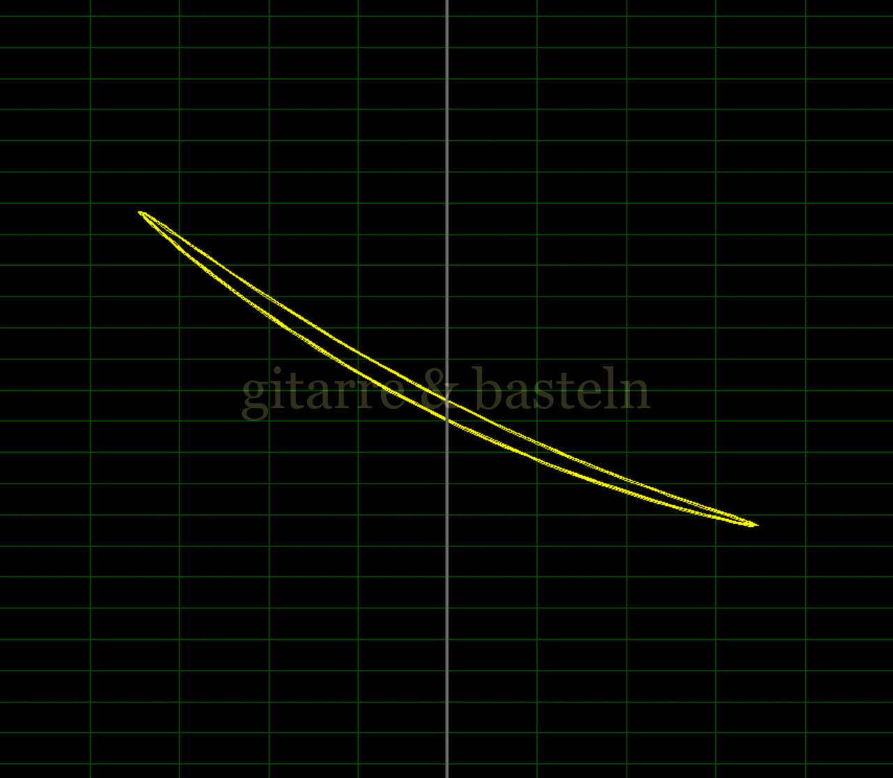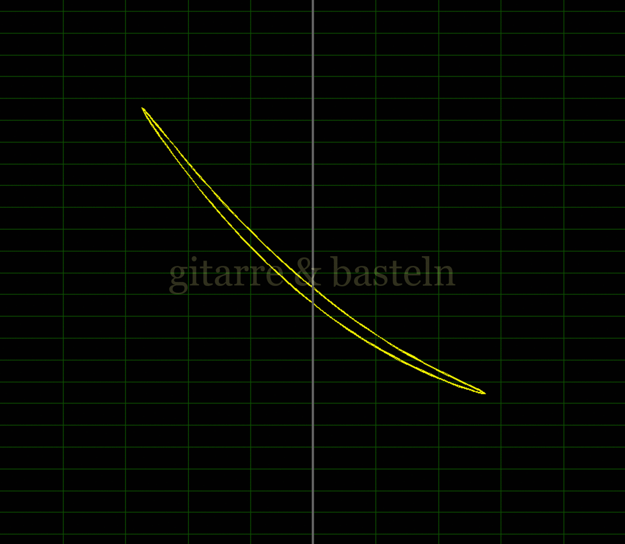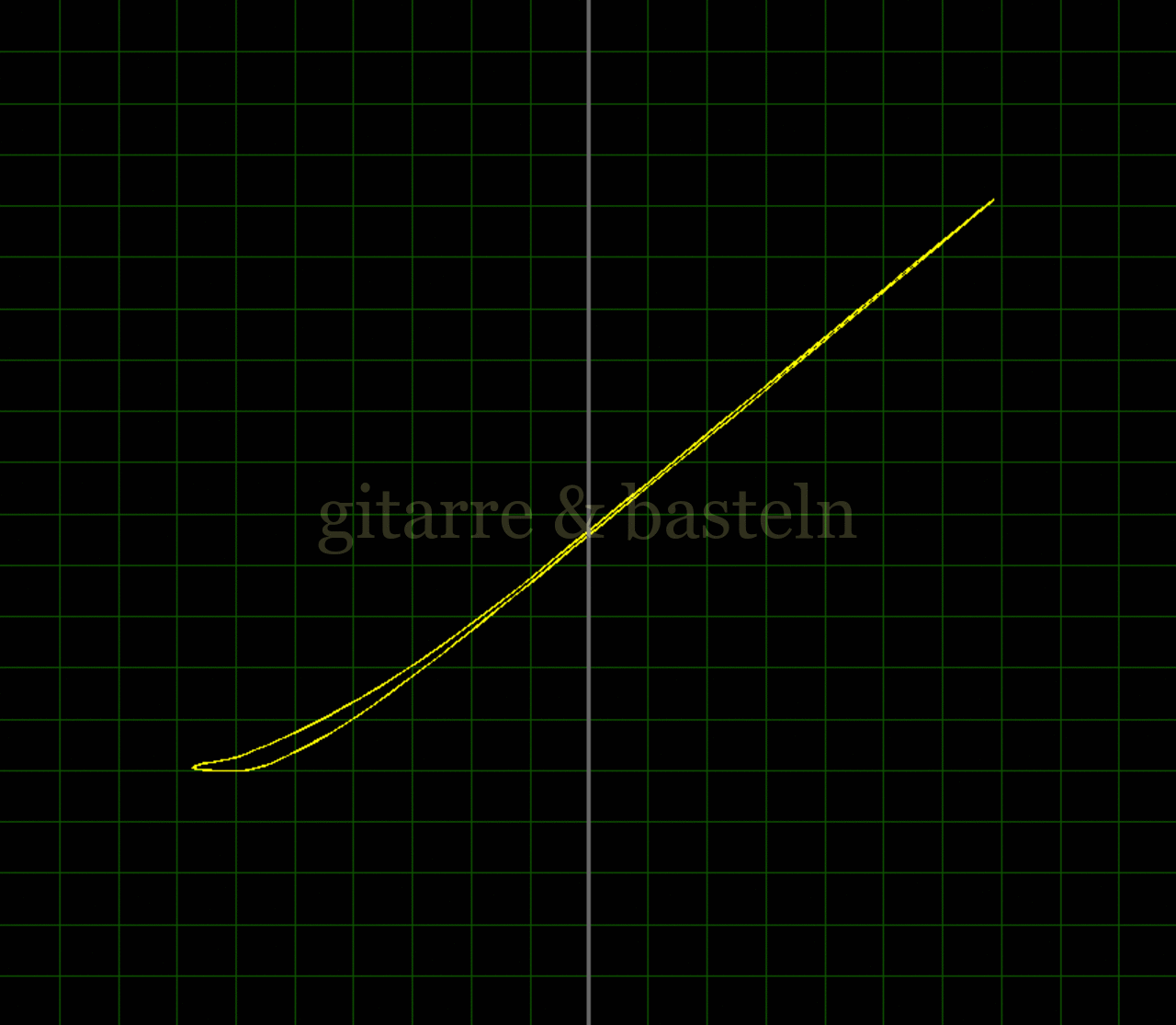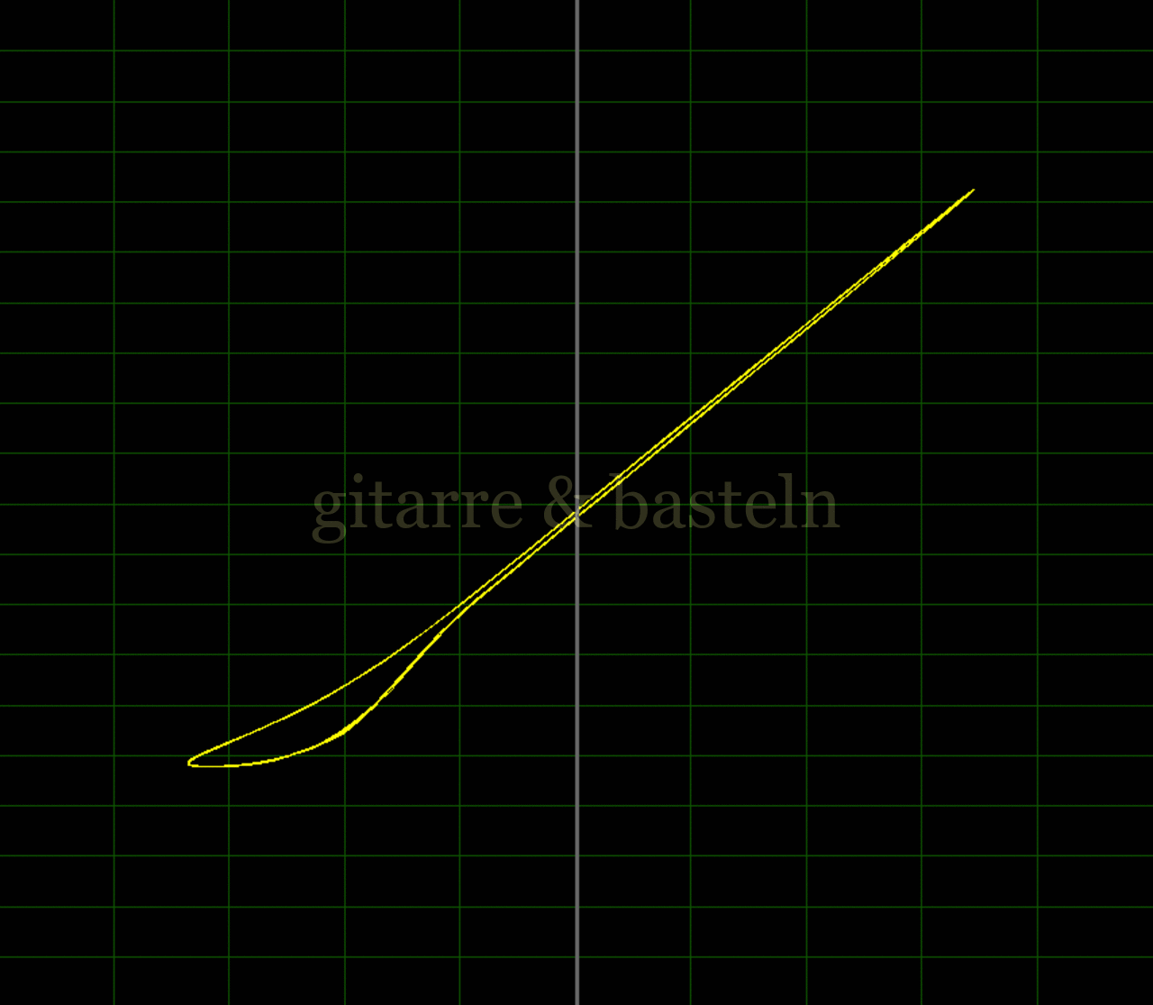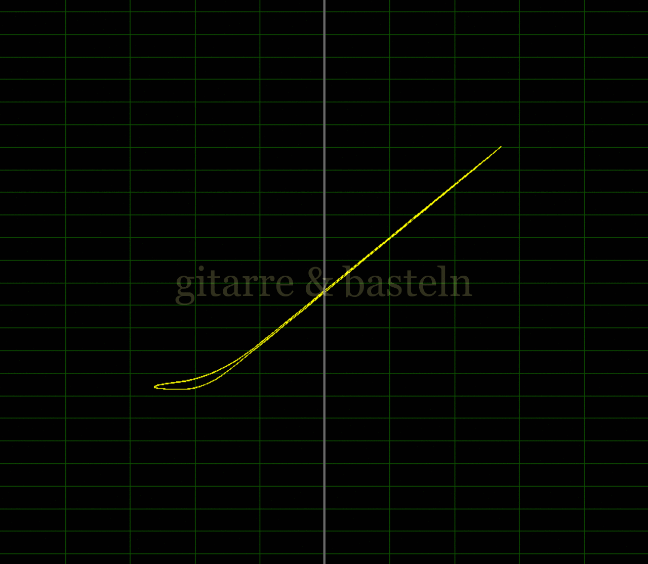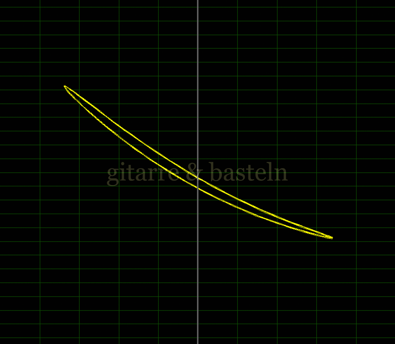 Nun zu den Oszillogrammen und Lissajous-Figuren. Ziel dieser Serie von Messung war ja auch, „einfach mal zu sehen“, wie so eine Treblebooster-Verstärkerstufe mit Germaniumtransistor übersteuert (und ob es ein spezielles „Germaniumverhalten“) gibt und wie das ggfs. aussieht.