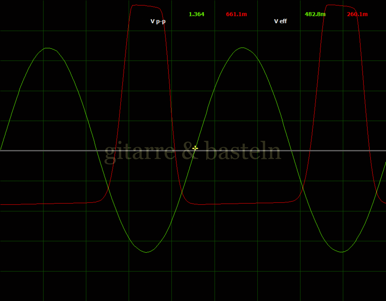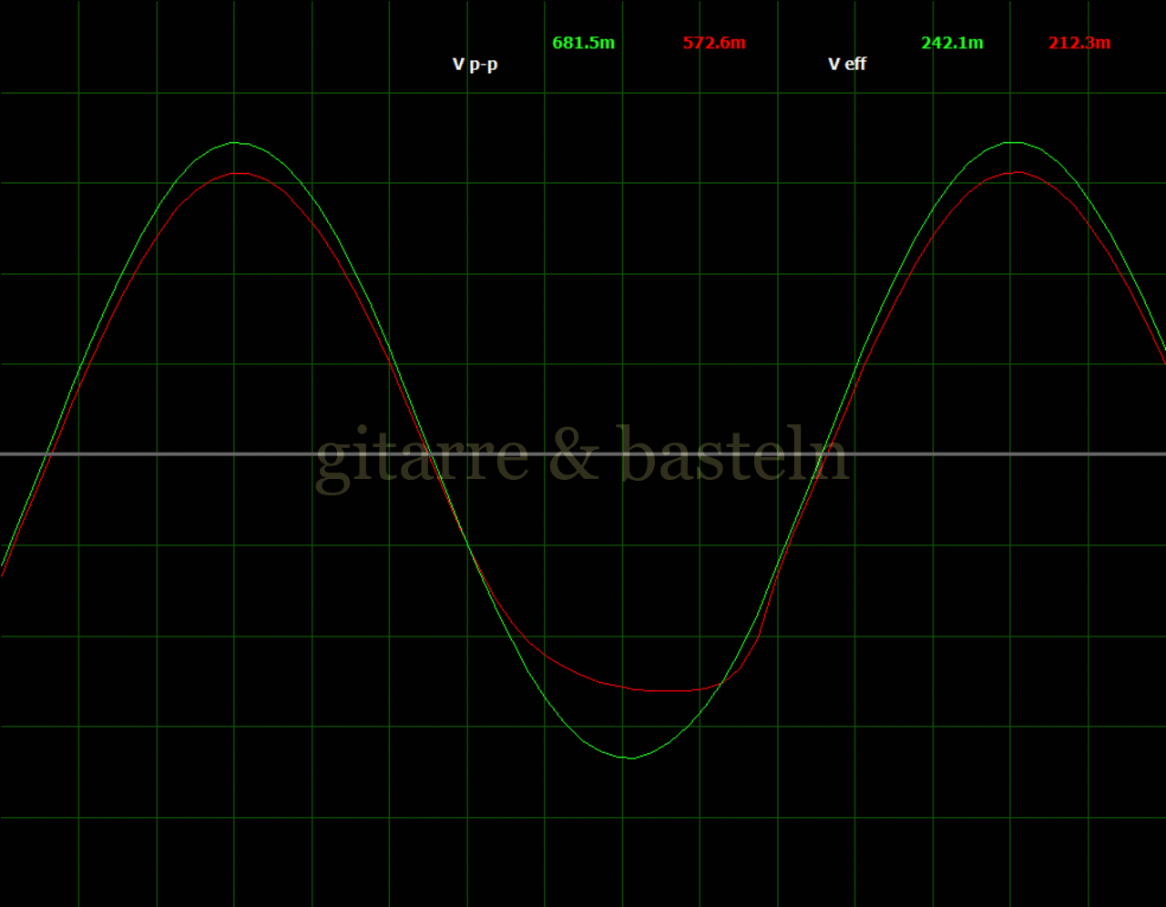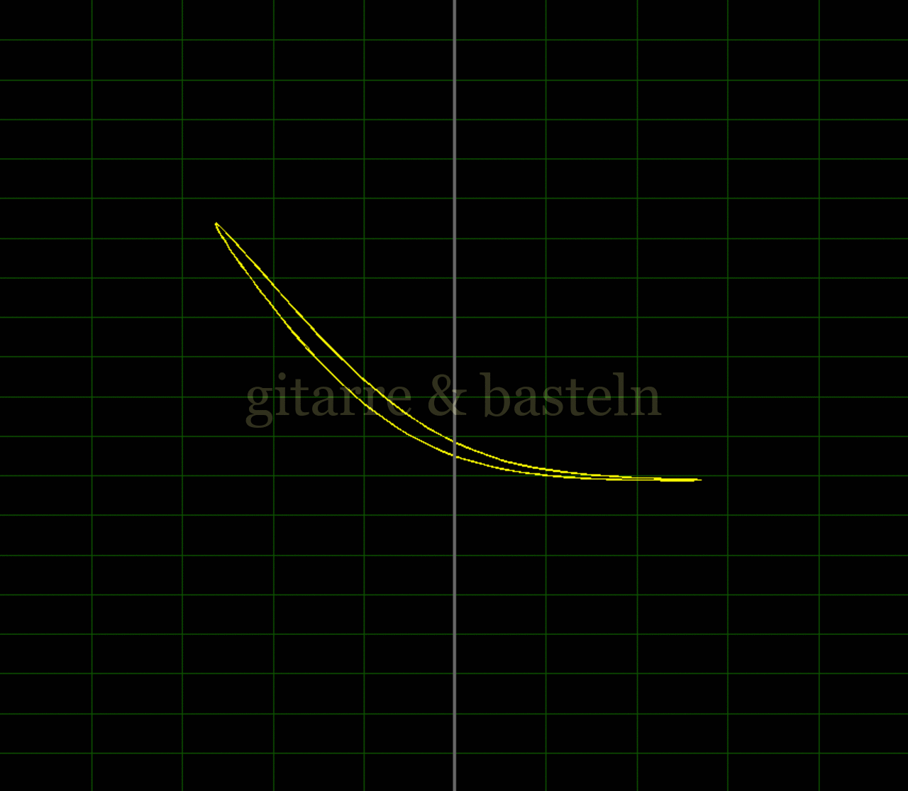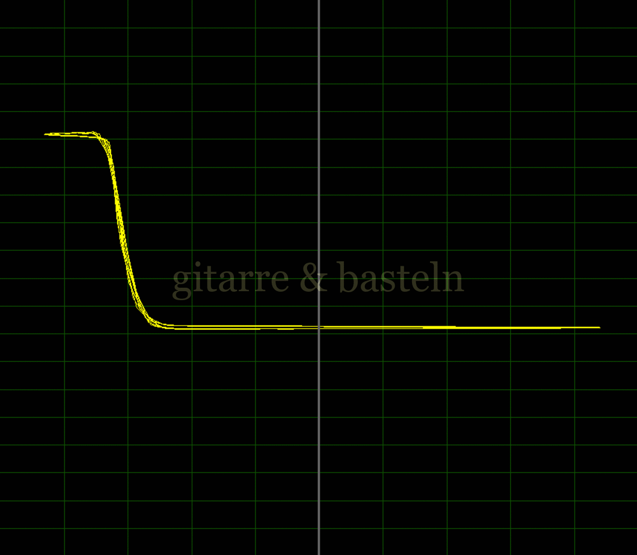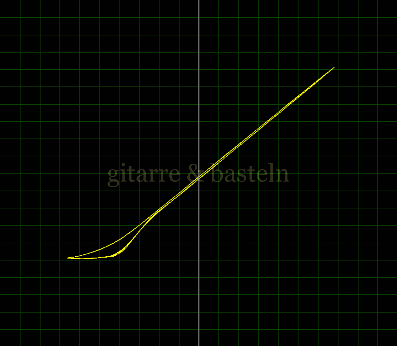 Nun zu den Oszillogrammen und Lissajous-Figuren. Ziel dieser Serie von Messung war ja auch, „einfach mal zu sehen“, wie so eine Treblebooster-Verstärkerstufe mit Germaniumtransistor übersteuert (und ob es ein spezielles „Germaniumverhalten“) gibt und wie das ggfs. aussieht.