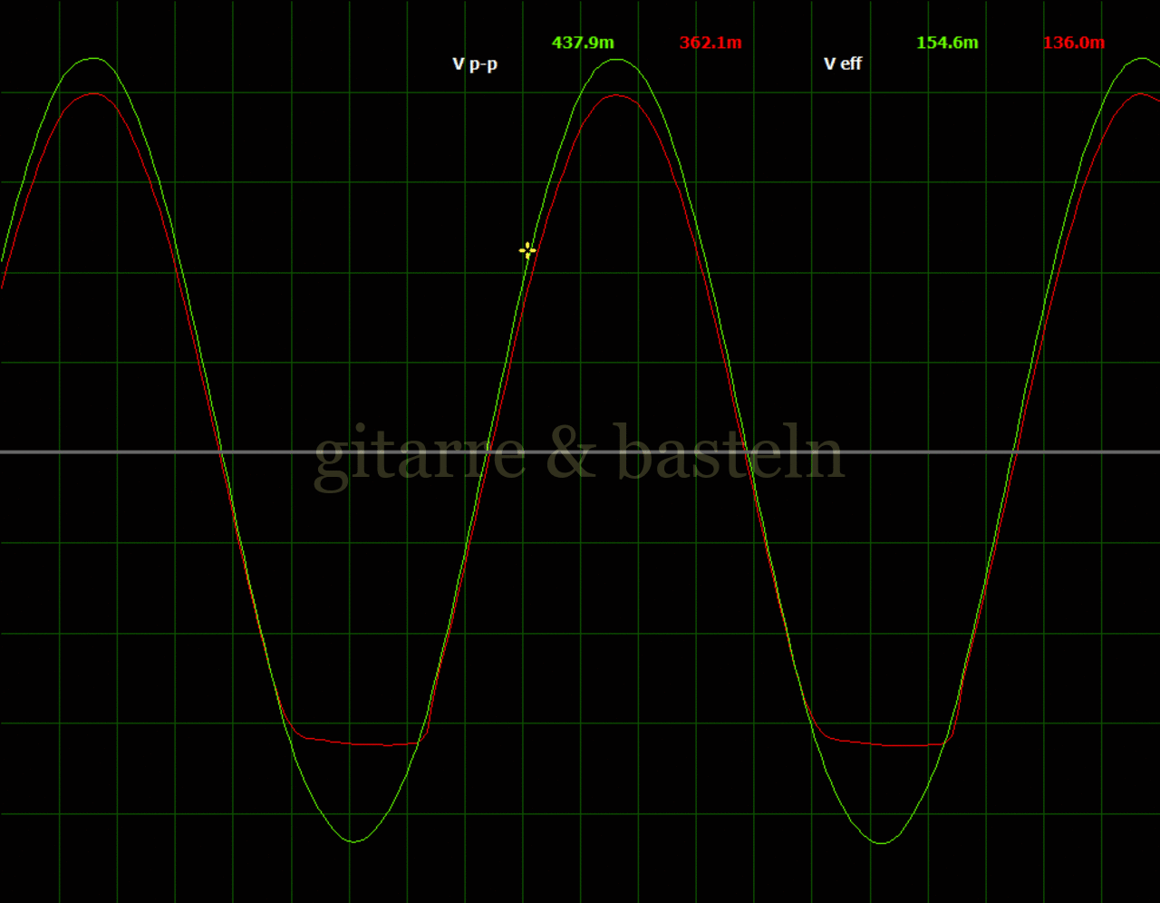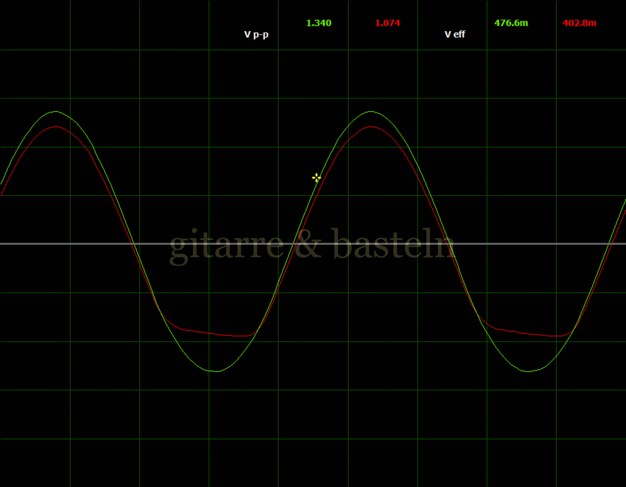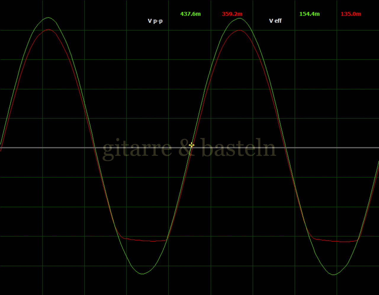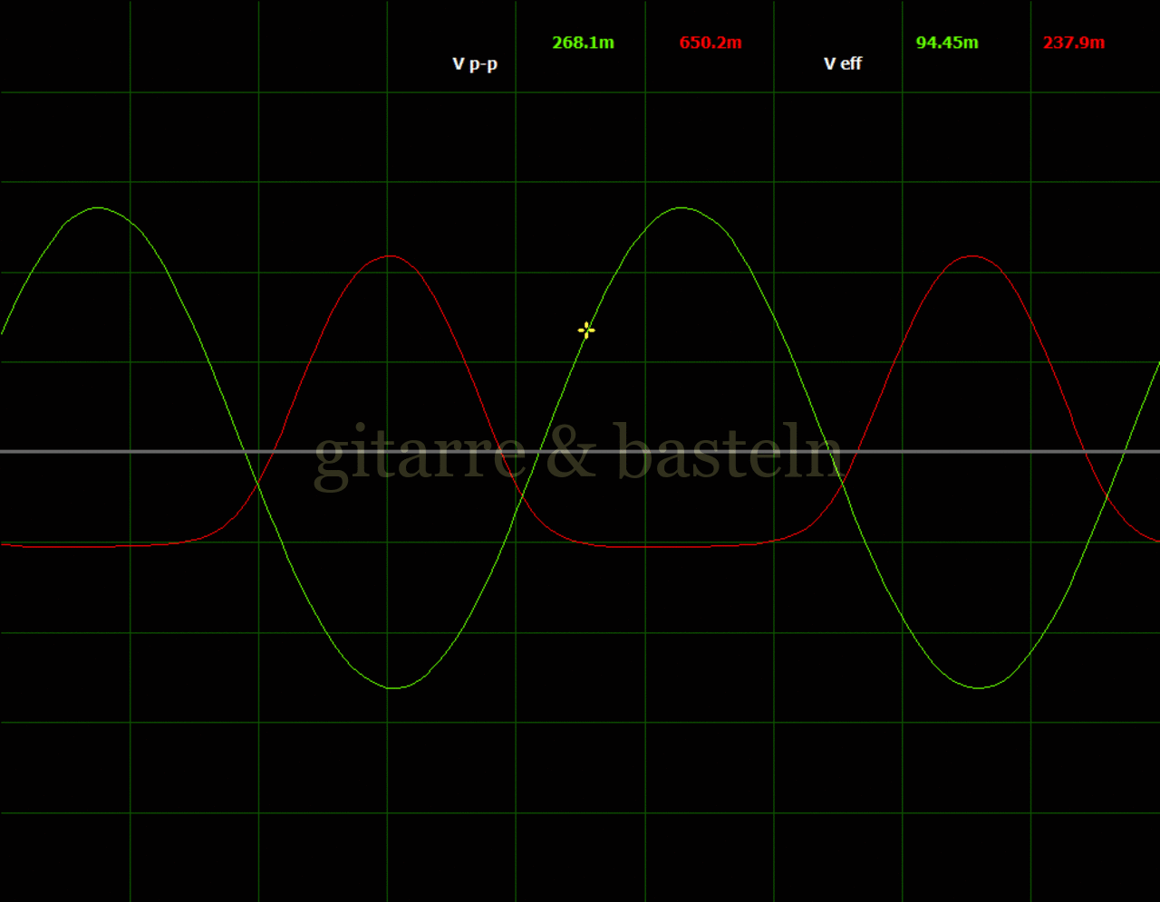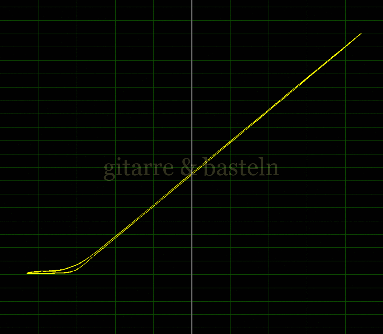 Nun zu den Oszillogrammen und Lissajous-Figuren. Ziel dieser Serie von Messung war ja auch, „einfach mal zu sehen“, wie so eine Treblebooster-Verstärkerstufe mit Germaniumtransistor übersteuert (und ob es ein spezielles „Germaniumverhalten“) gibt und wie das ggfs. aussieht.