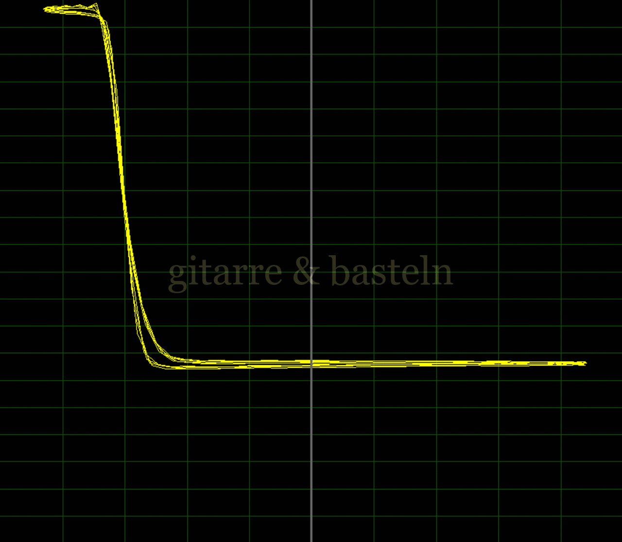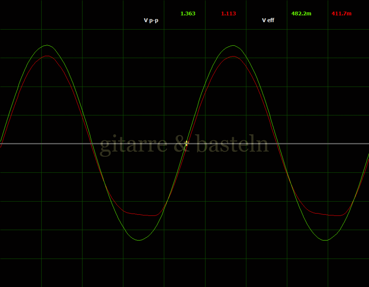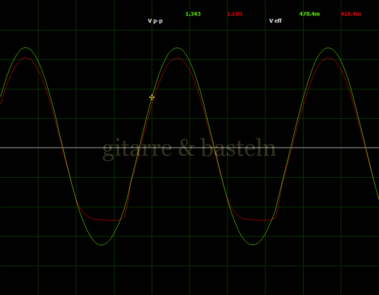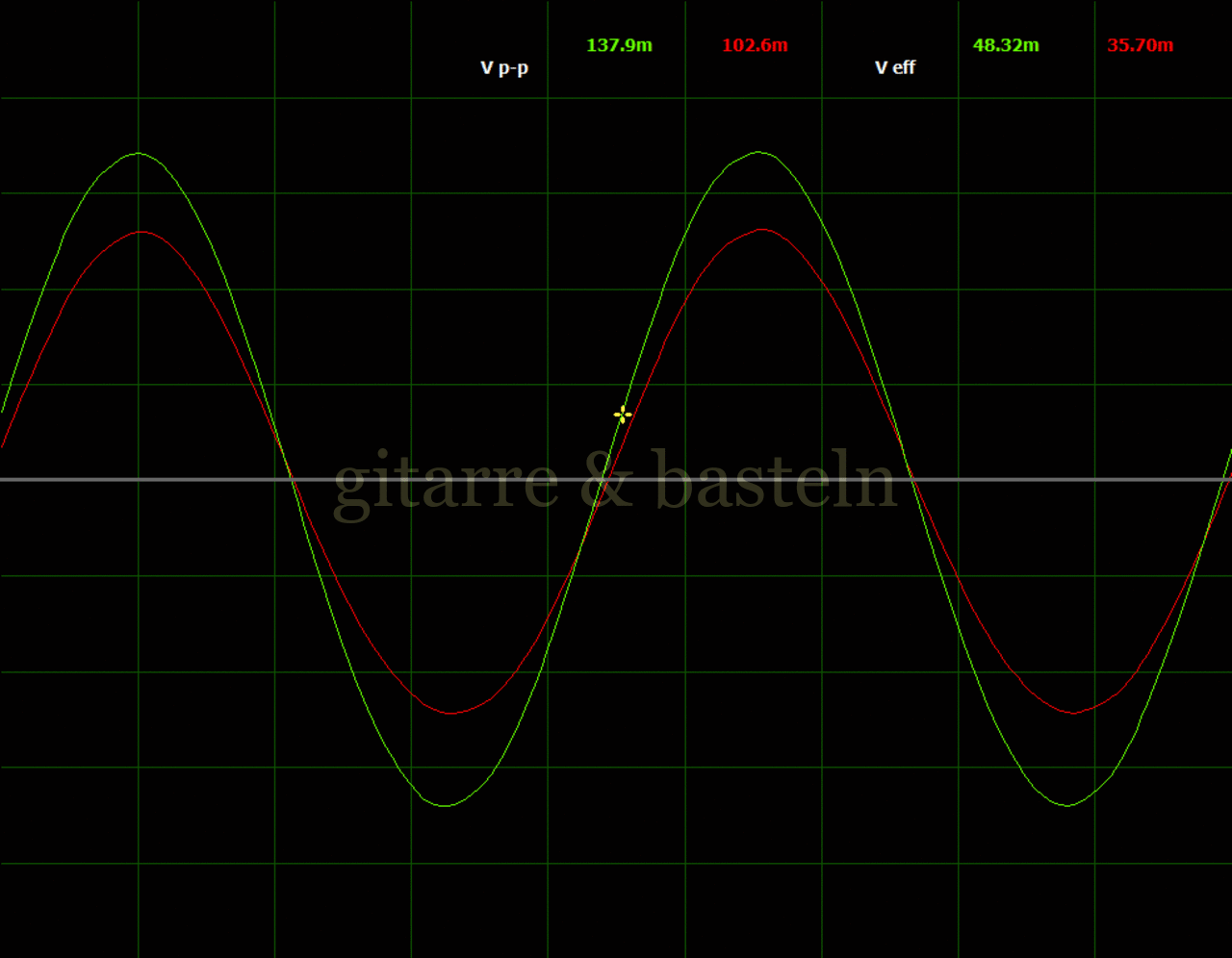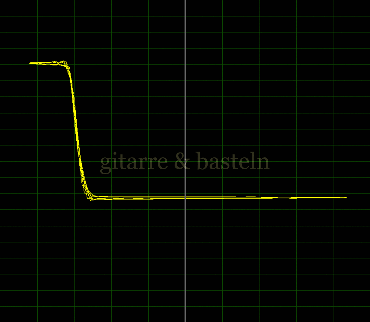 Nun zu den Oszillogrammen und Lissajous-Figuren. Ziel dieser Serie von Messung war ja auch, „einfach mal zu sehen“, wie so eine Treblebooster-Verstärkerstufe mit Germaniumtransistor übersteuert (und ob es ein spezielles „Germaniumverhalten“) gibt und wie das ggfs. aussieht.