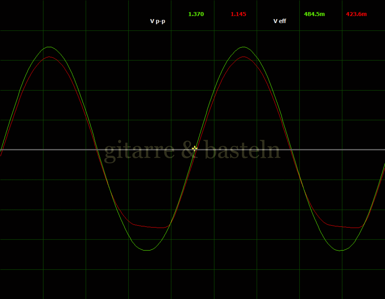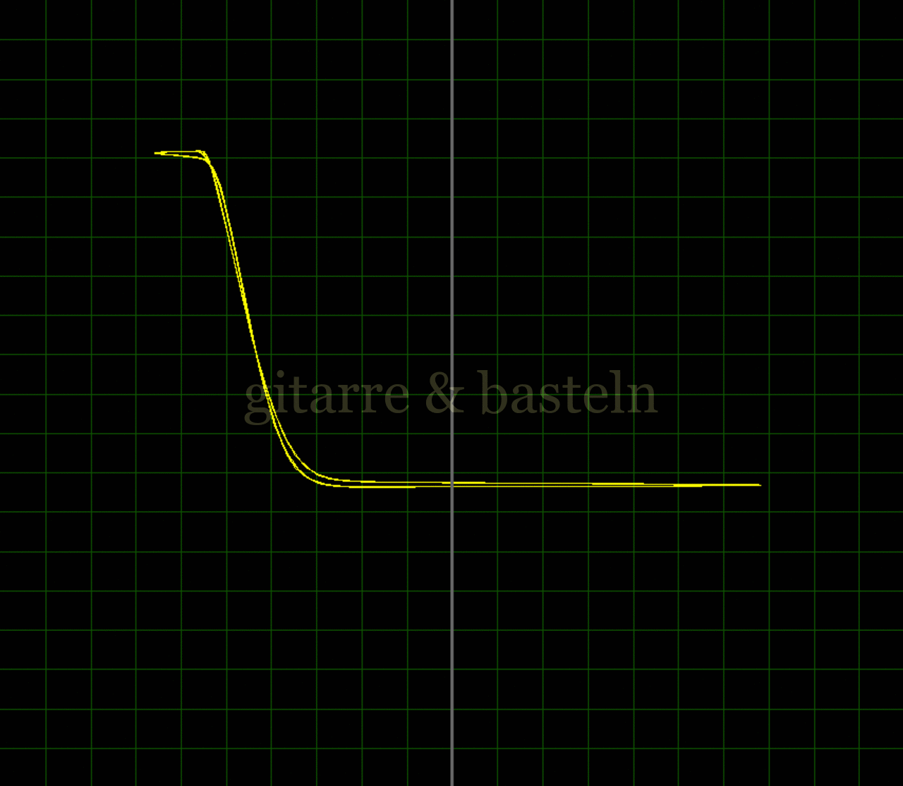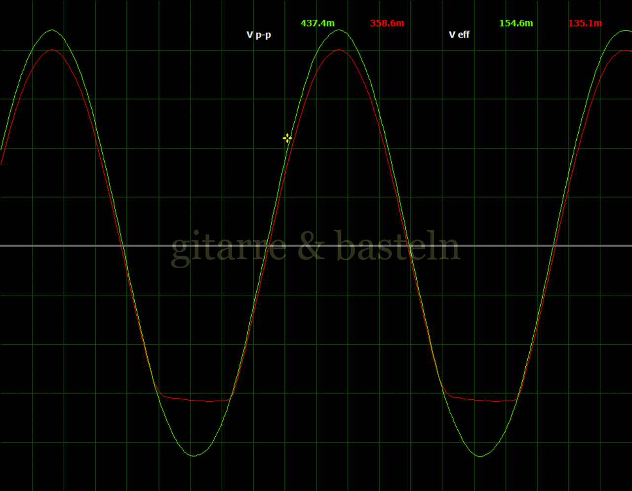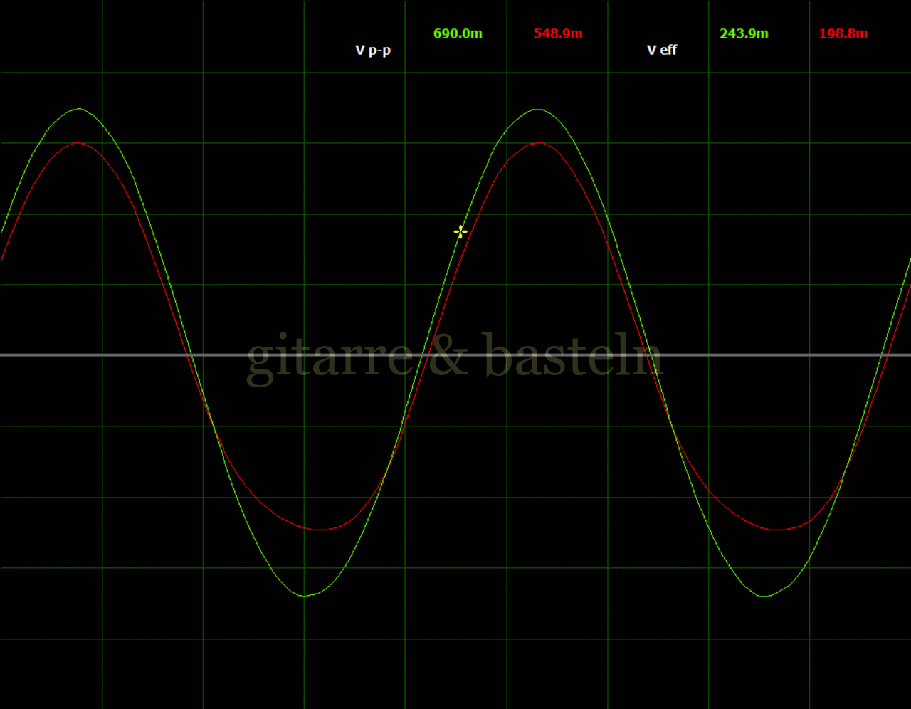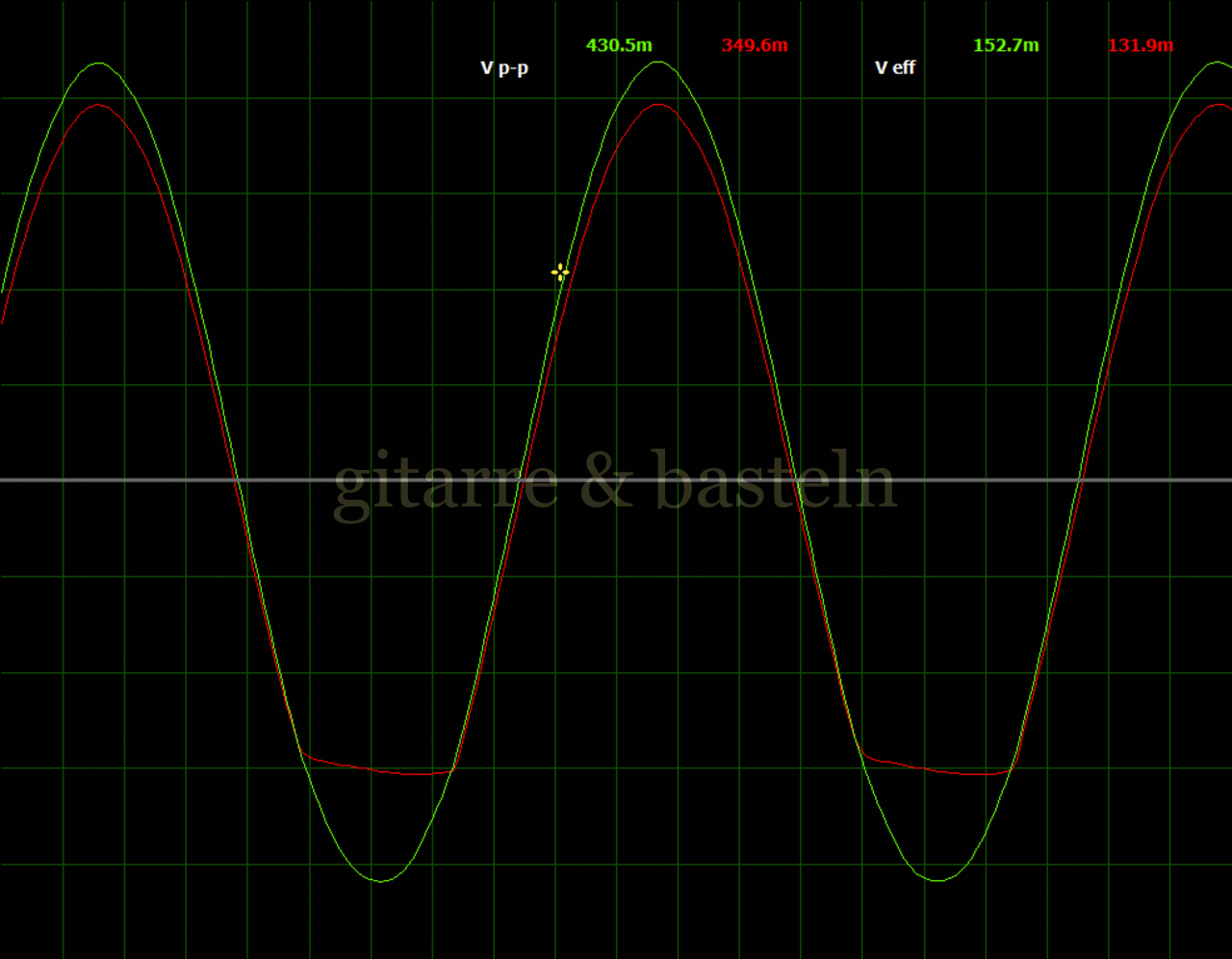 Nun zu den Oszillogrammen und Lissajous-Figuren. Ziel dieser Serie von Messung war ja auch, „einfach mal zu sehen“, wie so eine Treblebooster-Verstärkerstufe mit Germaniumtransistor übersteuert (und ob es ein spezielles „Germaniumverhalten“) gibt und wie das ggfs. aussieht.