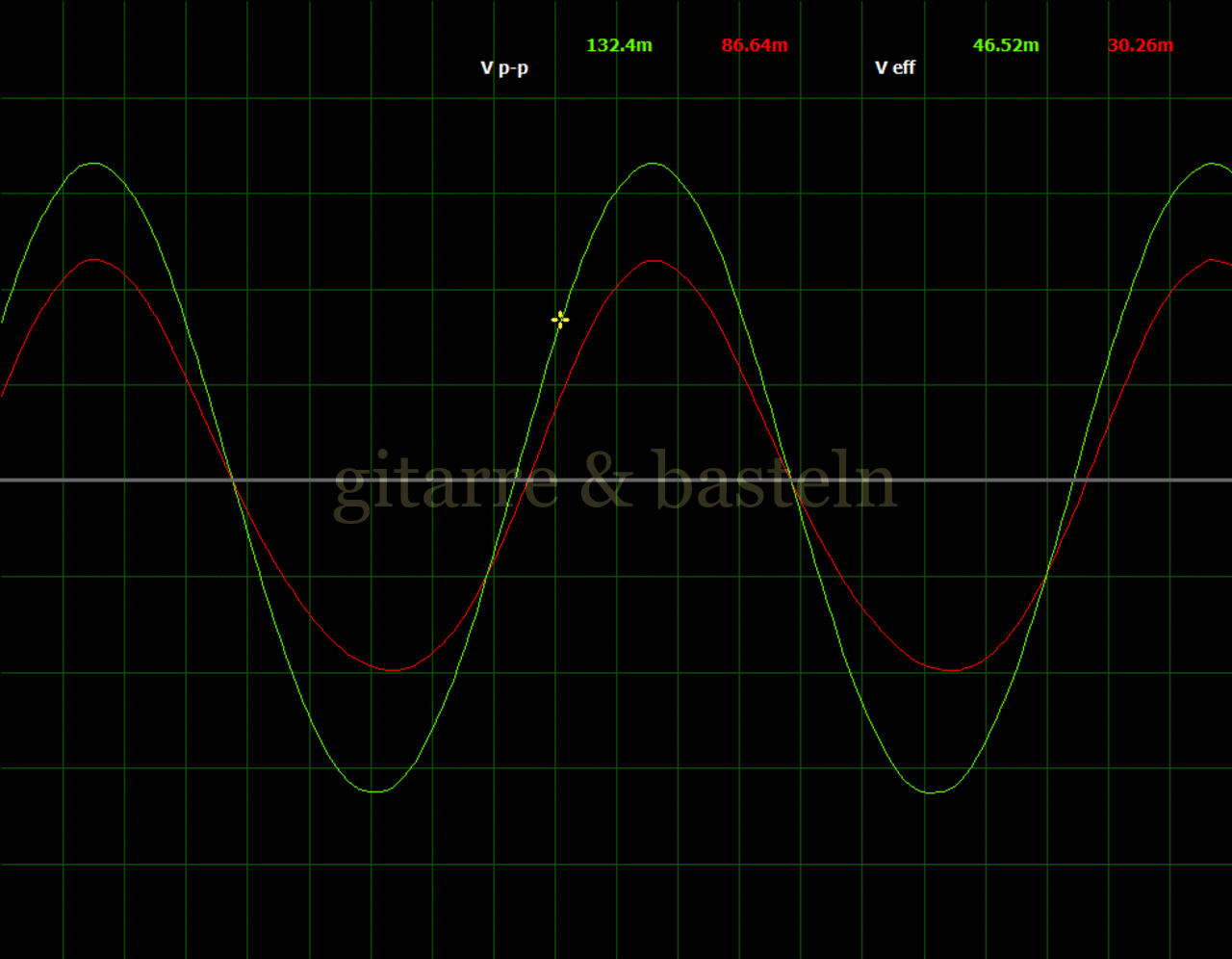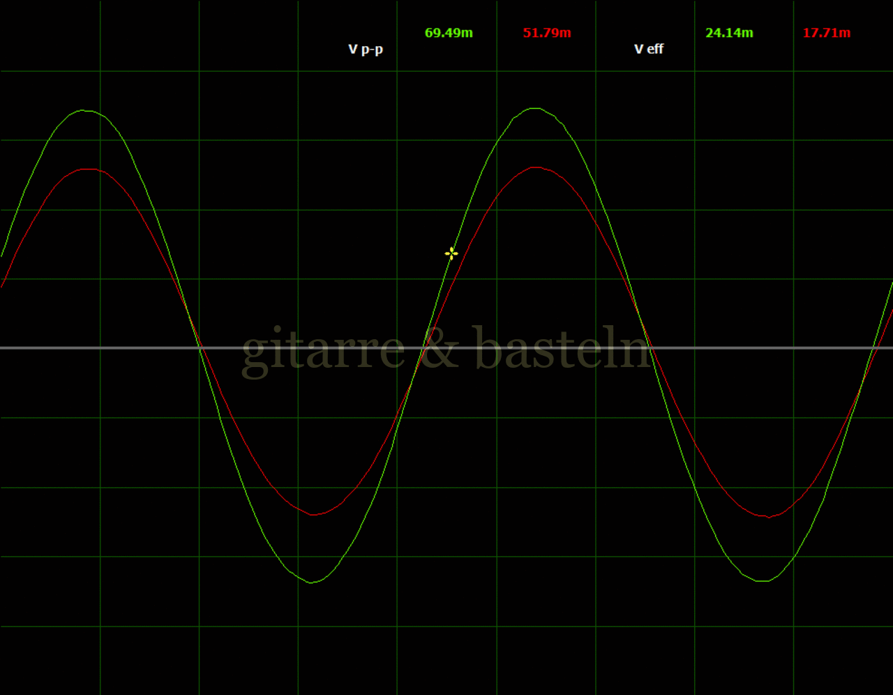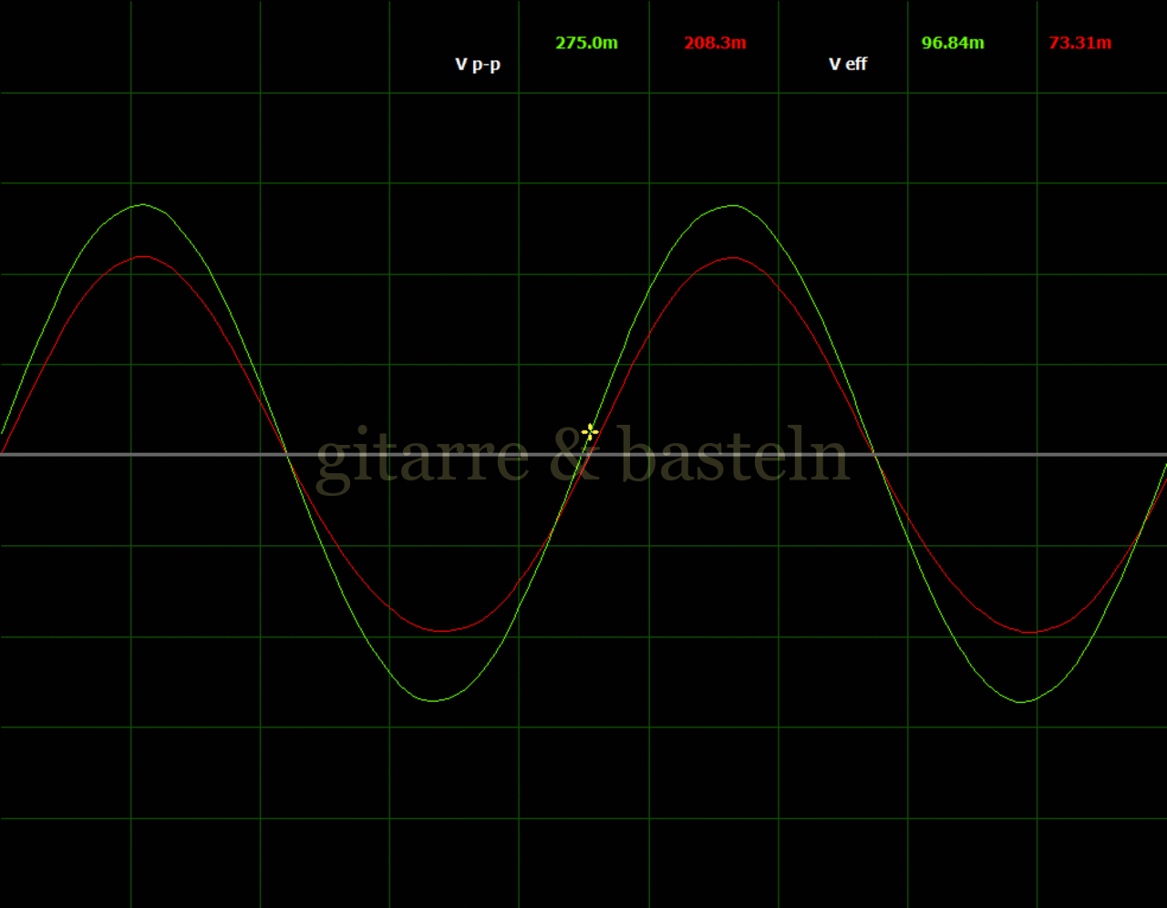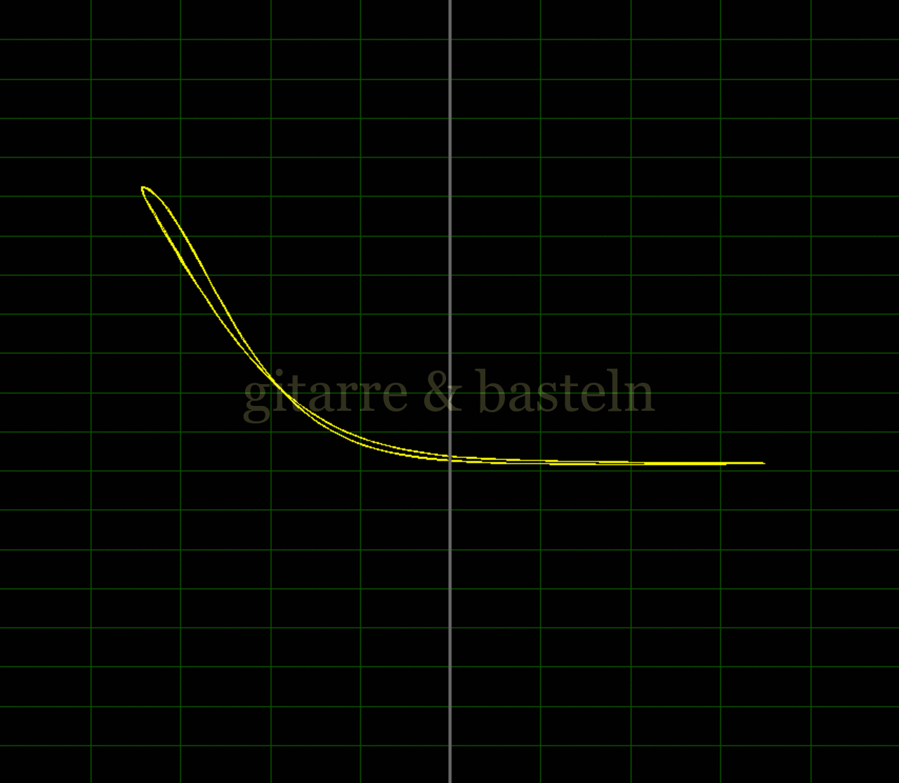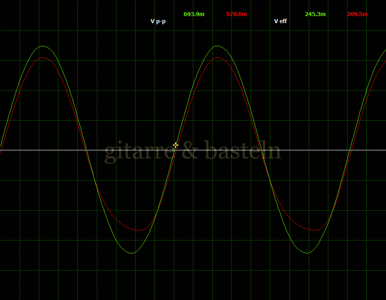 Nun zu den Oszillogrammen und Lissajous-Figuren. Ziel dieser Serie von Messung war ja auch, „einfach mal zu sehen“, wie so eine Treblebooster-Verstärkerstufe mit Germaniumtransistor übersteuert (und ob es ein spezielles „Germaniumverhalten“) gibt und wie das ggfs. aussieht.