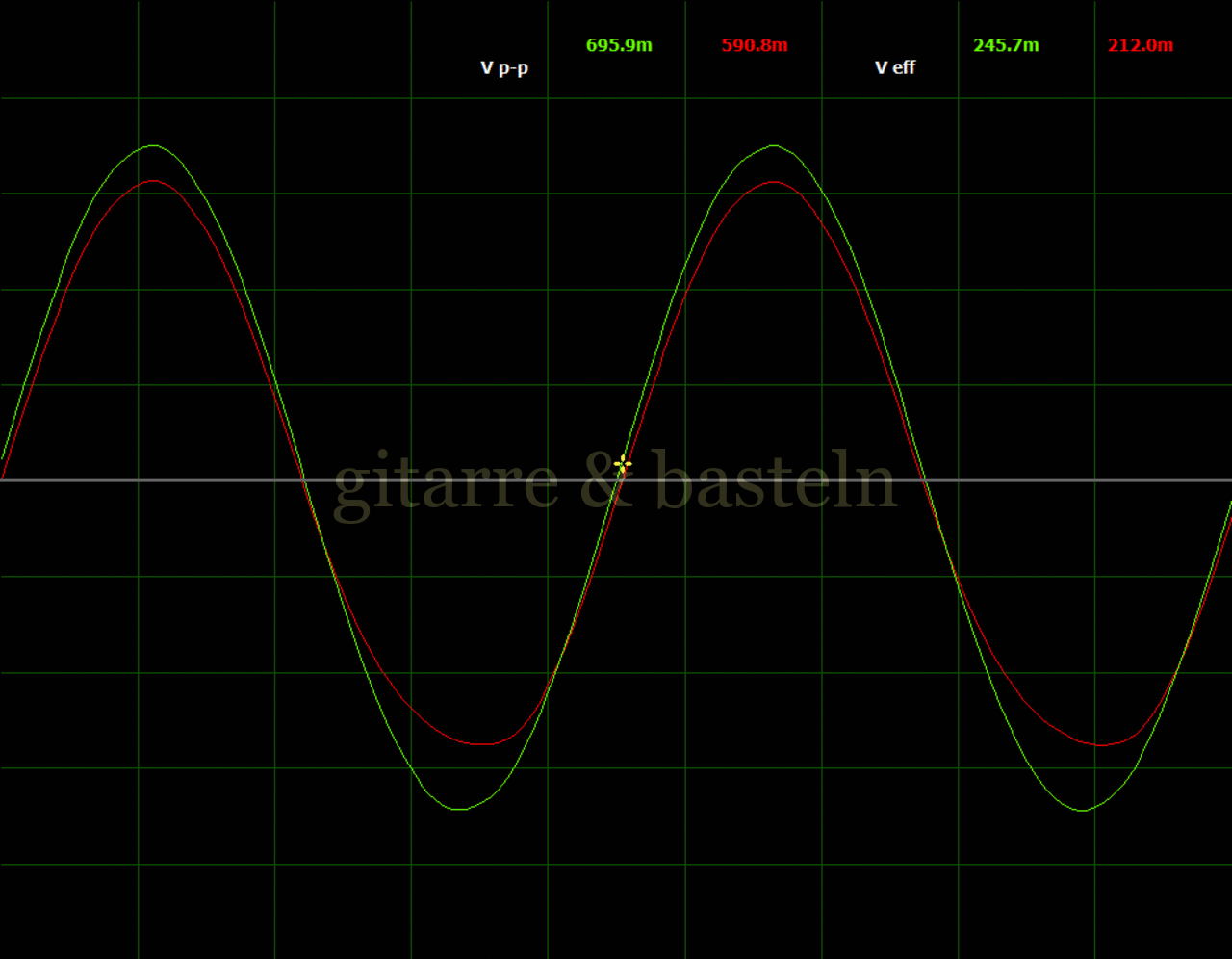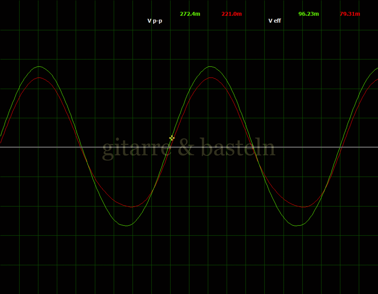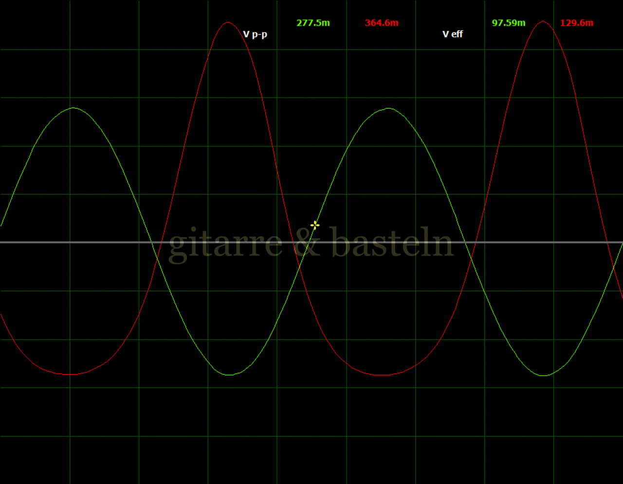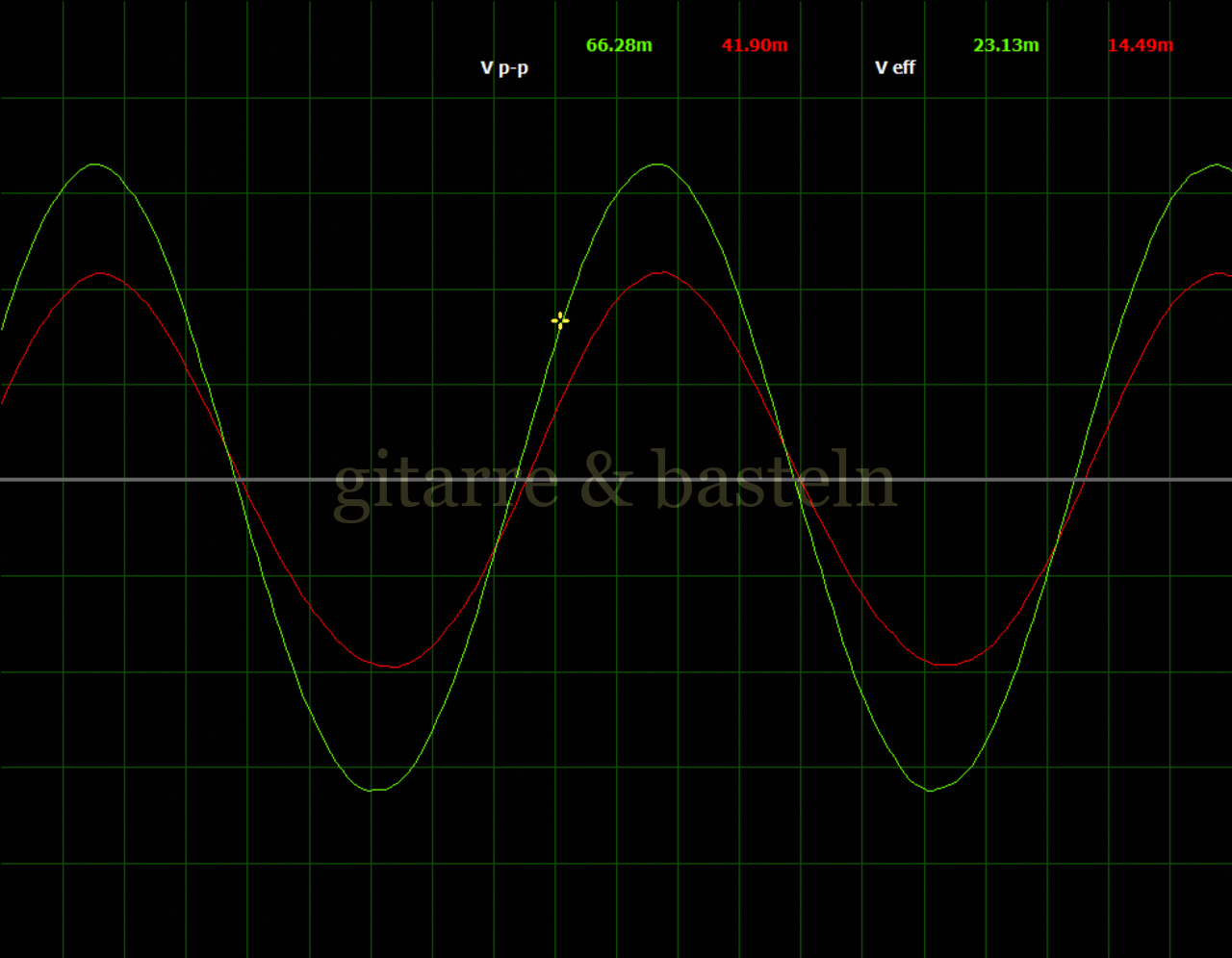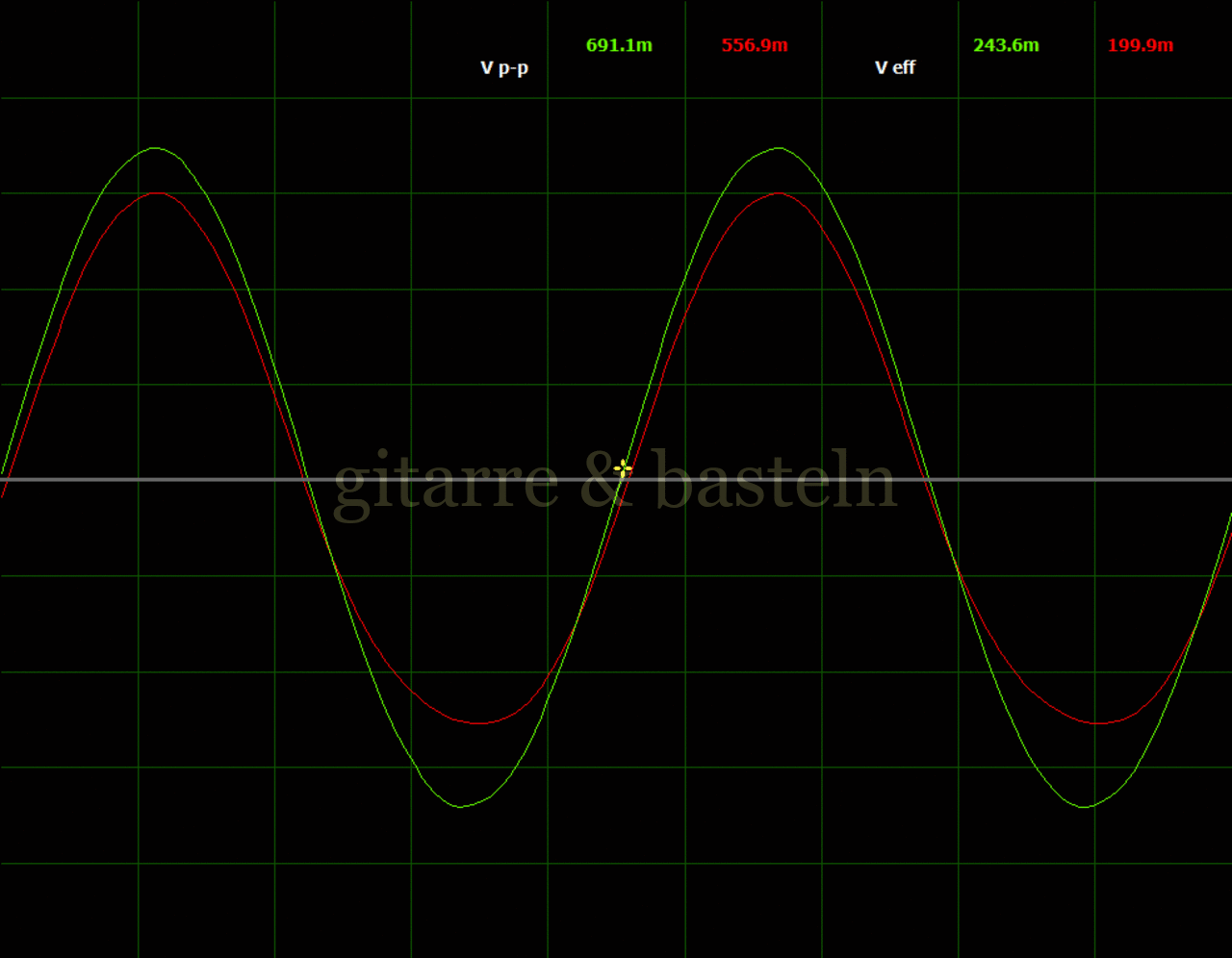 Nun zu den Oszillogrammen und Lissajous-Figuren. Ziel dieser Serie von Messung war ja auch, „einfach mal zu sehen“, wie so eine Treblebooster-Verstärkerstufe mit Germaniumtransistor übersteuert (und ob es ein spezielles „Germaniumverhalten“) gibt und wie das ggfs. aussieht.