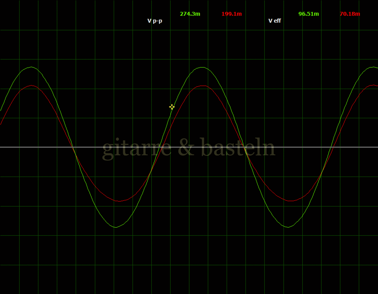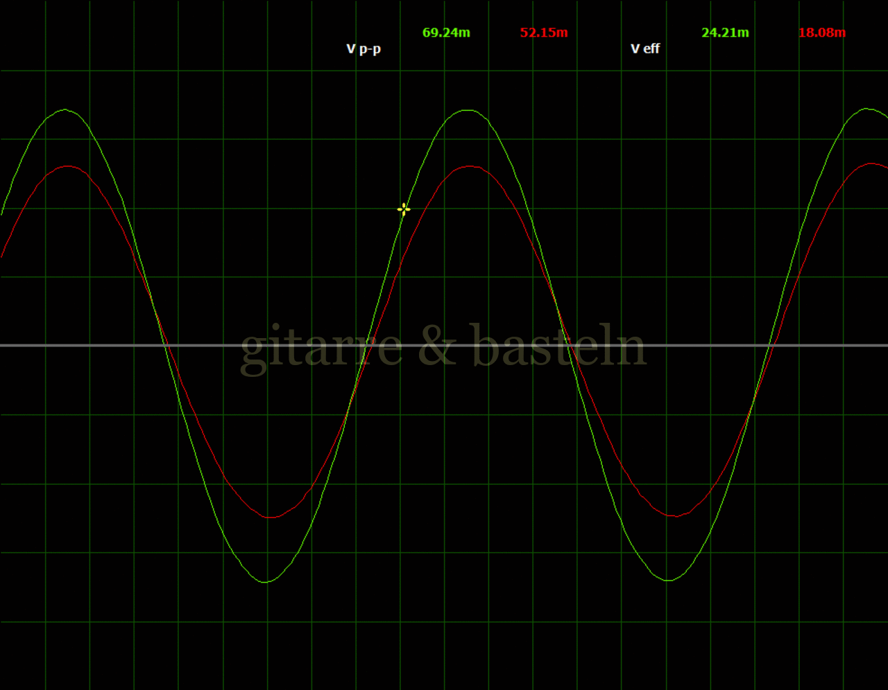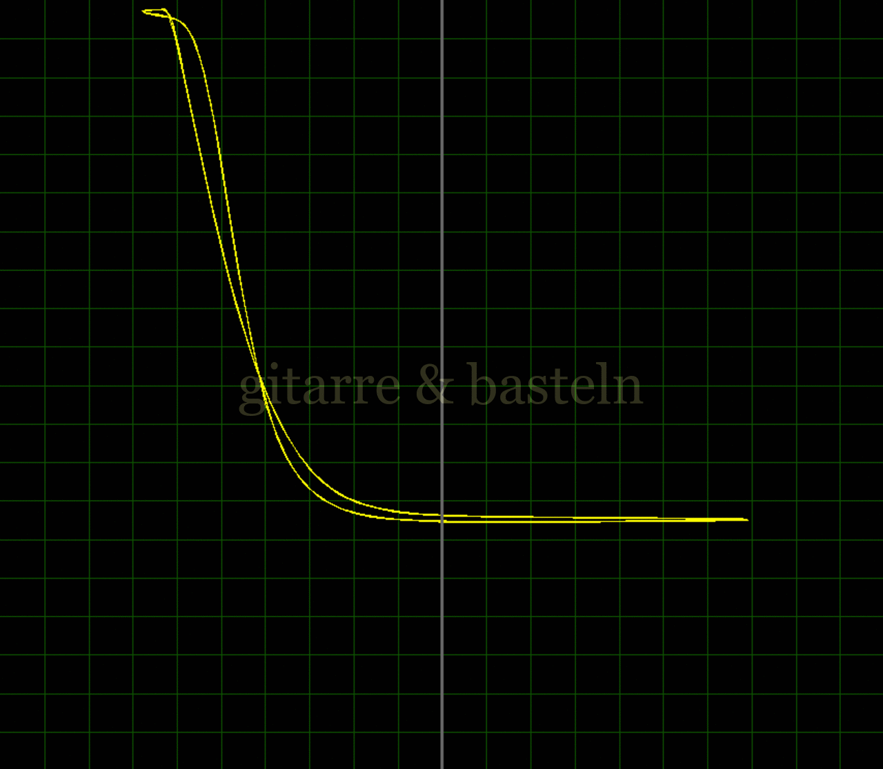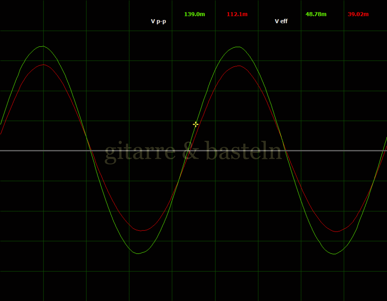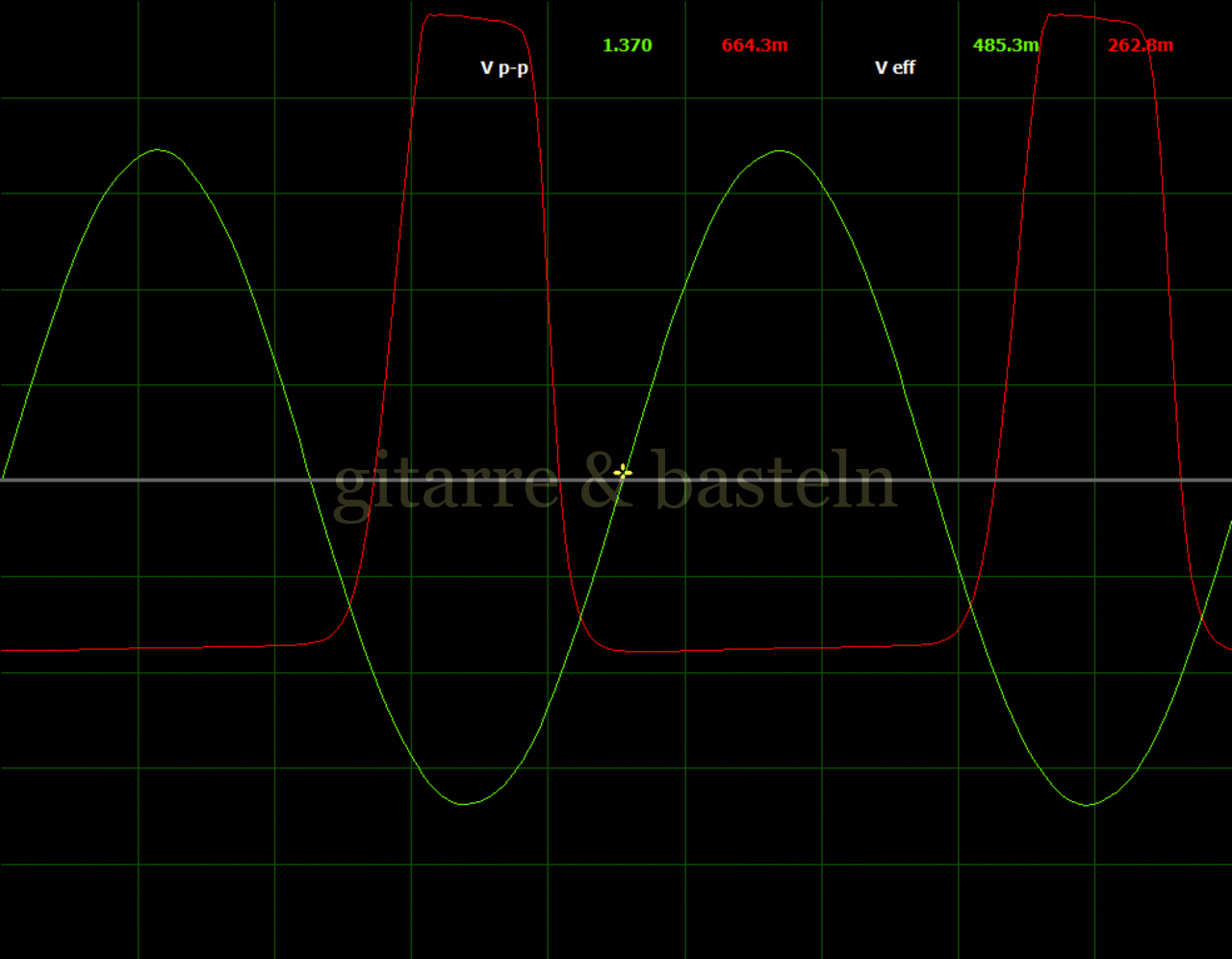 Nun zu den Oszillogrammen und Lissajous-Figuren. Ziel dieser Serie von Messung war ja auch, „einfach mal zu sehen“, wie so eine Treblebooster-Verstärkerstufe mit Germaniumtransistor übersteuert (und ob es ein spezielles „Germaniumverhalten“) gibt und wie das ggfs. aussieht.