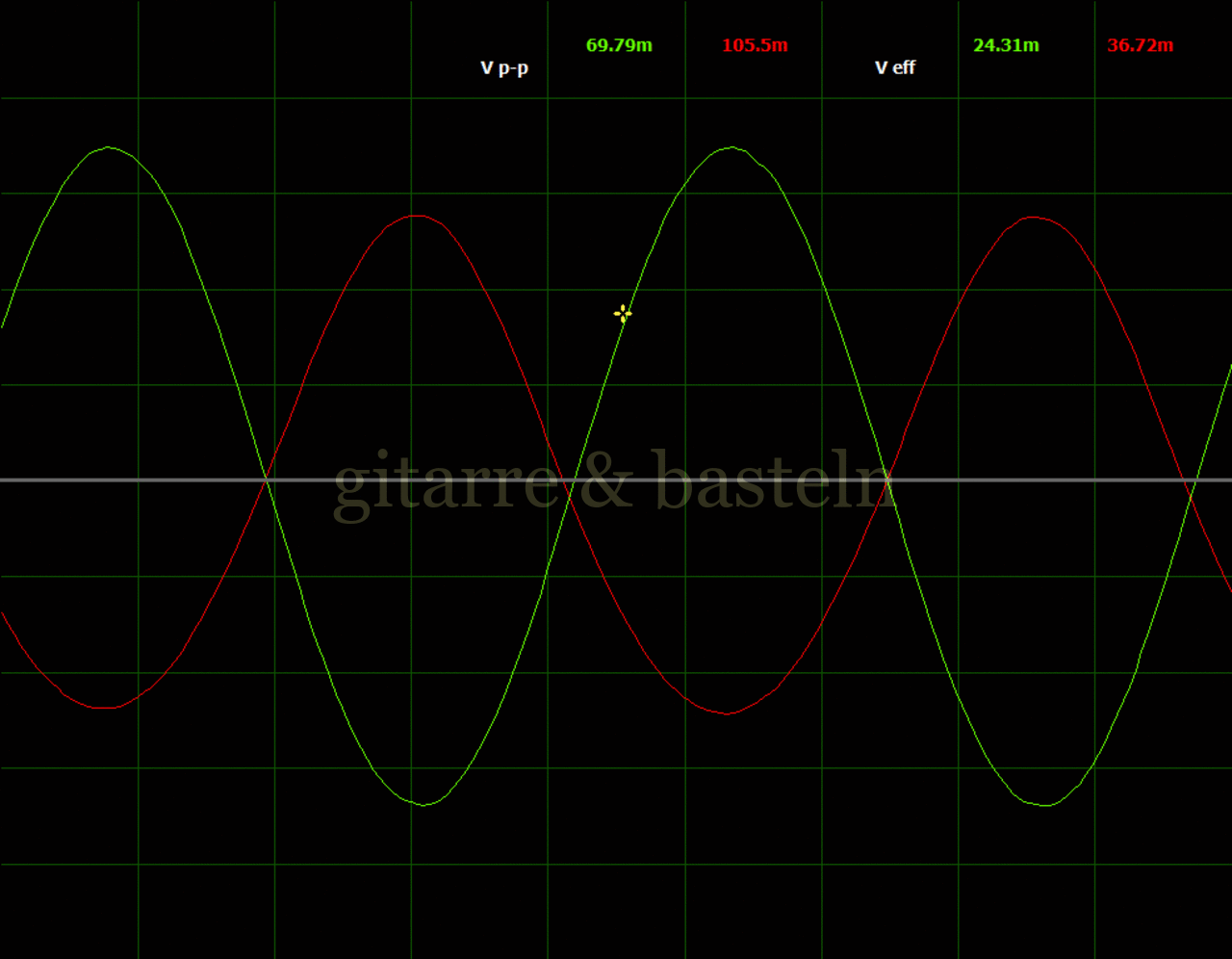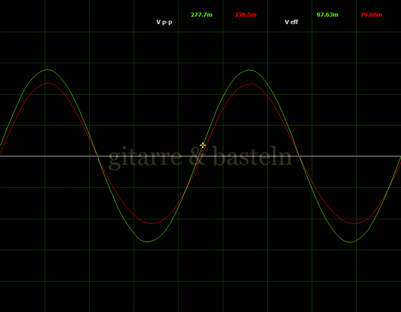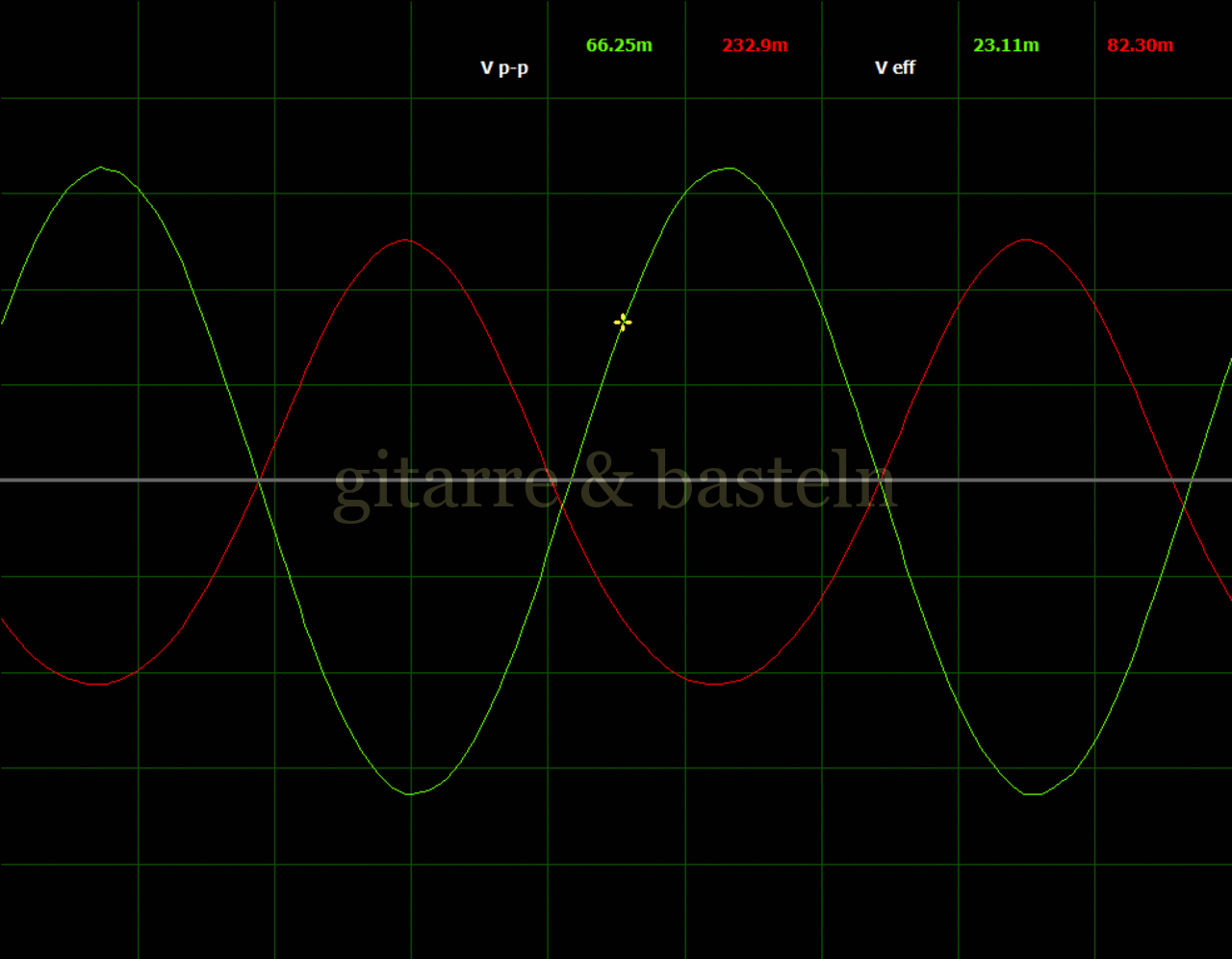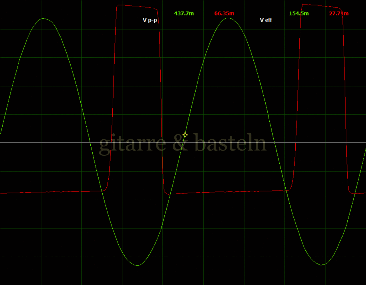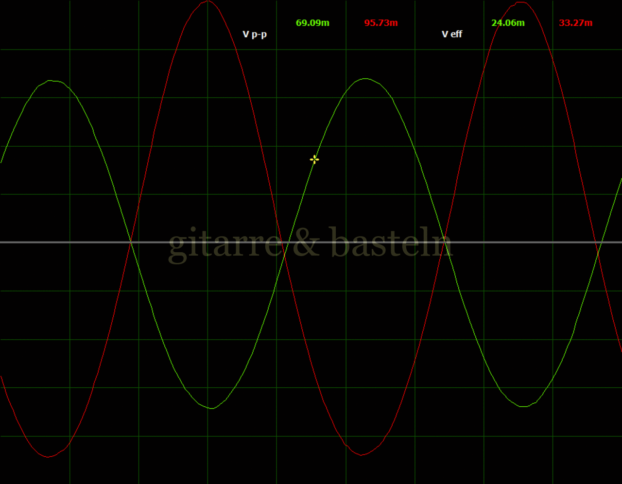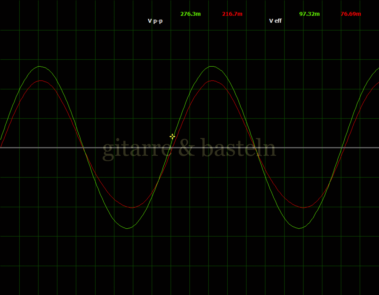 Nun zu den Oszillogrammen und Lissajous-Figuren. Ziel dieser Serie von Messung war ja auch, „einfach mal zu sehen“, wie so eine Treblebooster-Verstärkerstufe mit Germaniumtransistor übersteuert (und ob es ein spezielles „Germaniumverhalten“) gibt und wie das ggfs. aussieht.
