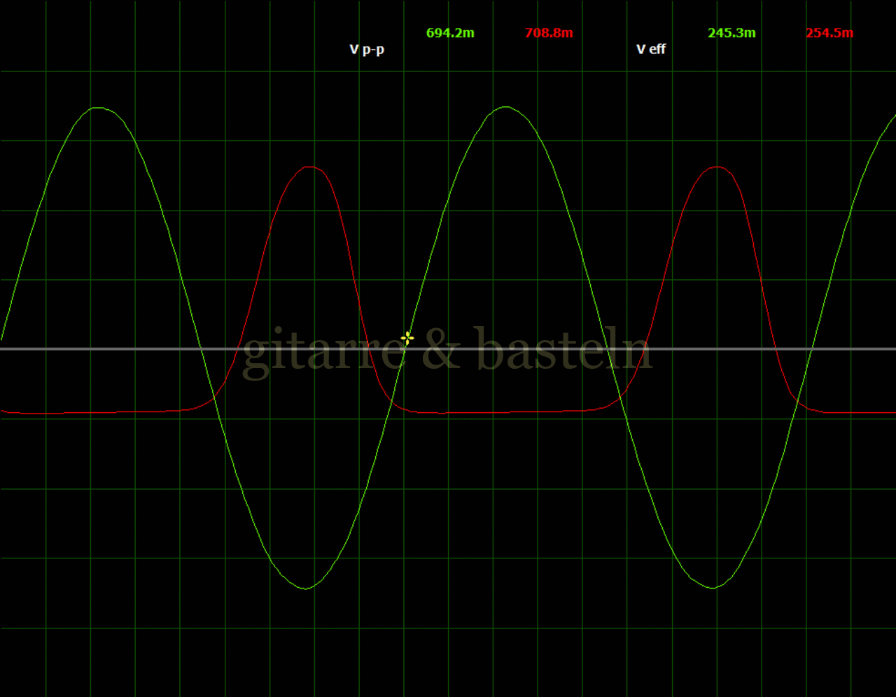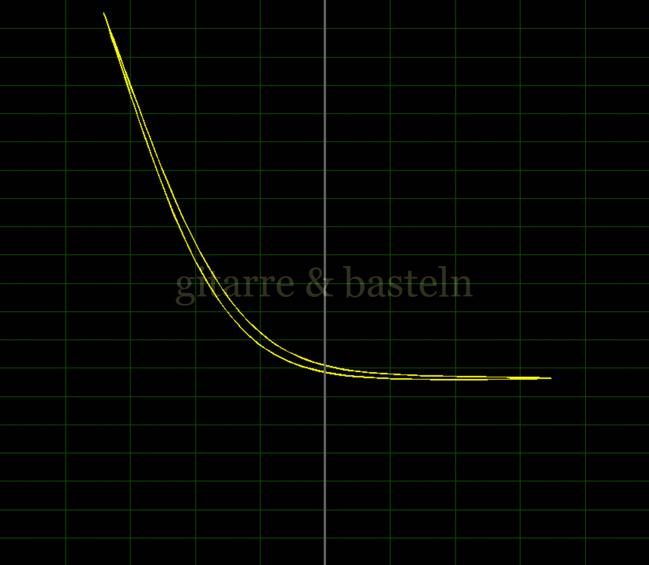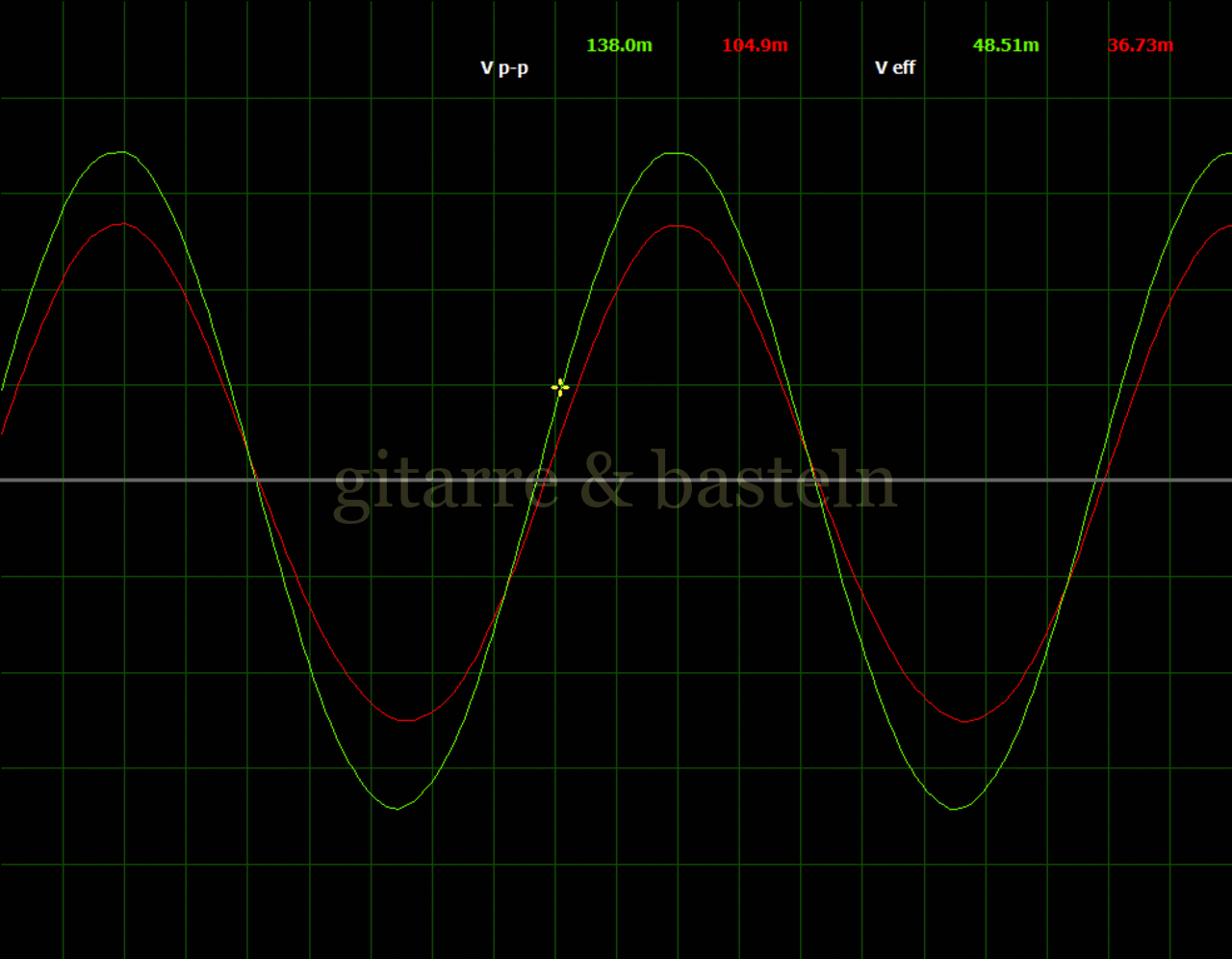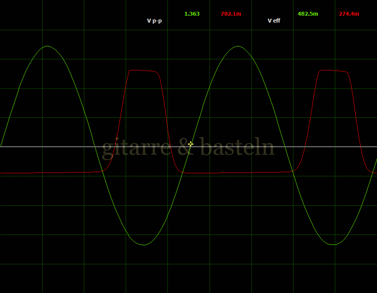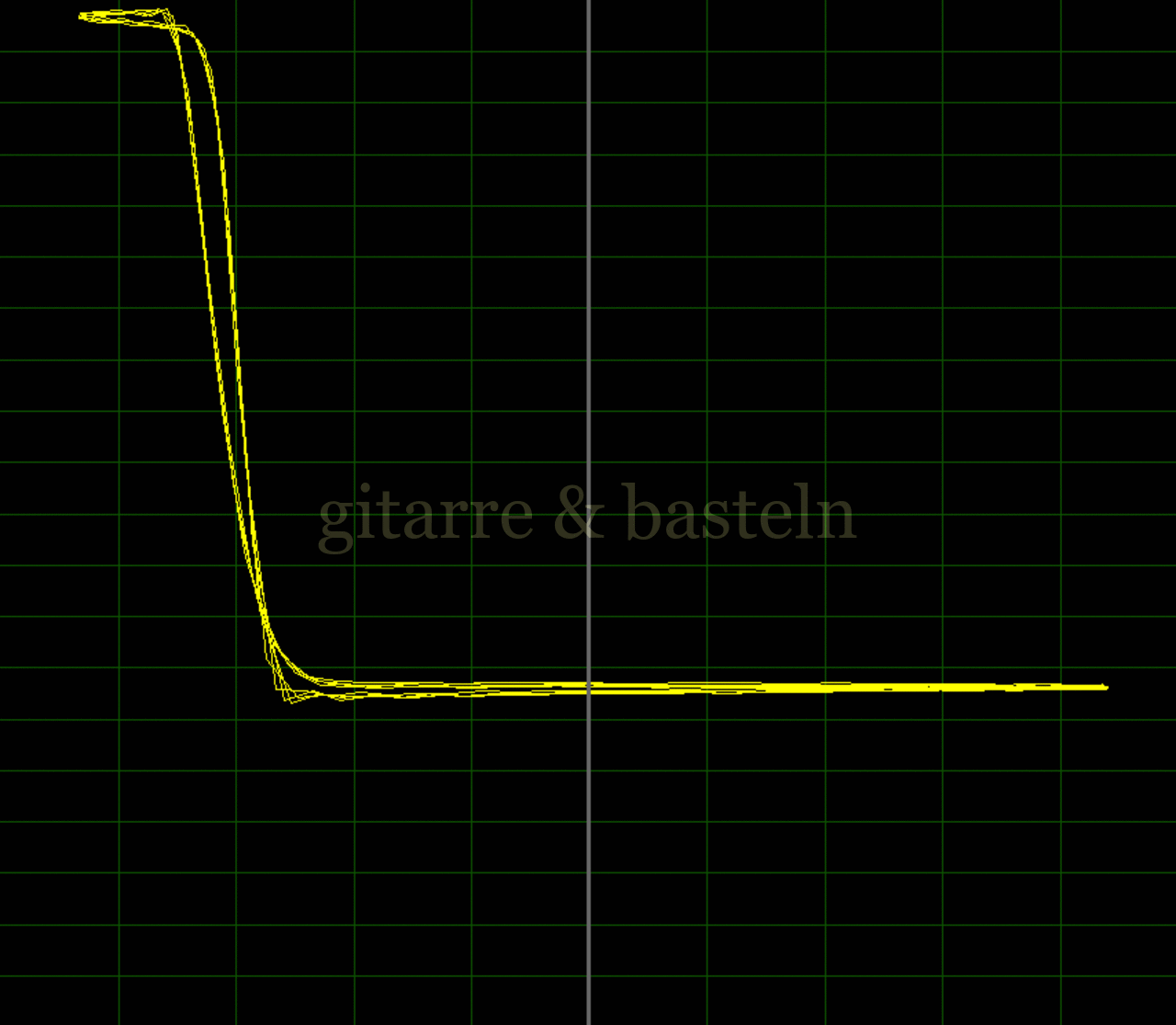 Nun zu den Oszillogrammen und Lissajous-Figuren. Ziel dieser Serie von Messung war ja auch, „einfach mal zu sehen“, wie so eine Treblebooster-Verstärkerstufe mit Germaniumtransistor übersteuert (und ob es ein spezielles „Germaniumverhalten“) gibt und wie das ggfs. aussieht.