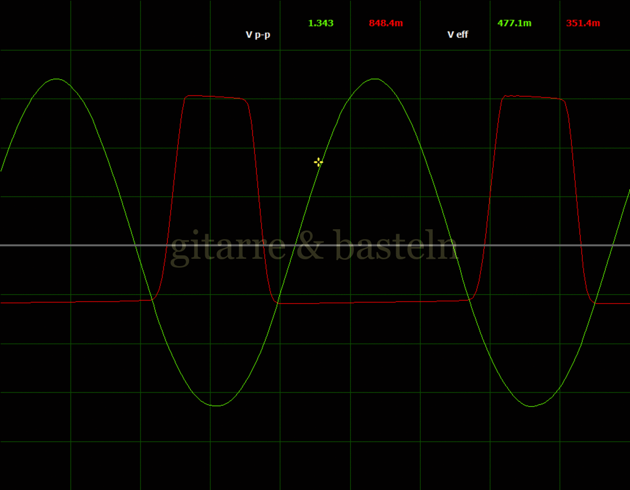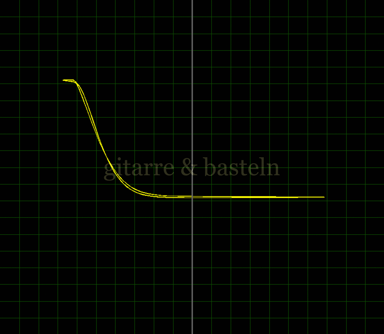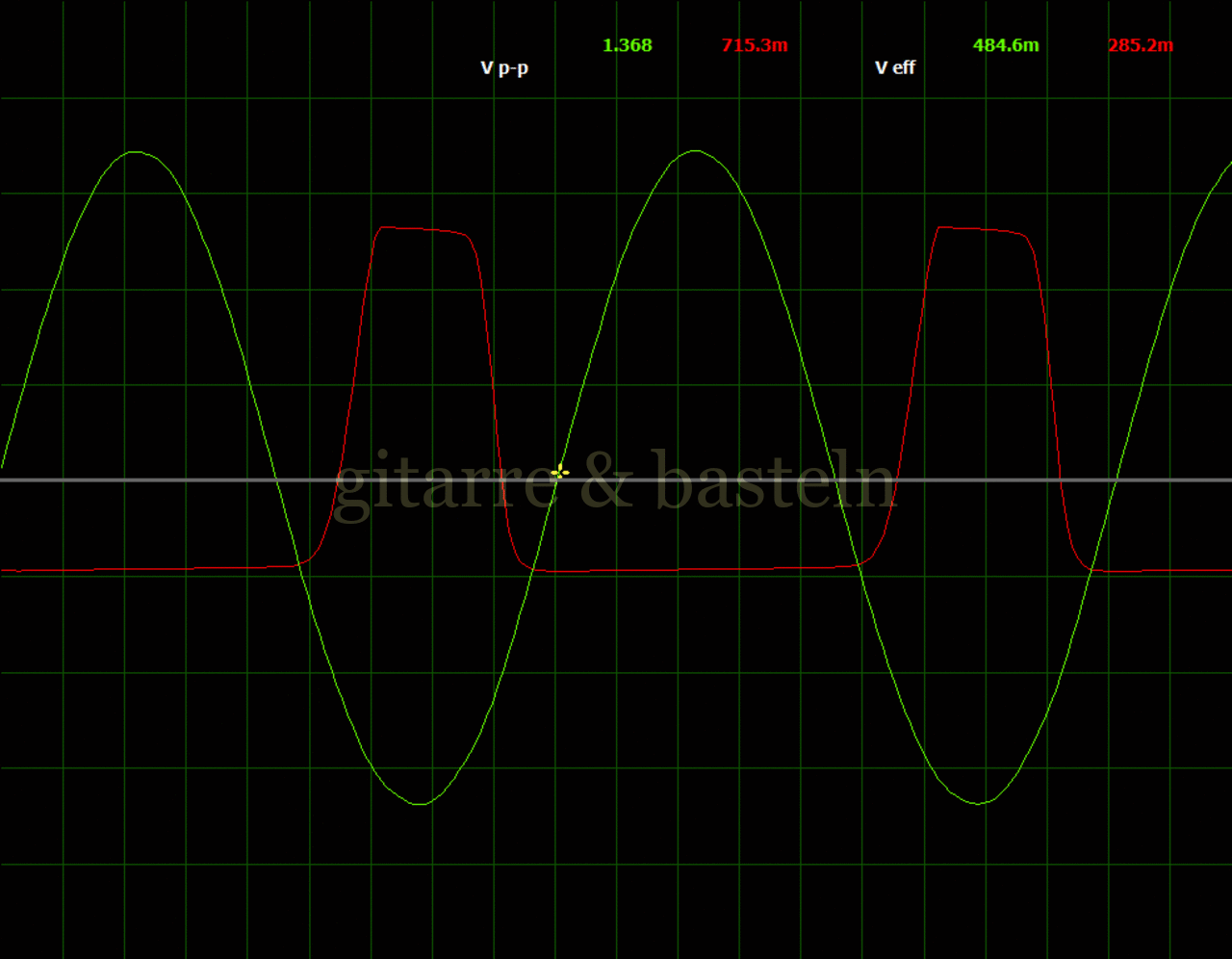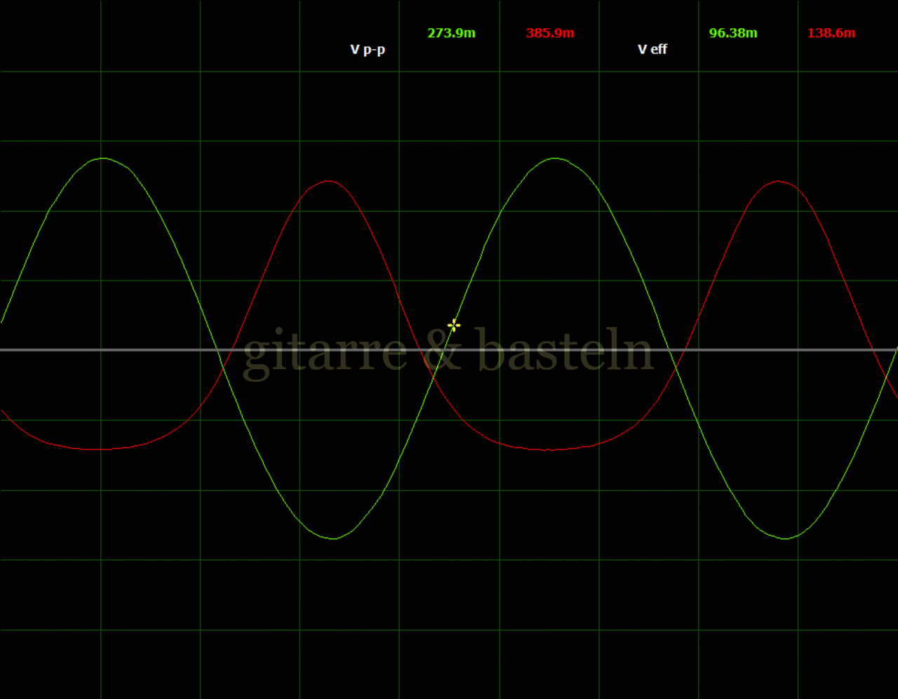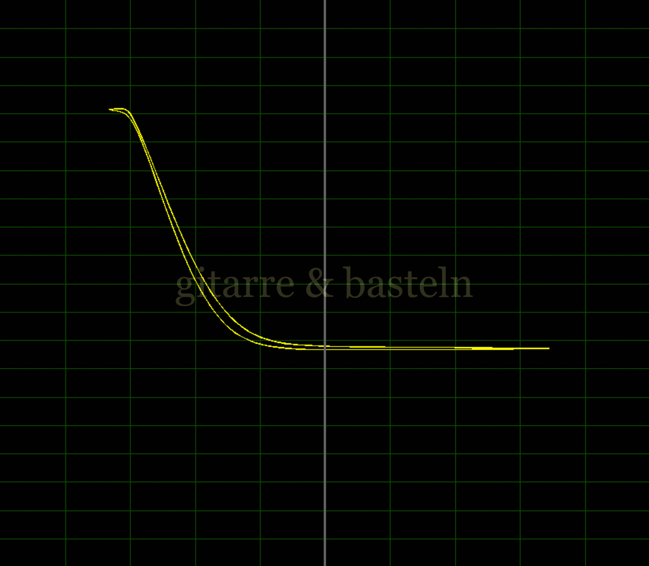 Nun zu den Oszillogrammen und Lissajous-Figuren. Ziel dieser Serie von Messung war ja auch, „einfach mal zu sehen“, wie so eine Treblebooster-Verstärkerstufe mit Germaniumtransistor übersteuert (und ob es ein spezielles „Germaniumverhalten“) gibt und wie das ggfs. aussieht.