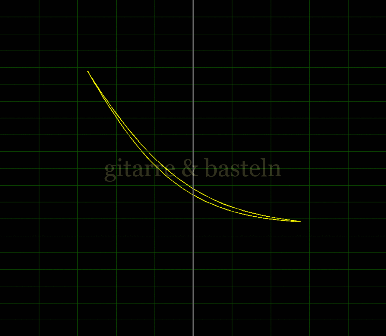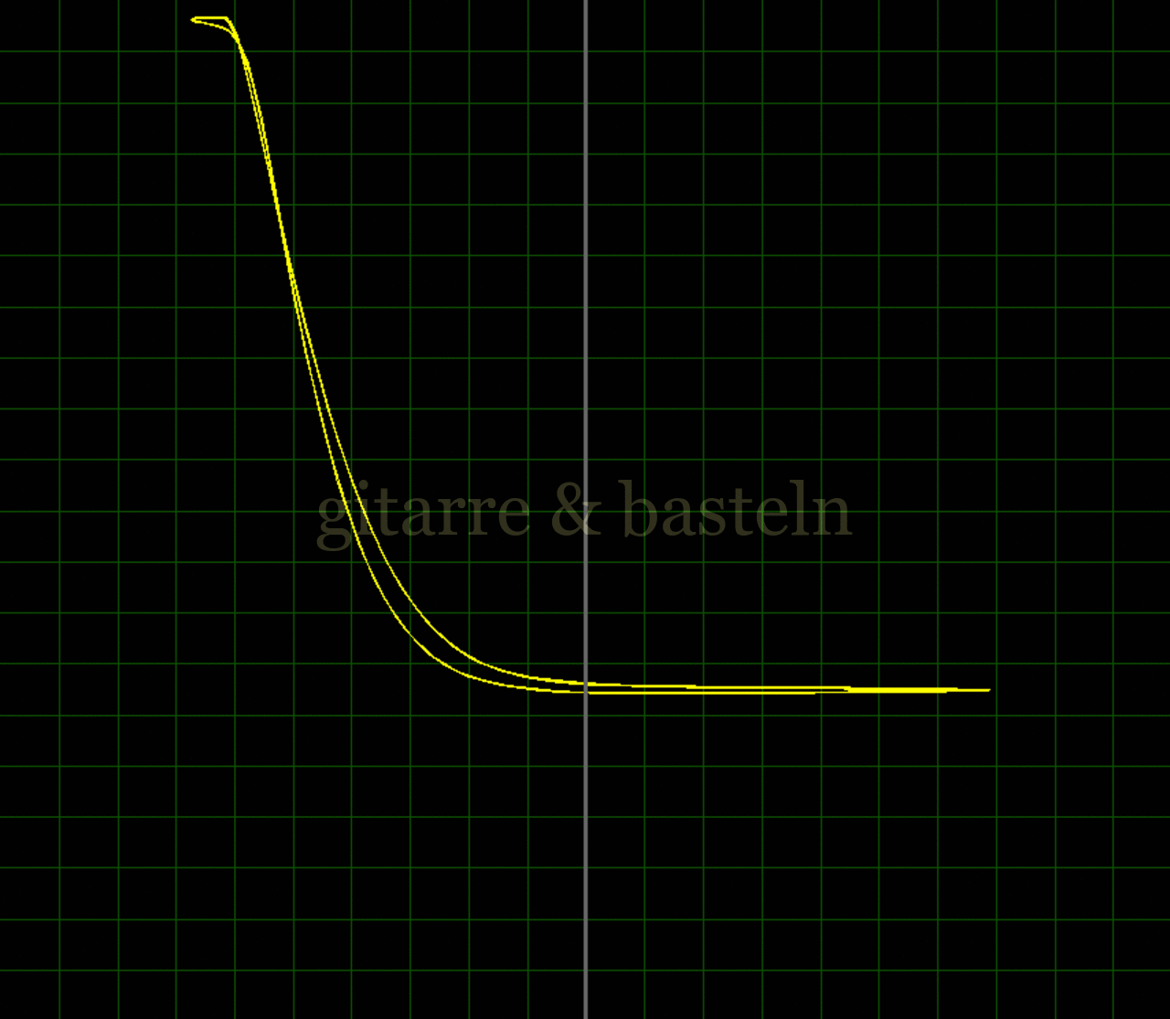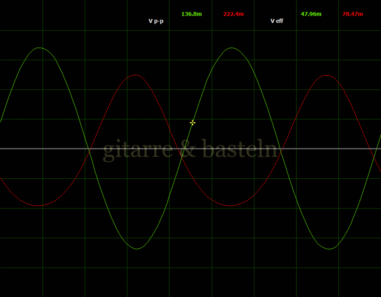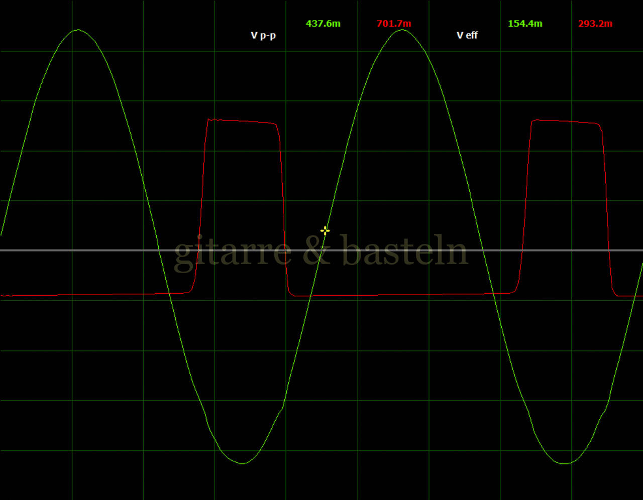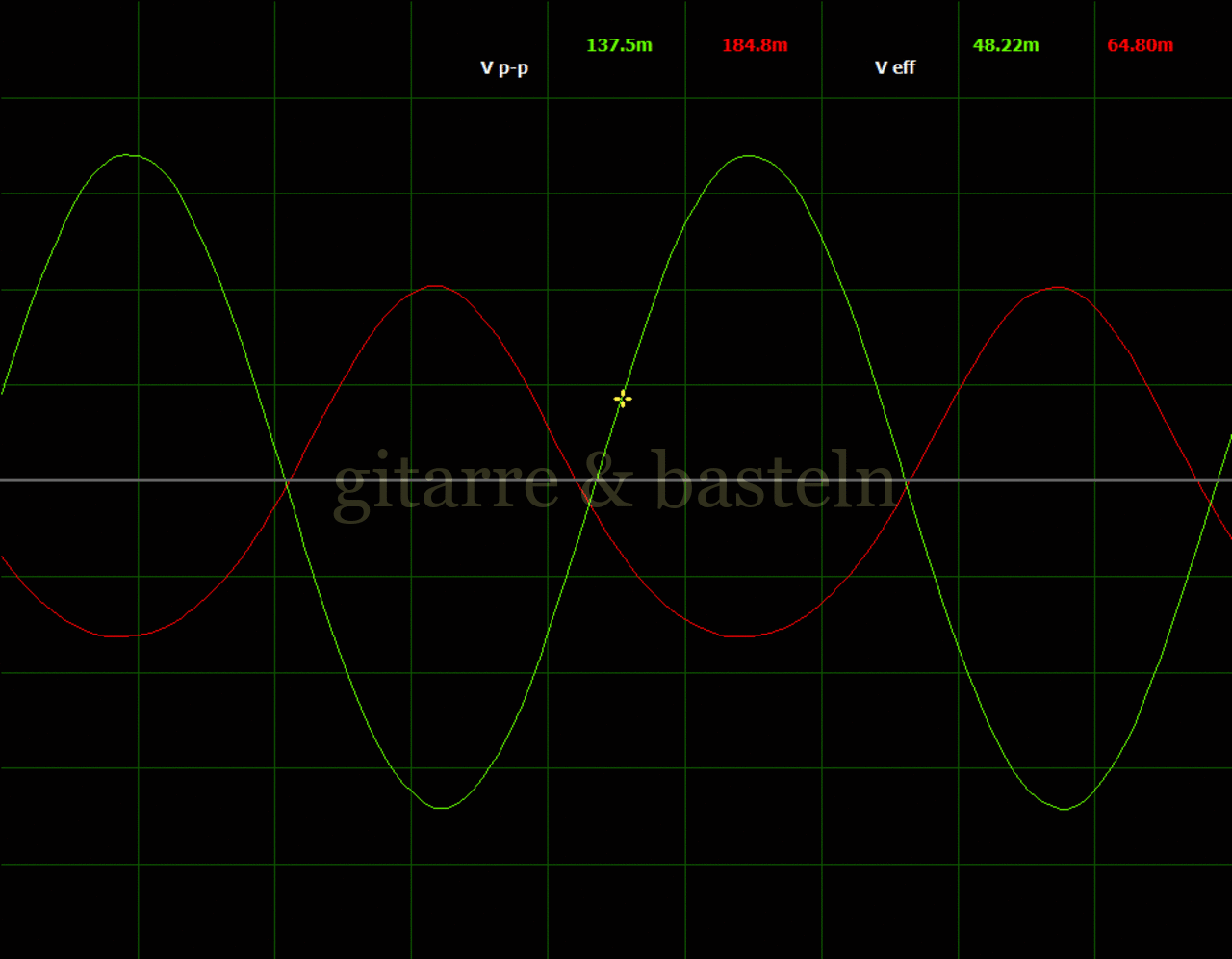 Nun zu den Oszillogrammen und Lissajous-Figuren. Ziel dieser Serie von Messung war ja auch, „einfach mal zu sehen“, wie so eine Treblebooster-Verstärkerstufe mit Germaniumtransistor übersteuert (und ob es ein spezielles „Germaniumverhalten“) gibt und wie das ggfs. aussieht.