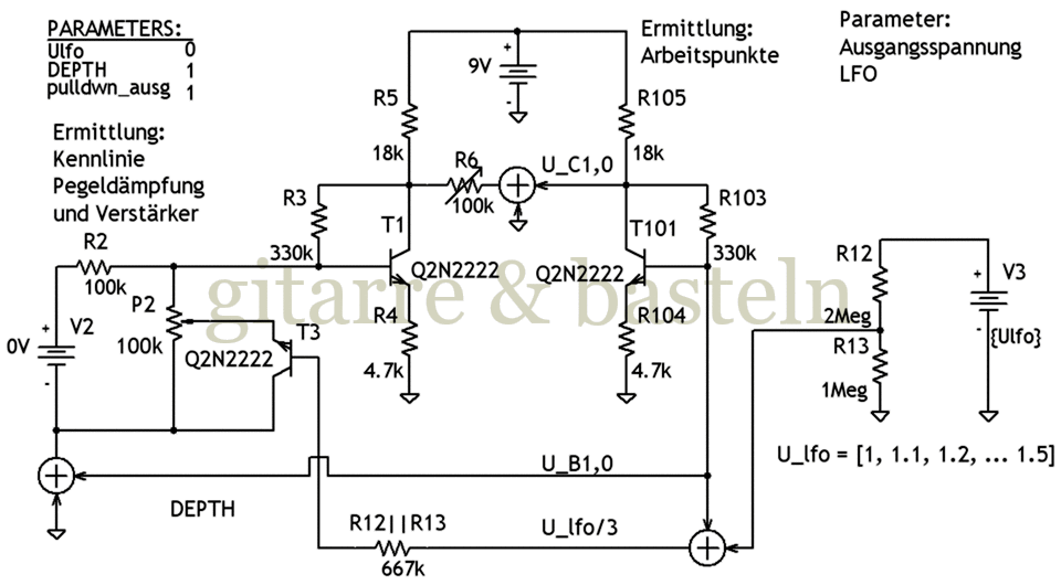 Diesem Prinzip folgend liegt auch die gesamte Eingangsschaltung mit R2 und dem Depth-Regler einschließlich des Emmitters von T3 nicht, wie in der Originalschaltung, auf Masse, sondern auf dem Potential der Basisruhespannung von T1. Die Steuerspannung an der Basis von T3, d. h. die momentane Ausgangsspannung des LFO wird ebenfalls um die Basisruhespannung von T1 verschoben.