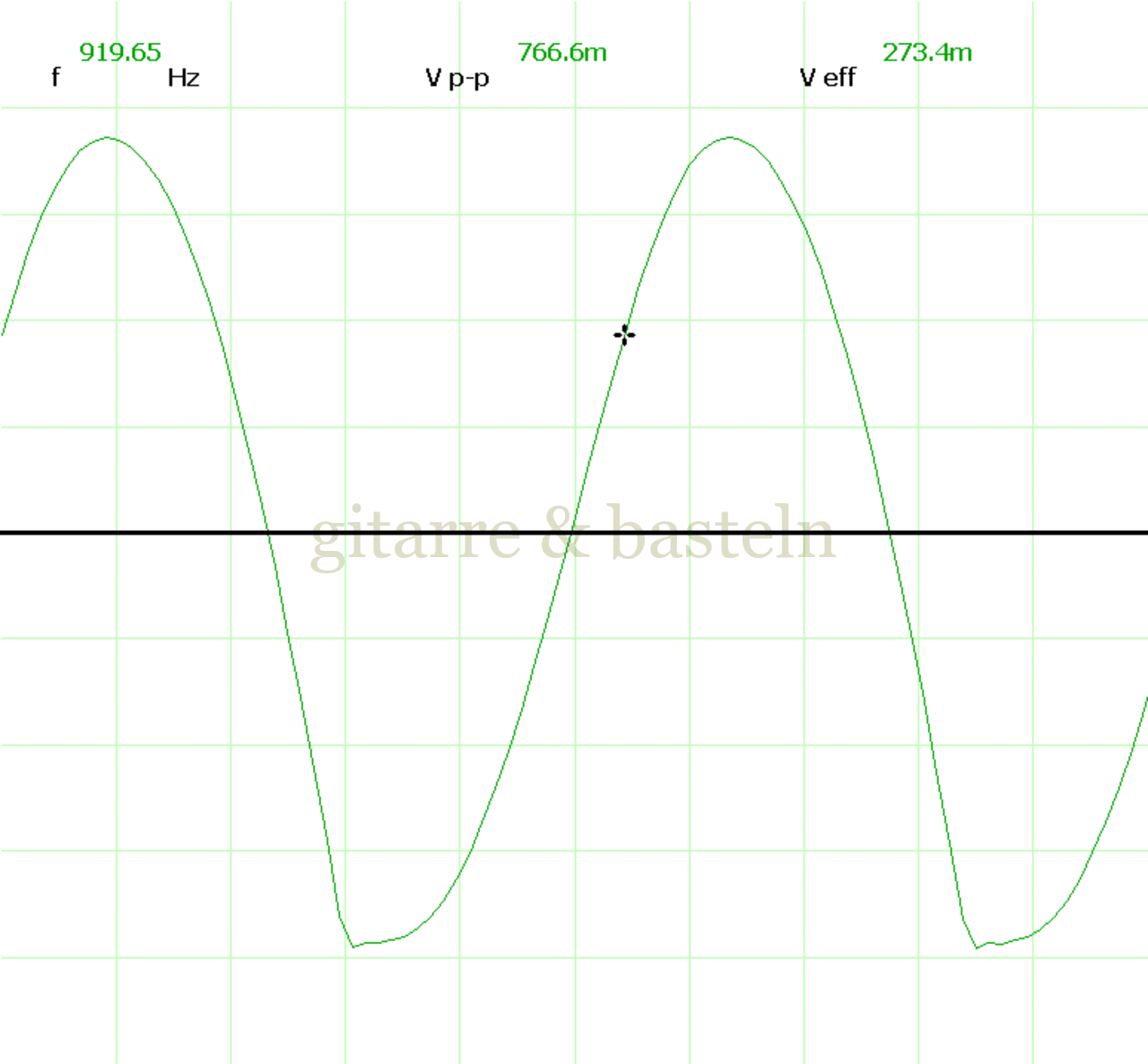 Die letzte Darstellung des Zeitsignals (siehe folgende Abbildung 20) dient der Kontrolle der Kurvenformen – die Kurvenform ist grob sinusförmig, jedoch ist die hart fallende Flanke in allen Graphen zu finden. Diese hart fallende Flanke ist allerdings für den Klangcharakter des Colorsound-Tremolos ohne Bedeutung – das Ausgangssignal des LFO wird über einen Kondensator abgetrennt und nur die obere Halbwelle des LFO-Signals führt überhaupt zu einer Änderung des Audiosignals.