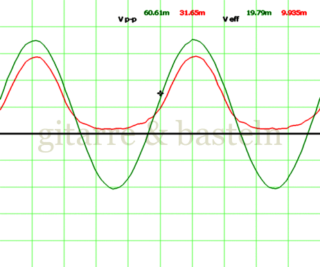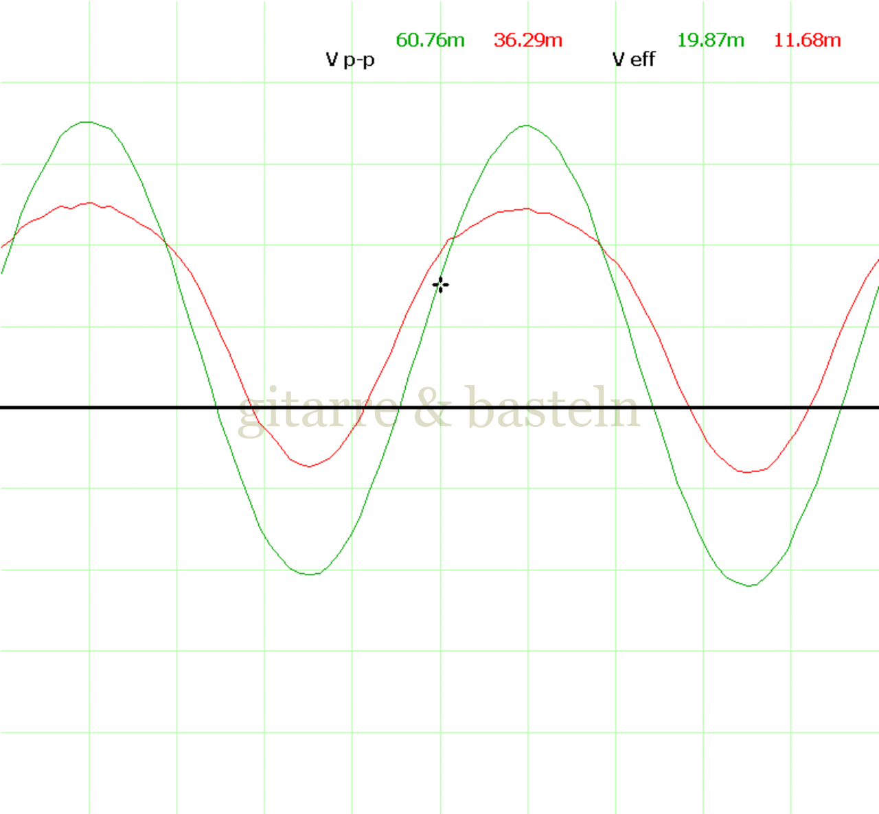 Das bedeutet, rein rechnerisch hat das Gerät ohne Tremolo-Funktion einen geringen Verlust an Gain. Versuchsweise wurde die überschlägige Berechnung mit einem R6 von 1 MΩ (anstatt 100 kΩ) wiederholt: