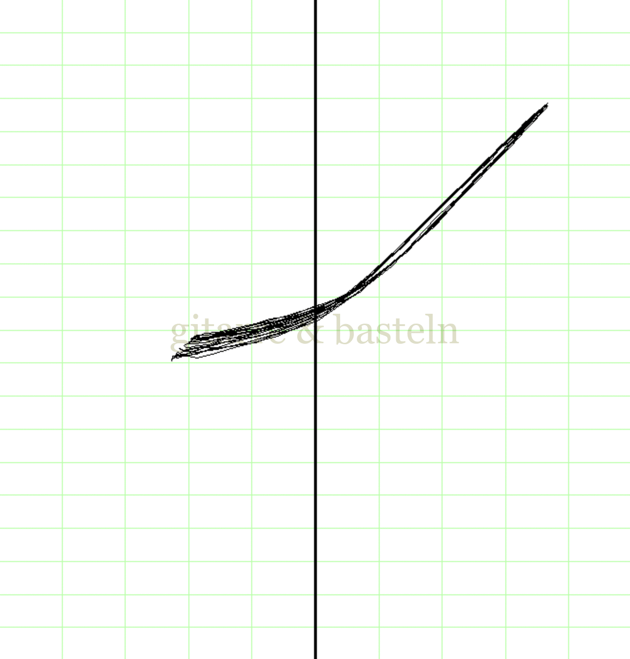Interessant ist hier zunächst der Kennlinienbereich um den Mittelpunkt (Nullpunkt) der x-Achse – das Eingangssignal von maximal einigen hundert Millivolt bewegt sich im Bereich um die senkrechte Mittelachse des Diagramms. Die Übertragungskennlinien treffen sich alle in diesem Punkt [ 0 0 ], allerdings mit unterschiedlicher Steilheit, d. h. bei verschiedenen Werten für Ulfo ergeben sich tatsächlich unterschiedliche Lautstärken – das Tremolo funktioniert also für kleine Signalpegel. Interessant sind hier insbesondere die Kennlinien für Ulfo = 1 V (grün), Ulfo = 1,5 V (rot) und Ulfo = 2 V (grau).